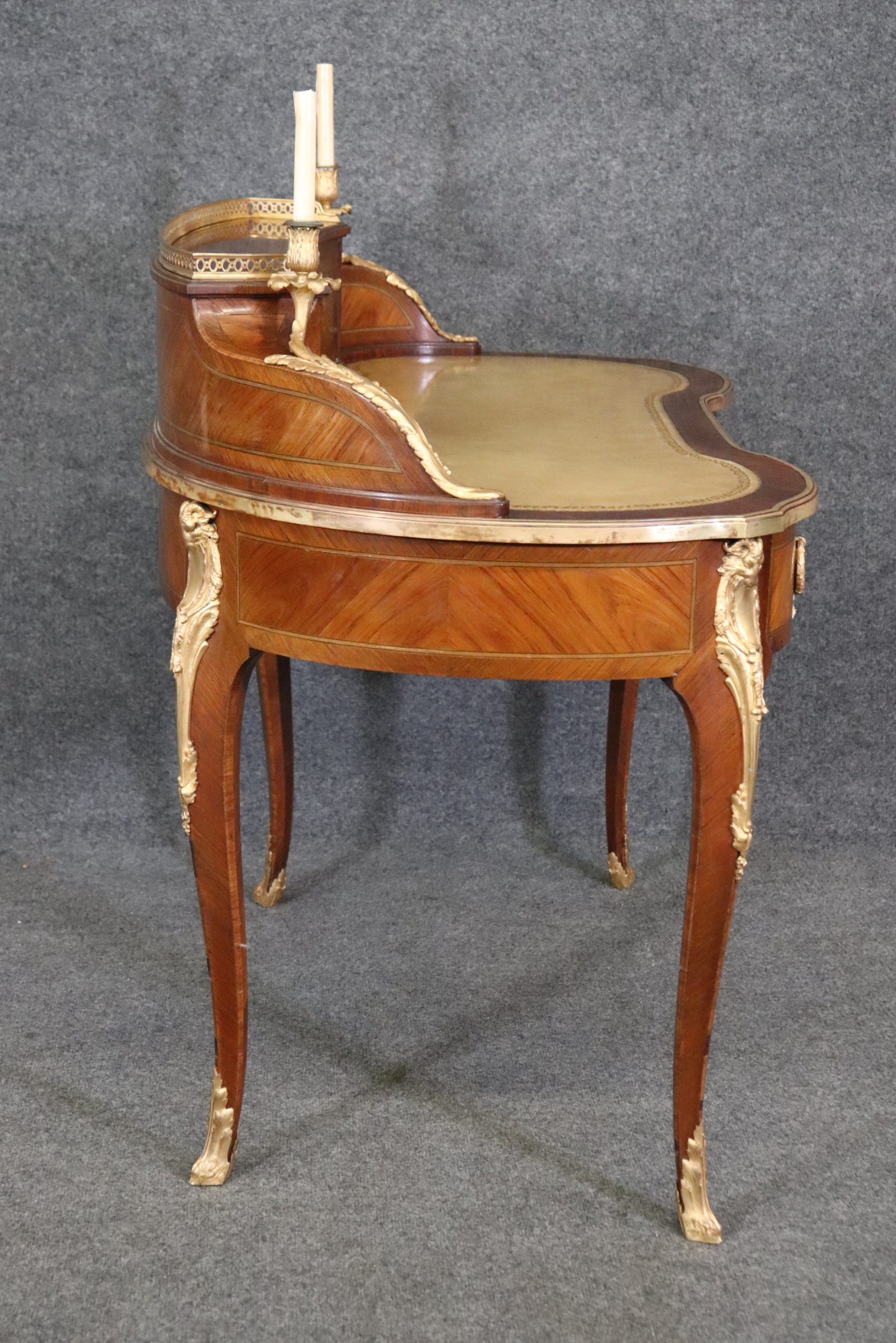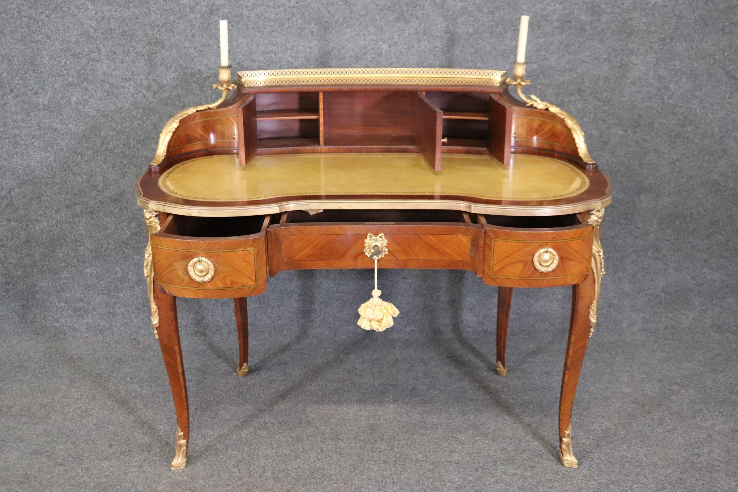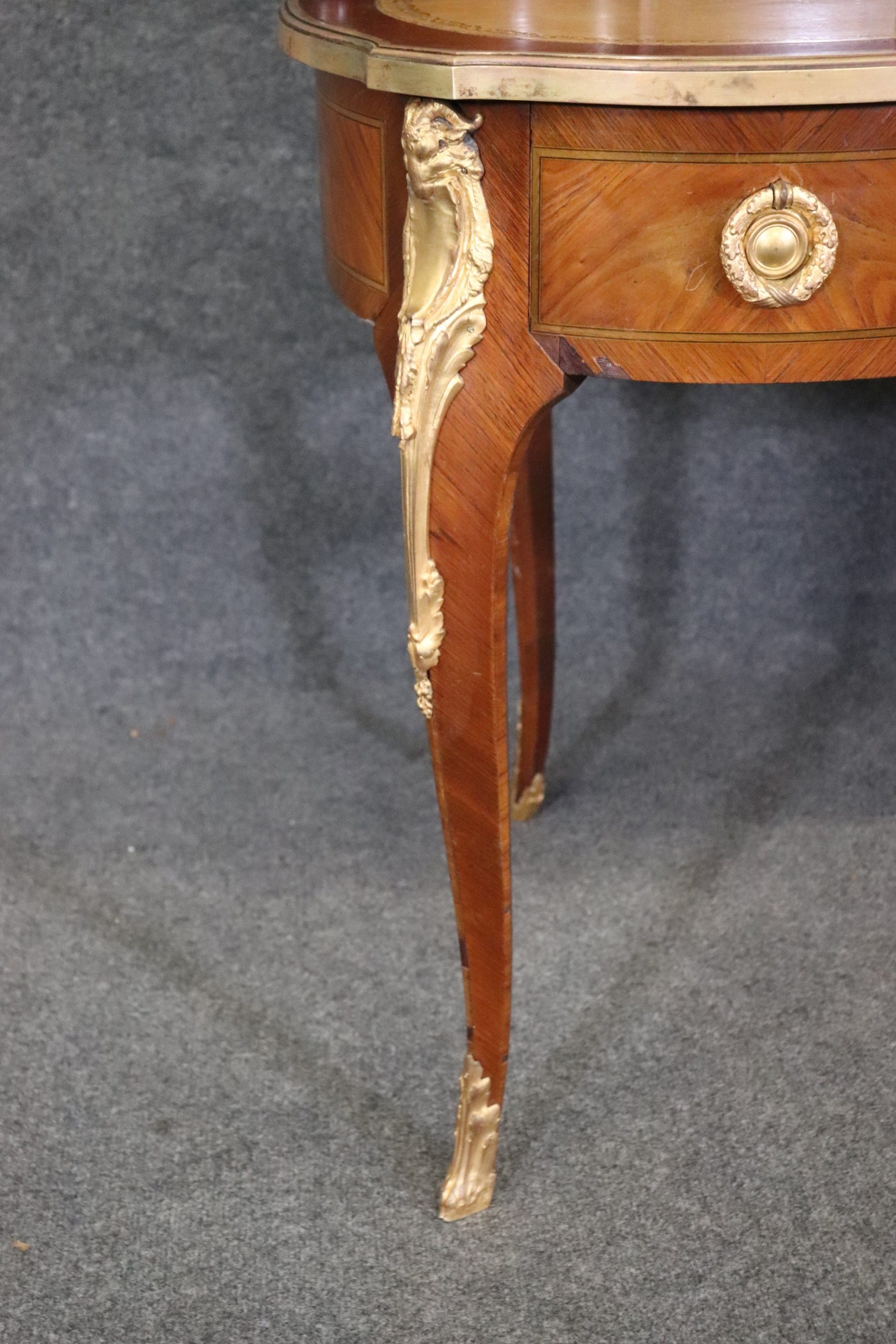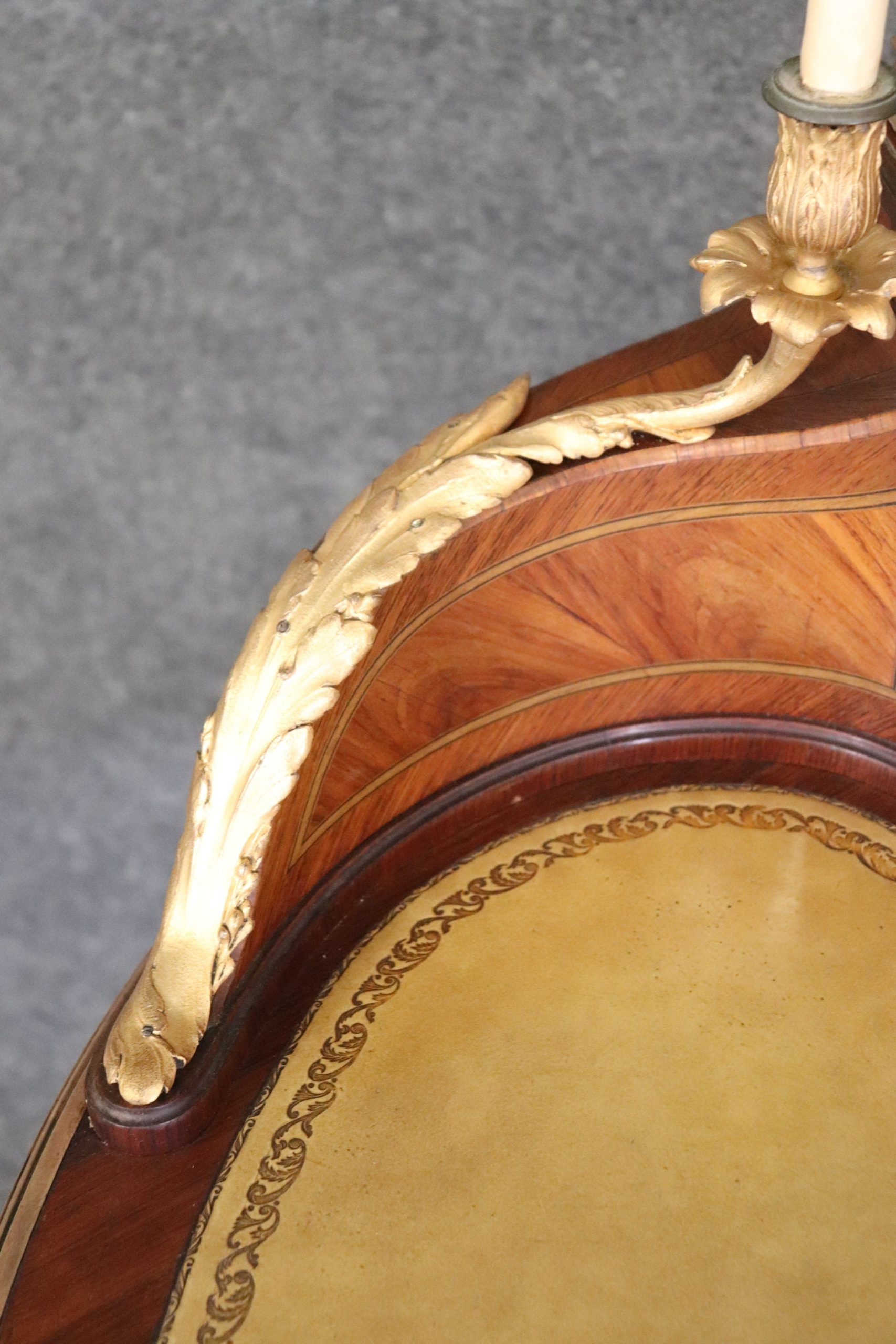 This Louis XV style late 19th century leather top cartonnier desk is made of the highest quality. This desk is a great opportunity to own something of museum quality that will hold its value and can be passed down through your families generations. If you look at the photos provided, you will see the elaborate ormolu mounts as well as the embossed leather top surface. The desk is also equipped with 3 drawers in the front and 3 storage compartments on the top. The center drawers has a lock making it perfect for storing away any important belongings. This is a perfect conversation piece for your next gathering and due to its nice proportions can be used in any entryway, living room, office or place of your choosing! One nice feature of this desk is that even though its aesthetically pleasing it can also be used functionally on a day to day basis all while bringing a sense of luxury and class into your home! This cartonnier desk is in good antique condition with normal age related chips, minor finish loss and some light surface scratching as to be expected with an item of this age. Otherwise in good condition.