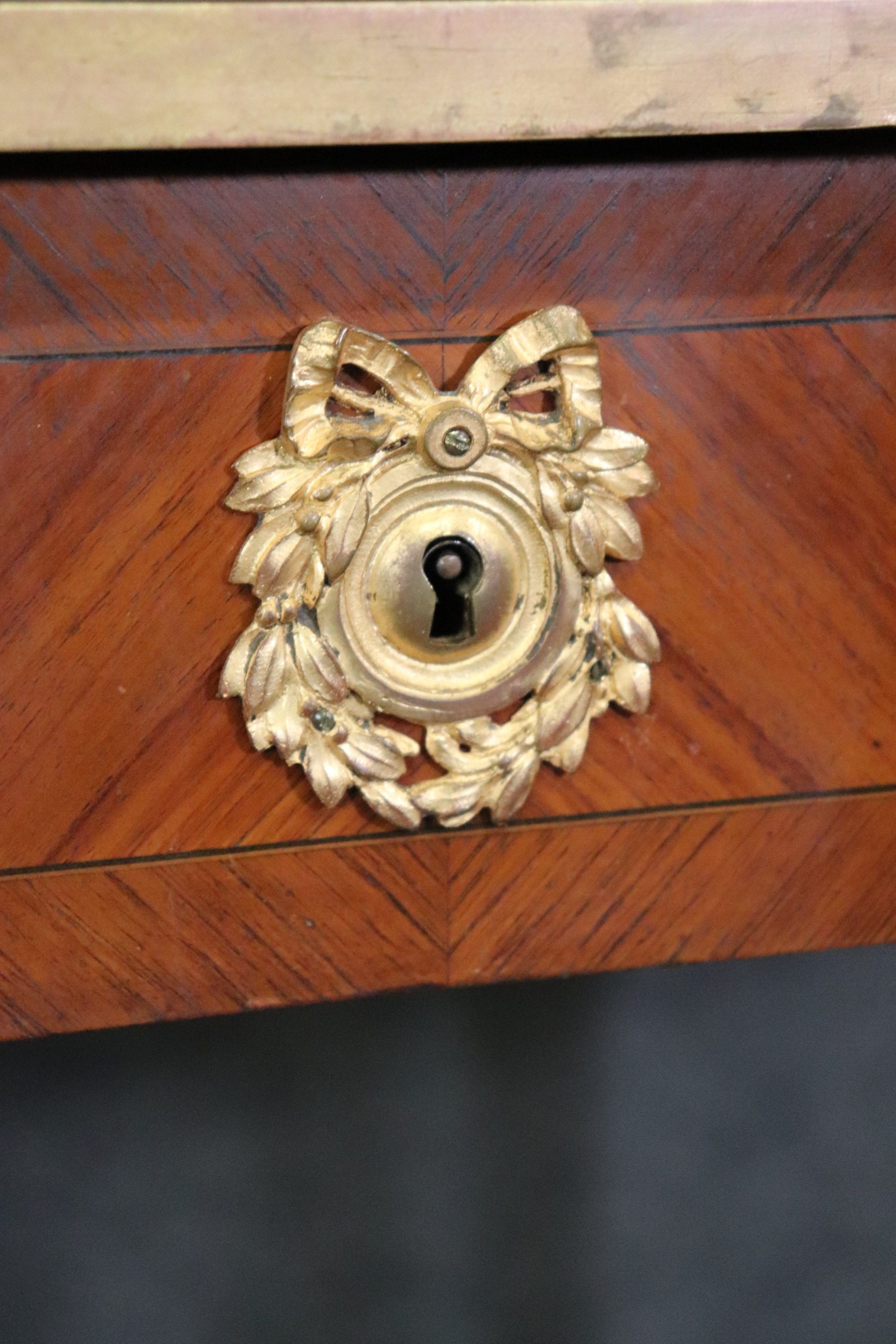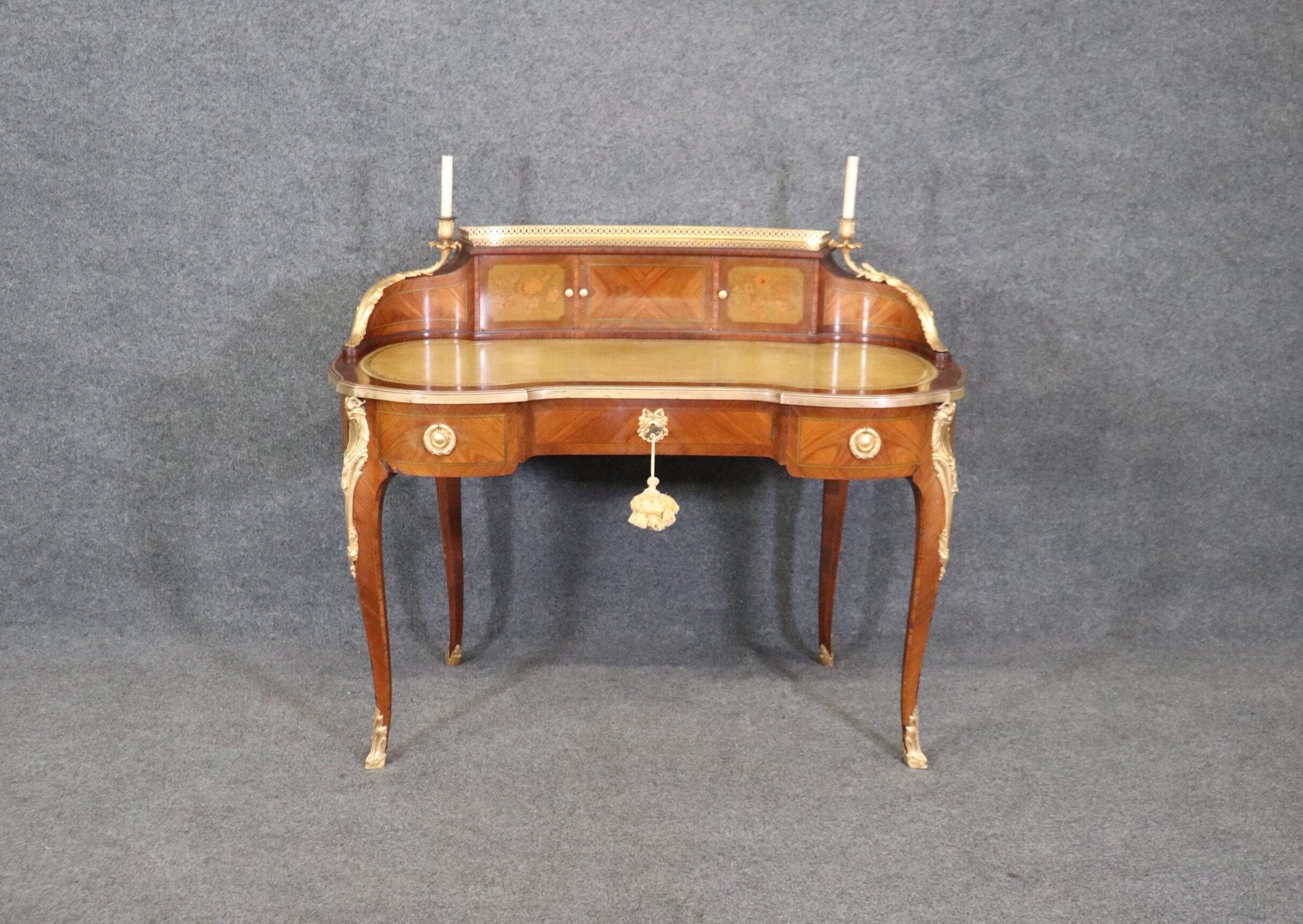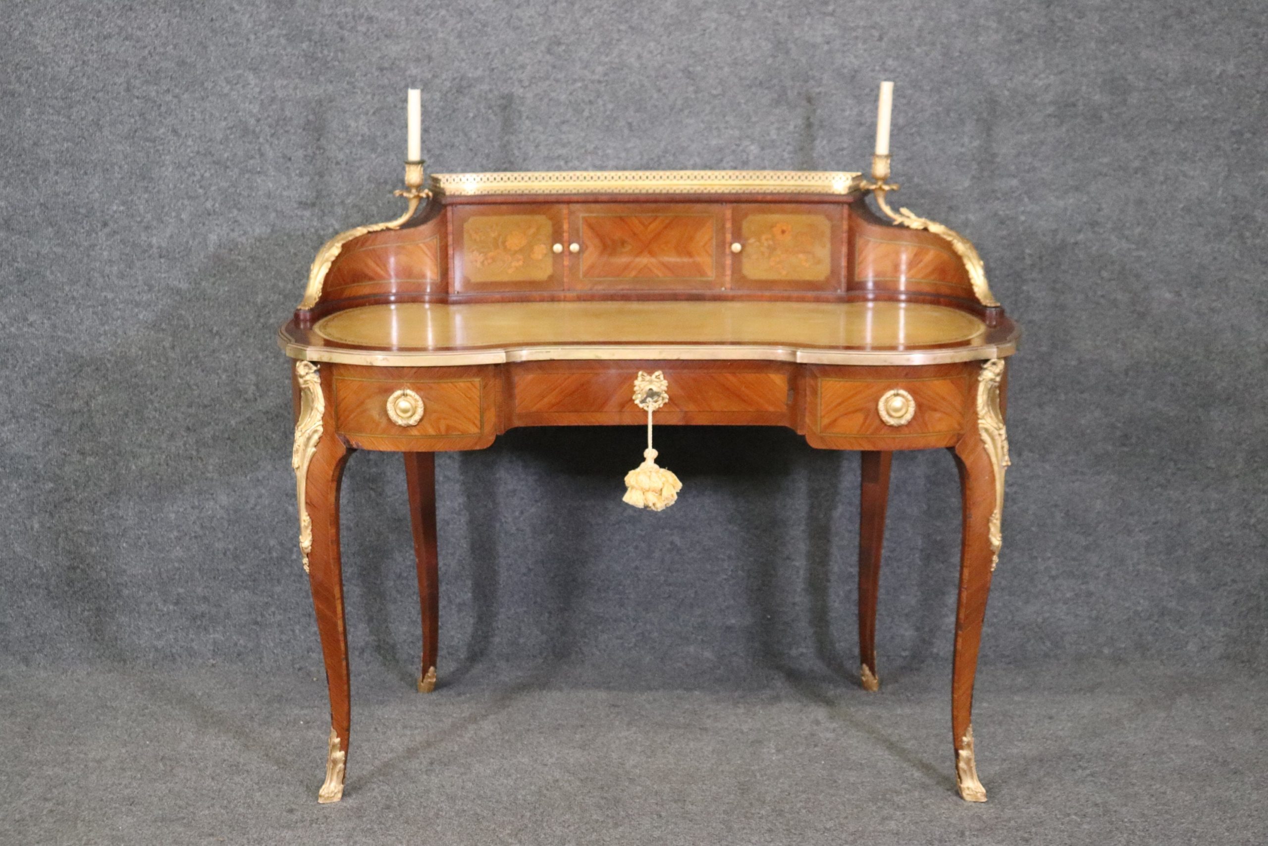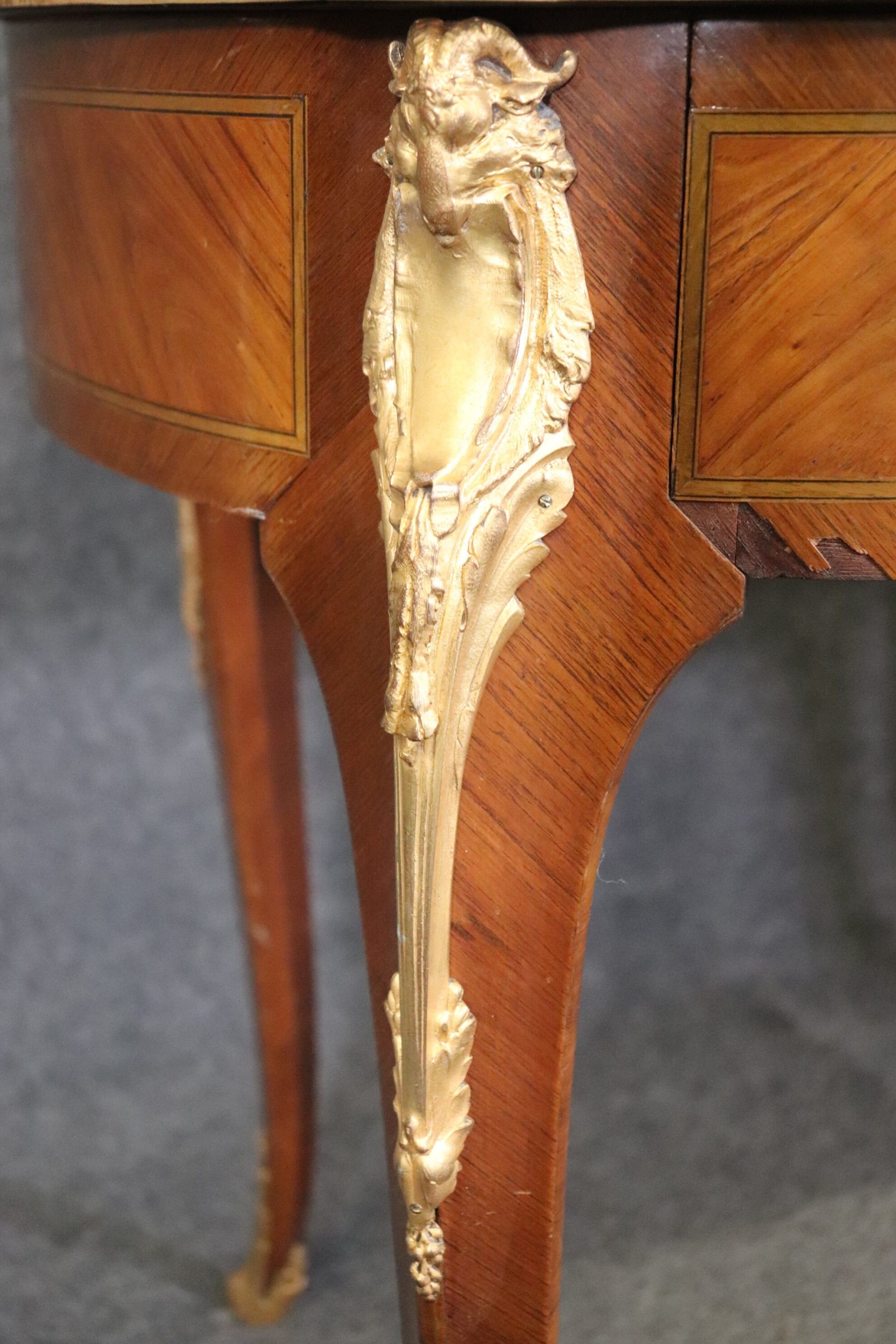 This Louis XV style late 19th century leather top cartonnier desk is made of the highest quality. This desk is a great opportunity to own something of museum quality that will hold its value and can be passed down through your families generations. If you look at the photos provided, you will see the elaborate ormolu mounts as well as the embossed leather top surface. The desk is also equipped with 3 drawers in the front and 3 storage compartments on the top. The center drawers has a lock making it perfect for storing away any important belongings. This is a perfect conversation piece for your next gathering and due to its nice proportions can be used in any entryway, living room, office or place of your choosing! One nice feature of this desk is that even though its aesthetically pleasing it can also be used functionally on a day to day basis all while bringing a sense of luxury and class into your home! This cartonnier desk is in good antique condition with normal age related chips, minor finish loss and some light surface scratching as to be expected with an item of this age. Otherwise in good condition.