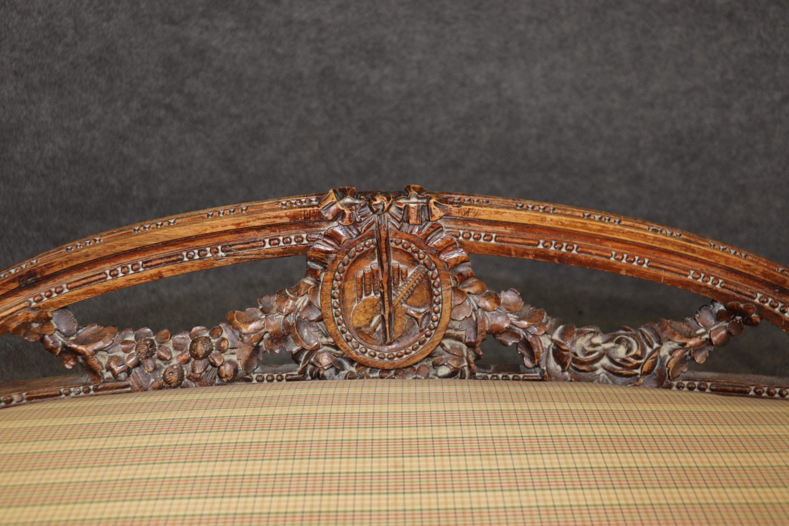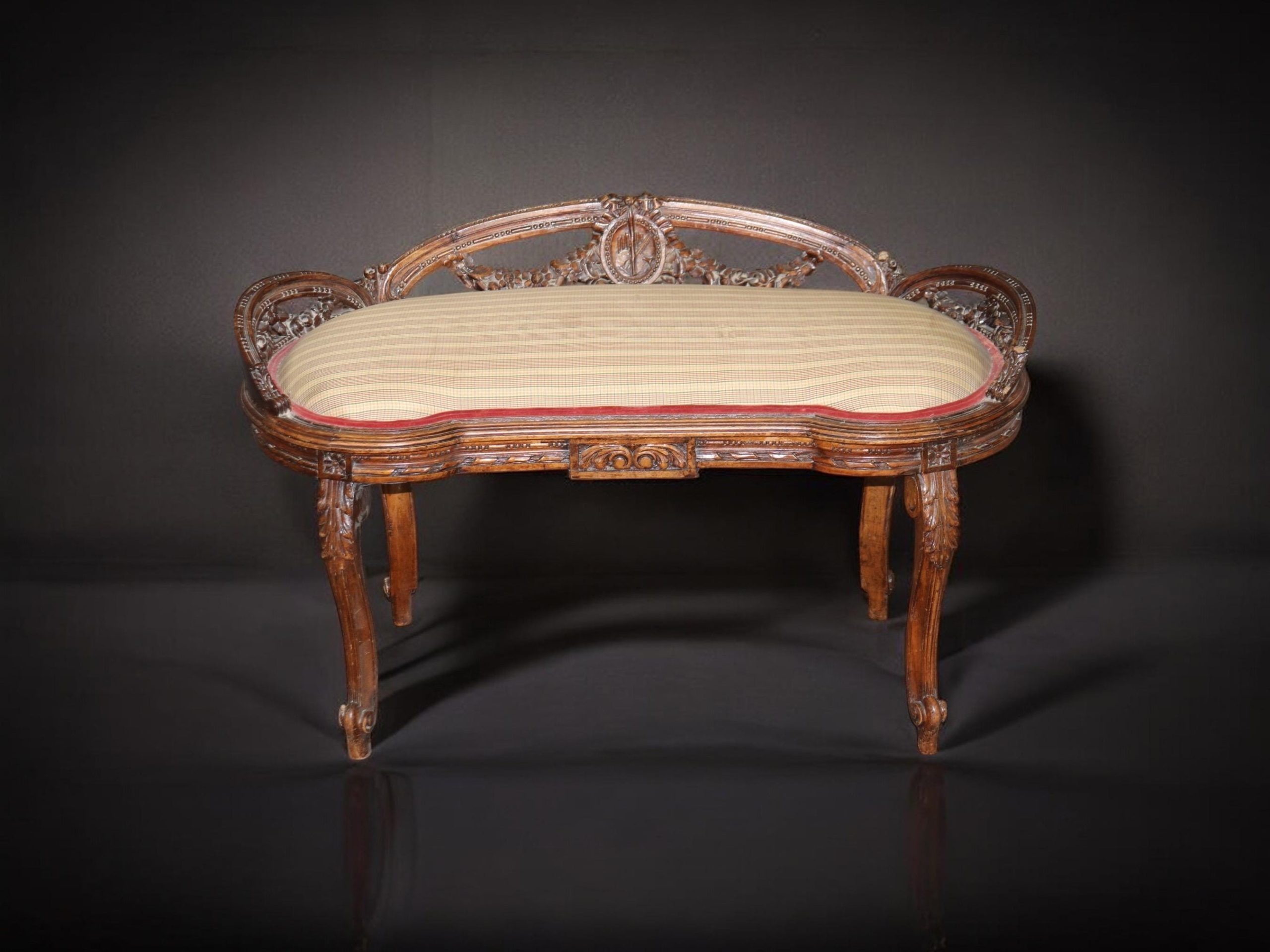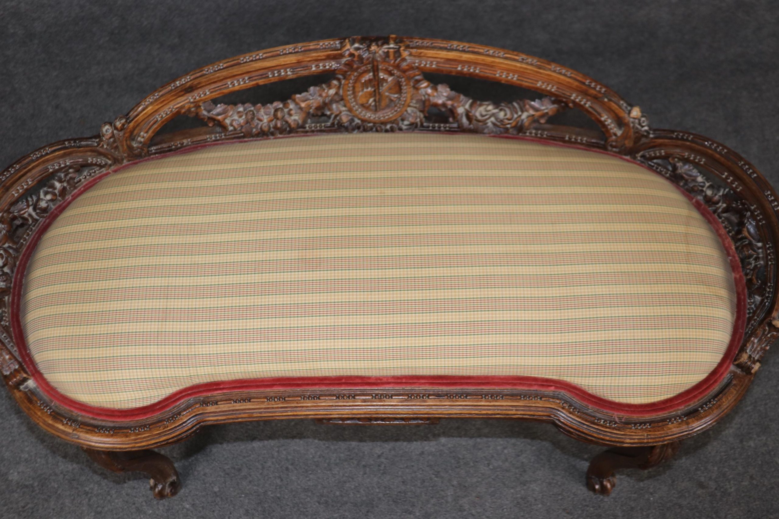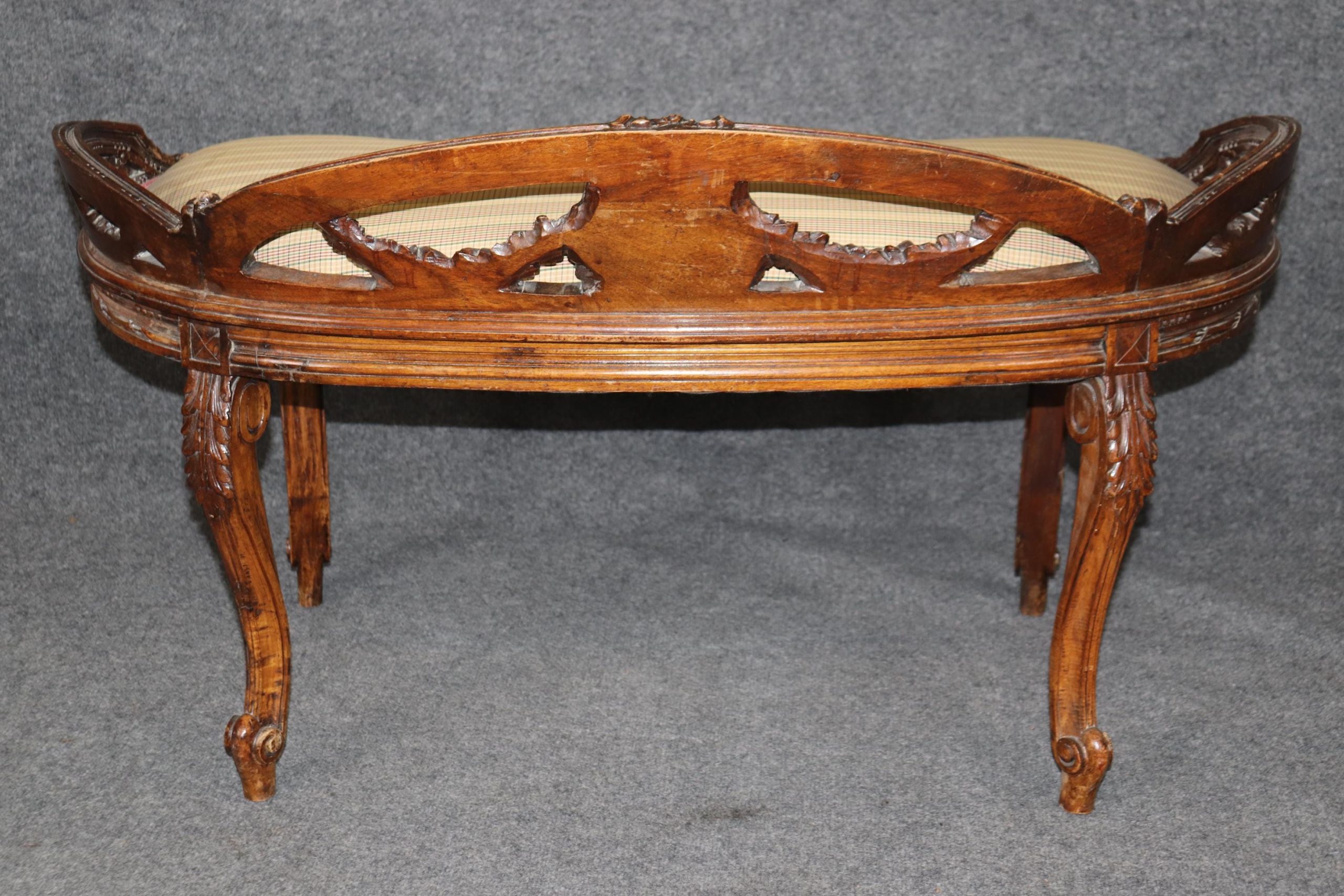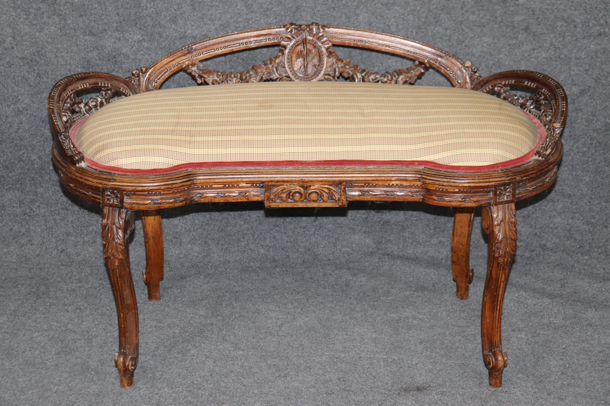 This antique Louis XV Style carved upholstered bench is made of the highest quality! If you look at the photos provided, the luxurious upholstery as well as the attention to detail in the carvings throughout the piece. This piece is perfect for any living room, bedroom, hallway, entryway or office and is bound to bring a refreshing sense of minimalistic luxury and character into your home! Antique furniture and vintage pieces have stood the test of time and this bench is no exception! With its quality materials and great craftsmanship, this piece is bound to last you and your family for many years to come. This piece is in good antique condition with the exception of light surface scratches, small chips and some finish loss as to be expected with items of age and use. The upholstery is in good condition with some possible age related wear.