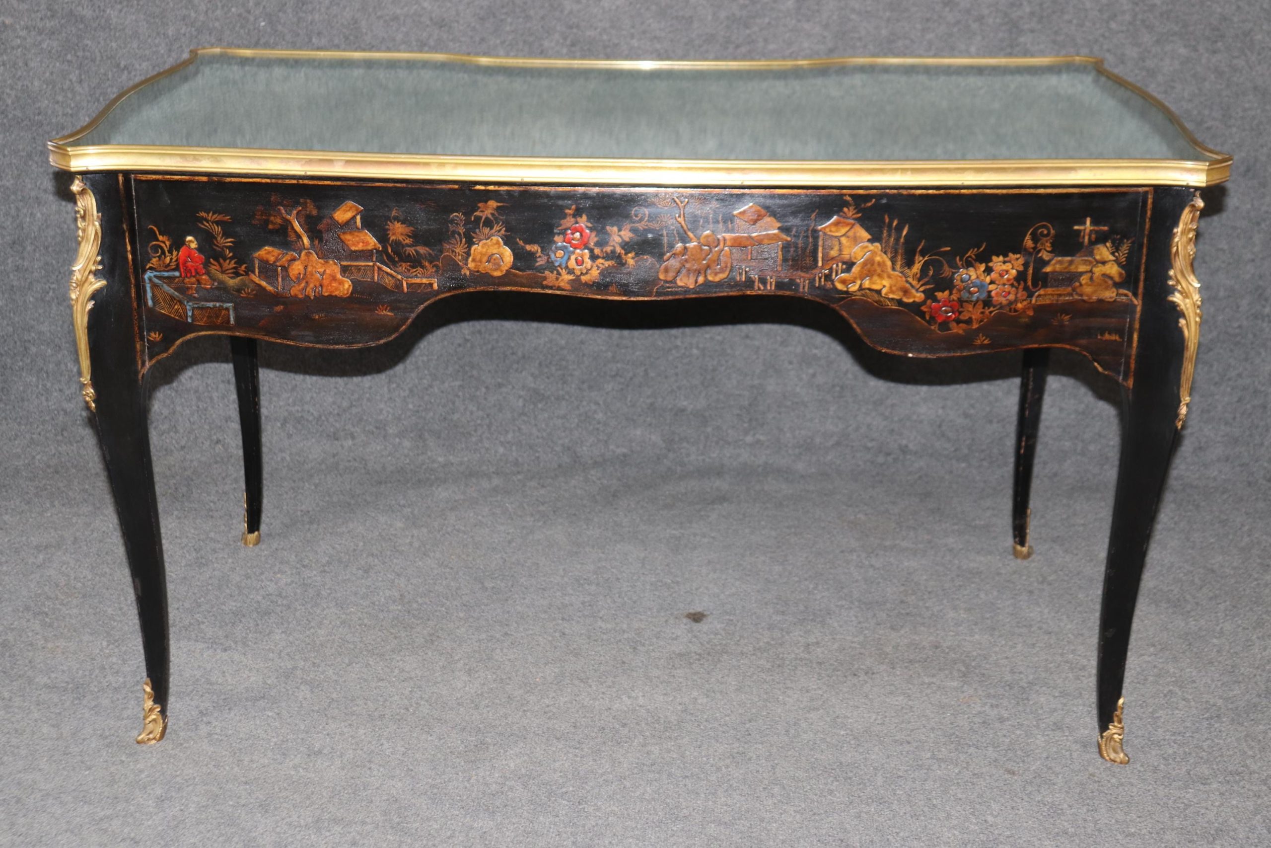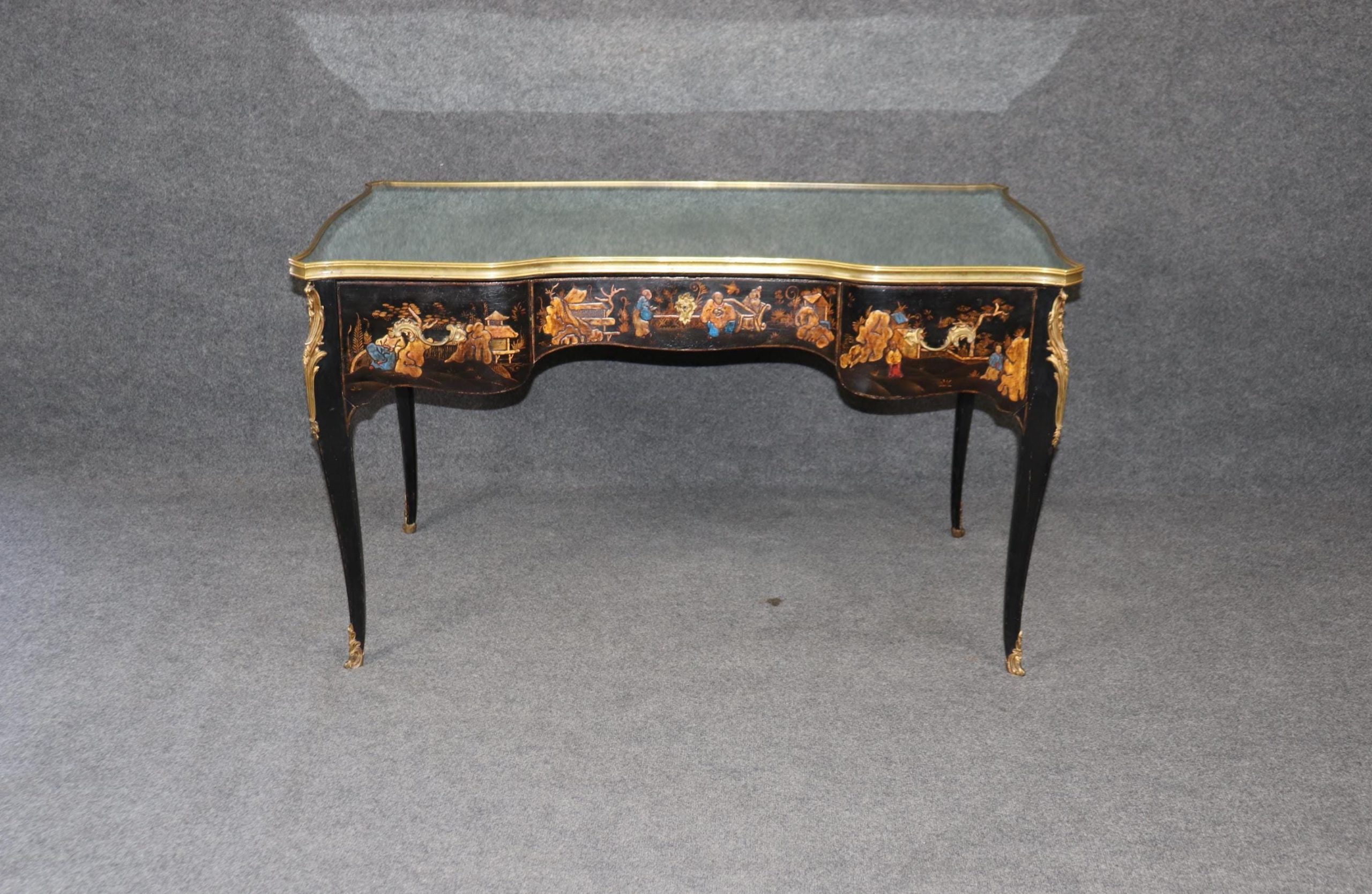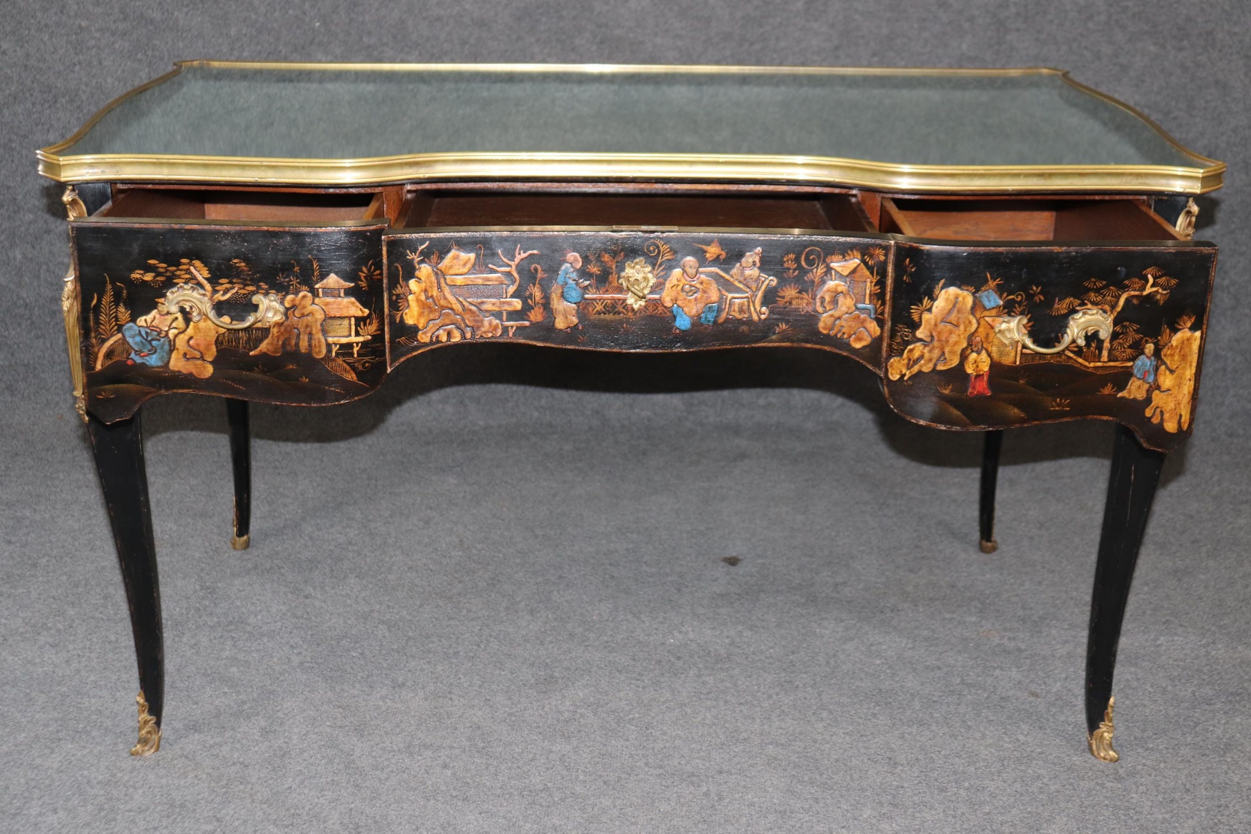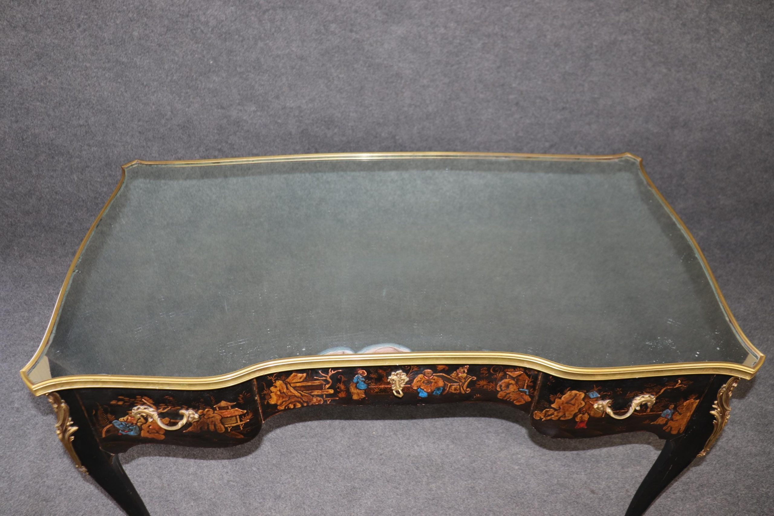 This French antique Louis XV style bronze ormolu mounted chinoiserie paint decorated mirrored top writing desk is of the highest quality! If you look at the photos provided, you will see the detail in the various Oriental style paint decorated scenes throughout the piece. This piece is perfect for any living room, bedroom, office or kitchen and is equipped with 3 spacious drawers, perfect for storing your personal belongings all while bringing a sense of luxury and class into your home! Antique furniture and vintage pieces have stood the test of time and this desk is no exception! With its quality materials and great craftsmanship this piece is bound to last you and your family for many years to come. The desk is in good antique condition with normal age related finish loss and surface scratches. There is a scallop to the mirror top as shown. Otherwise, in good condition for an item circa 1890-1910!