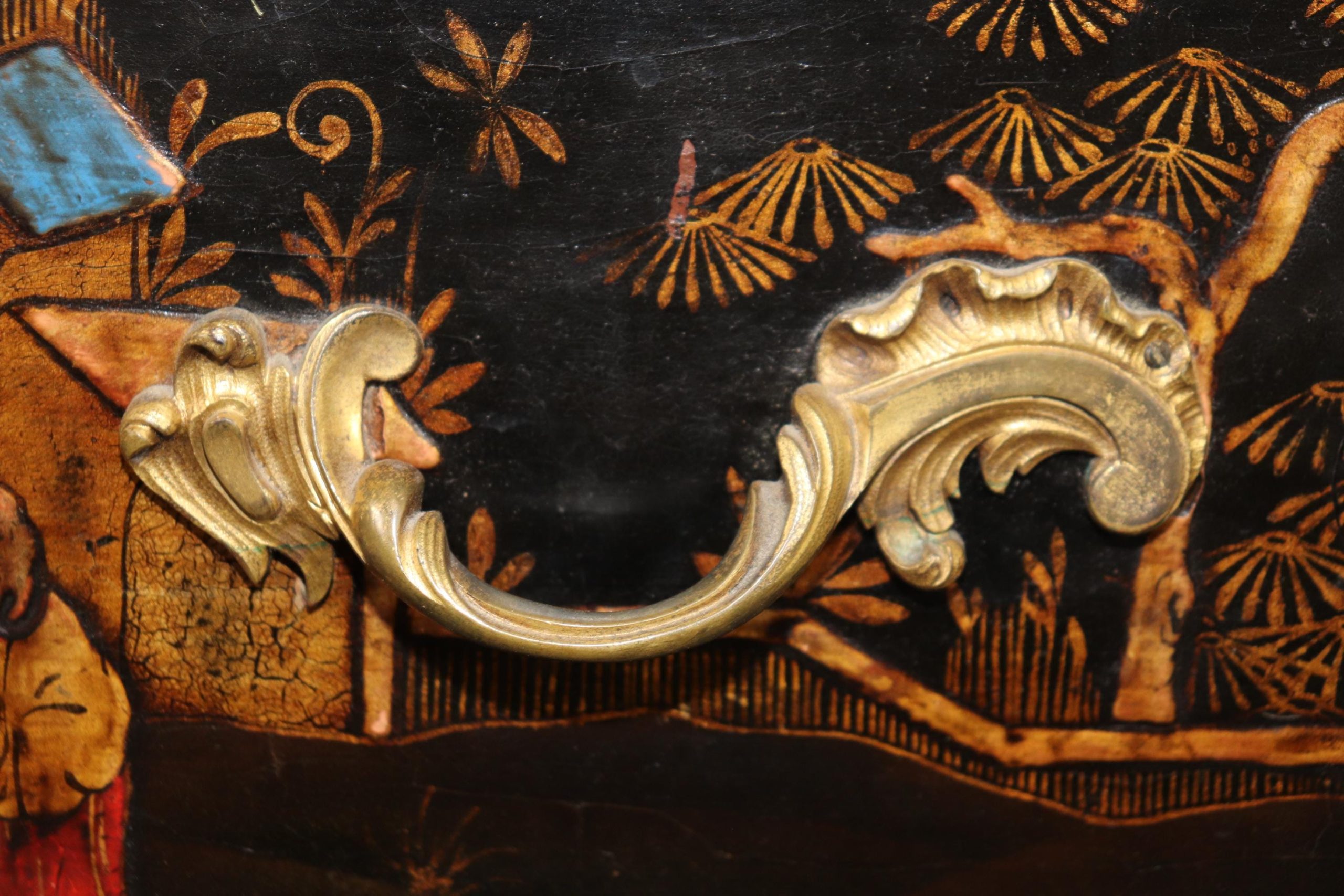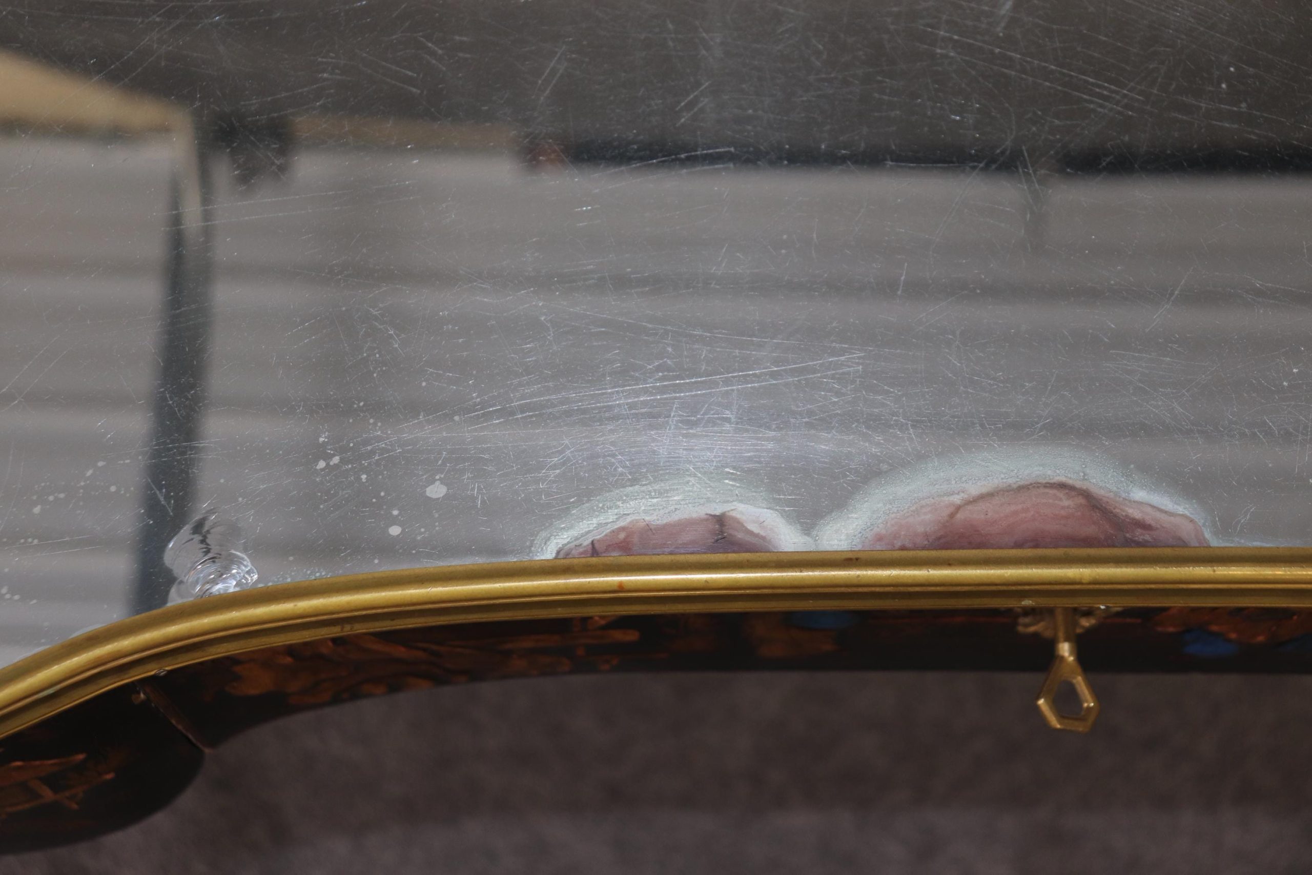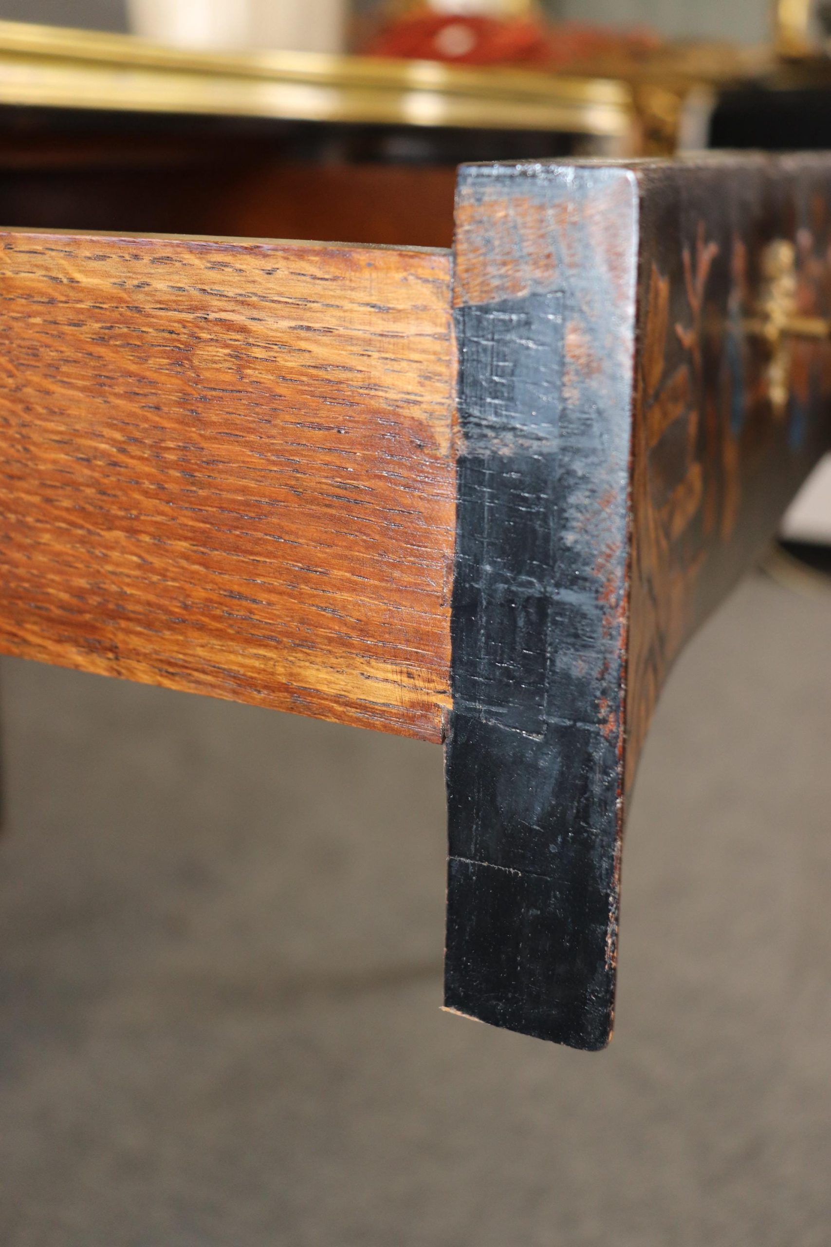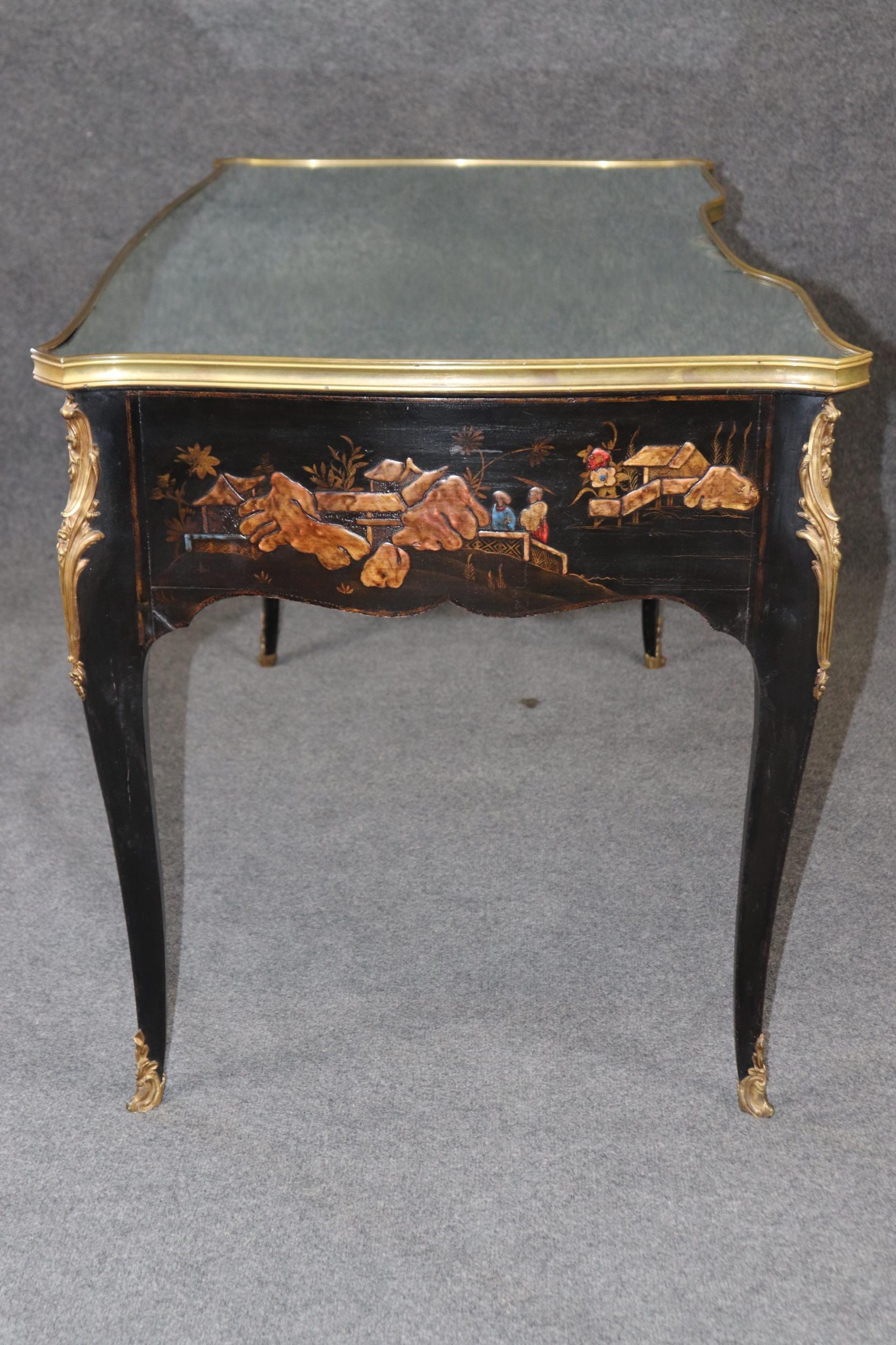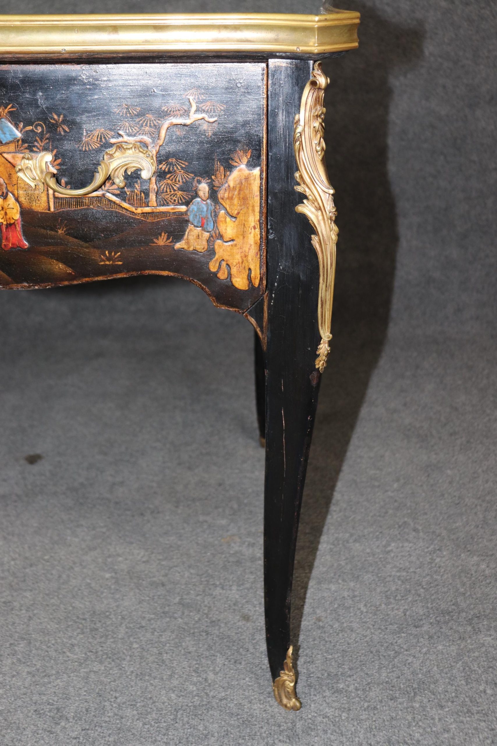 This French antique Louis XV style bronze ormolu mounted chinoiserie paint decorated mirrored top writing desk is of the highest quality! If you look at the photos provided, you will see the detail in the various Oriental style paint decorated scenes throughout the piece. This piece is perfect for any living room, bedroom, office or kitchen and is equipped with 3 spacious drawers, perfect for storing your personal belongings all while bringing a sense of luxury and class into your home! Antique furniture and vintage pieces have stood the test of time and this desk is no exception! With its quality materials and great craftsmanship this piece is bound to last you and your family for many years to come. The desk is in good antique condition with normal age related finish loss and surface scratches. There is a scallop to the mirror top as shown. Otherwise, in good condition for an item circa 1890-1910!
