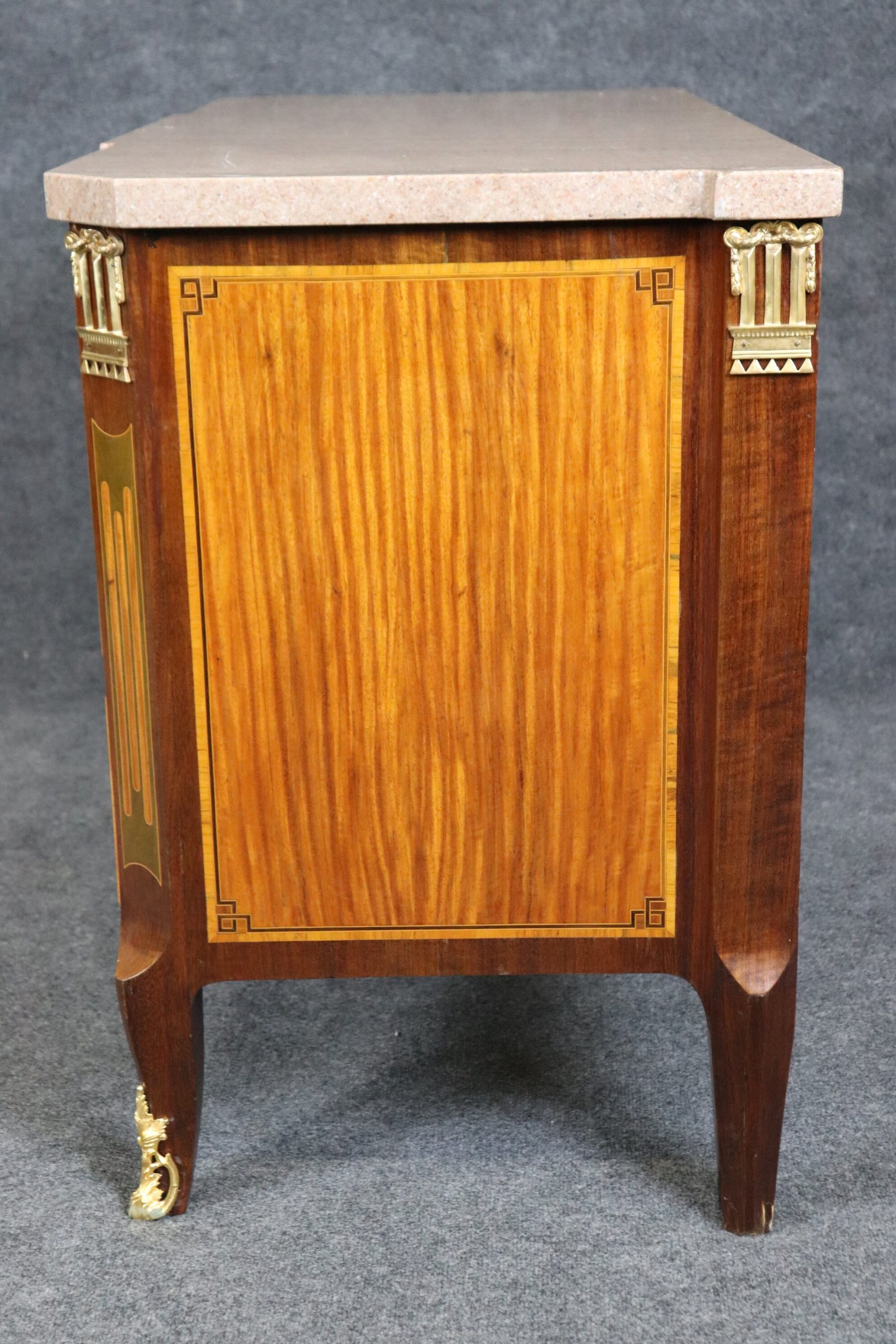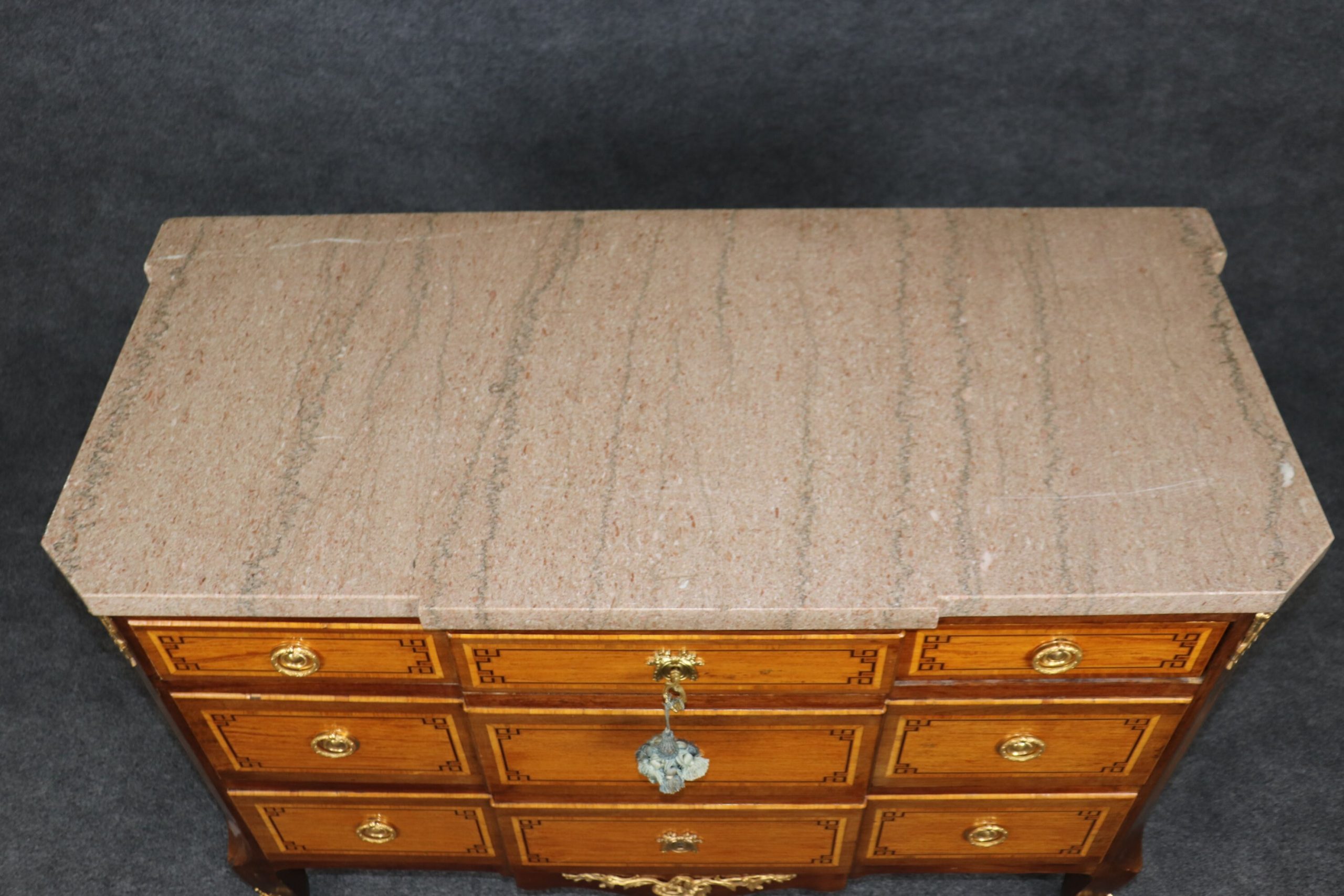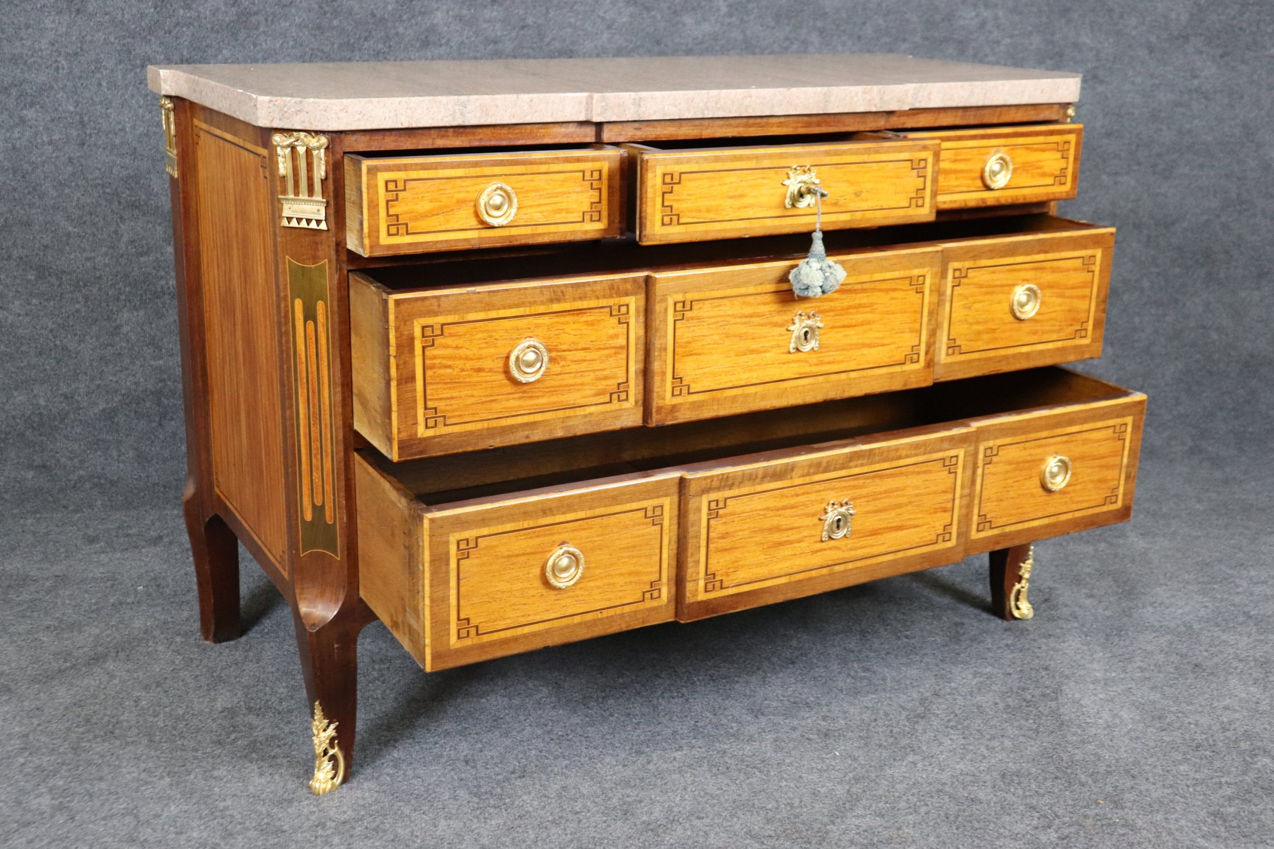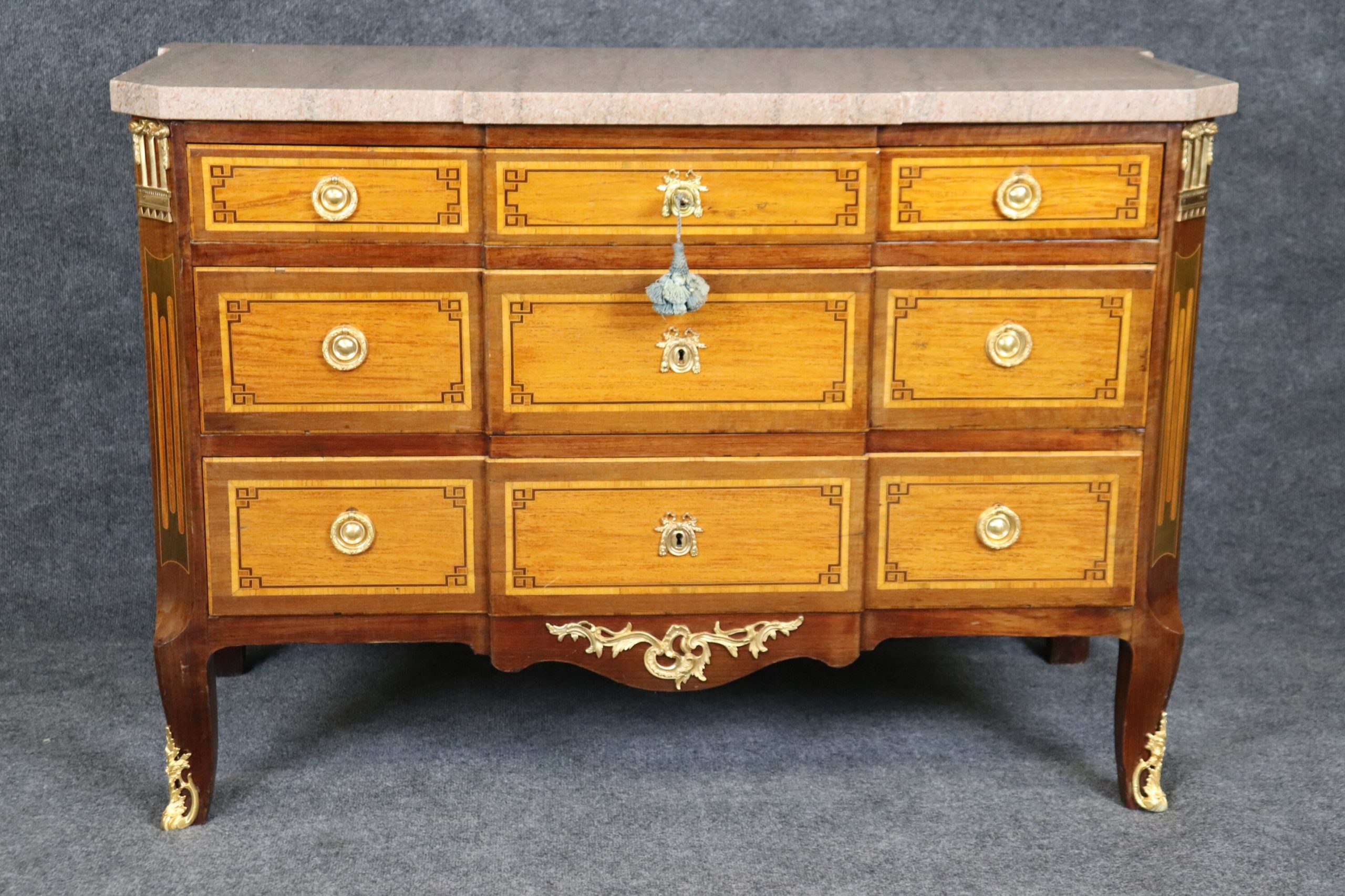 This Antique Late 19th Century Louis XV Style Bronze Mounted Marble Top Commode is made of the highest quality! If you take a look at the photos provided you will see the attention to detail within the matched and inlaid veneer as well as the finely detailed bronze ormolu mounts! This piece is equipped with 5 spacious lockable drawers making it perfect for storing all of your personal belongings and keeping them safe and out of reach. The locks on this commode are also signed by Vachette Freres a prominent locksmith in Paris during the late 19th and early 20th century. This commode is also equipped with a lovely thick marble top which really adds to the luxuriousness of the piece! Antique furniture and vintage pieces have stood the test of time and this commode/chest of drawers is no exception! With its quality materials and great craftsmanship this piece will last you and your family for many years to come. This piece is bound to bring a sense of character and luxury into your home and will certainly be a topic of conversation at your next gathering or event! The commode is in good antique condition with the exception of some light surface scratches, minor finish loss and some very minor chipping to the veneer as well as some scratches to the marble top but otherwise really good condition considering its age!