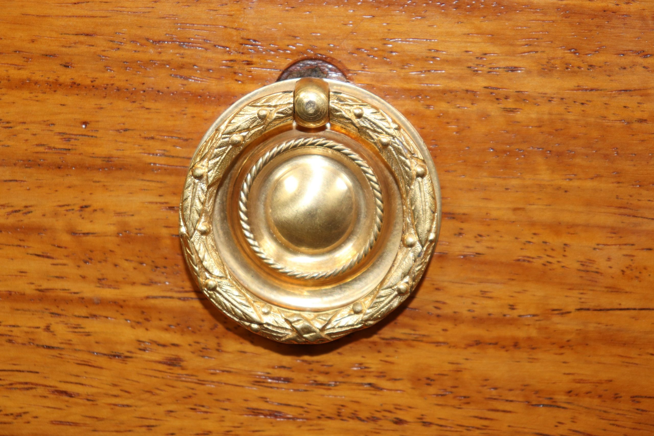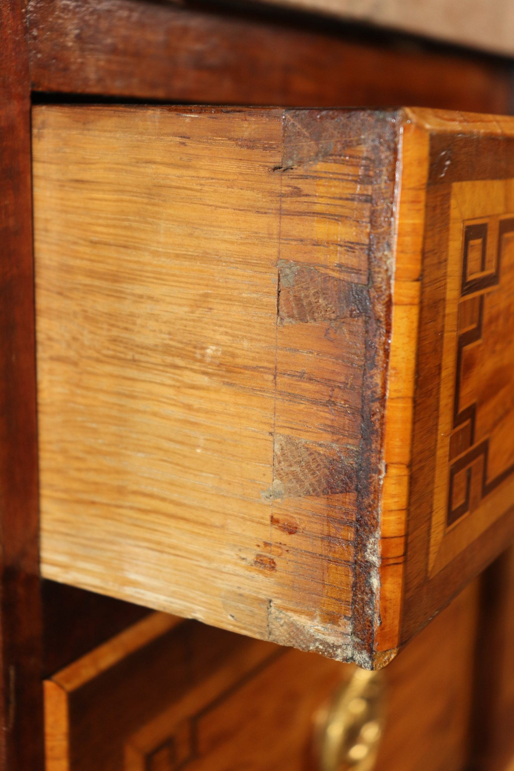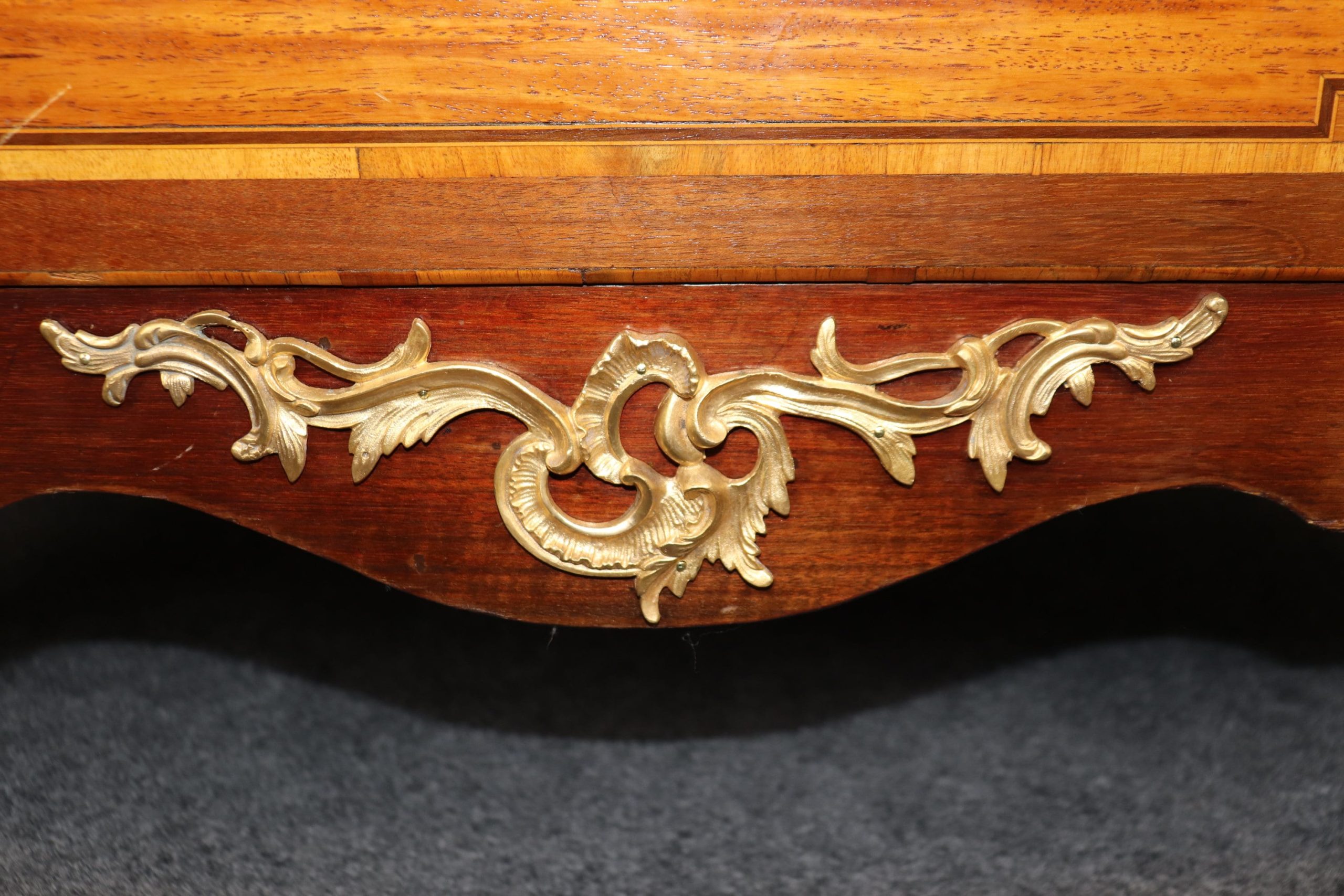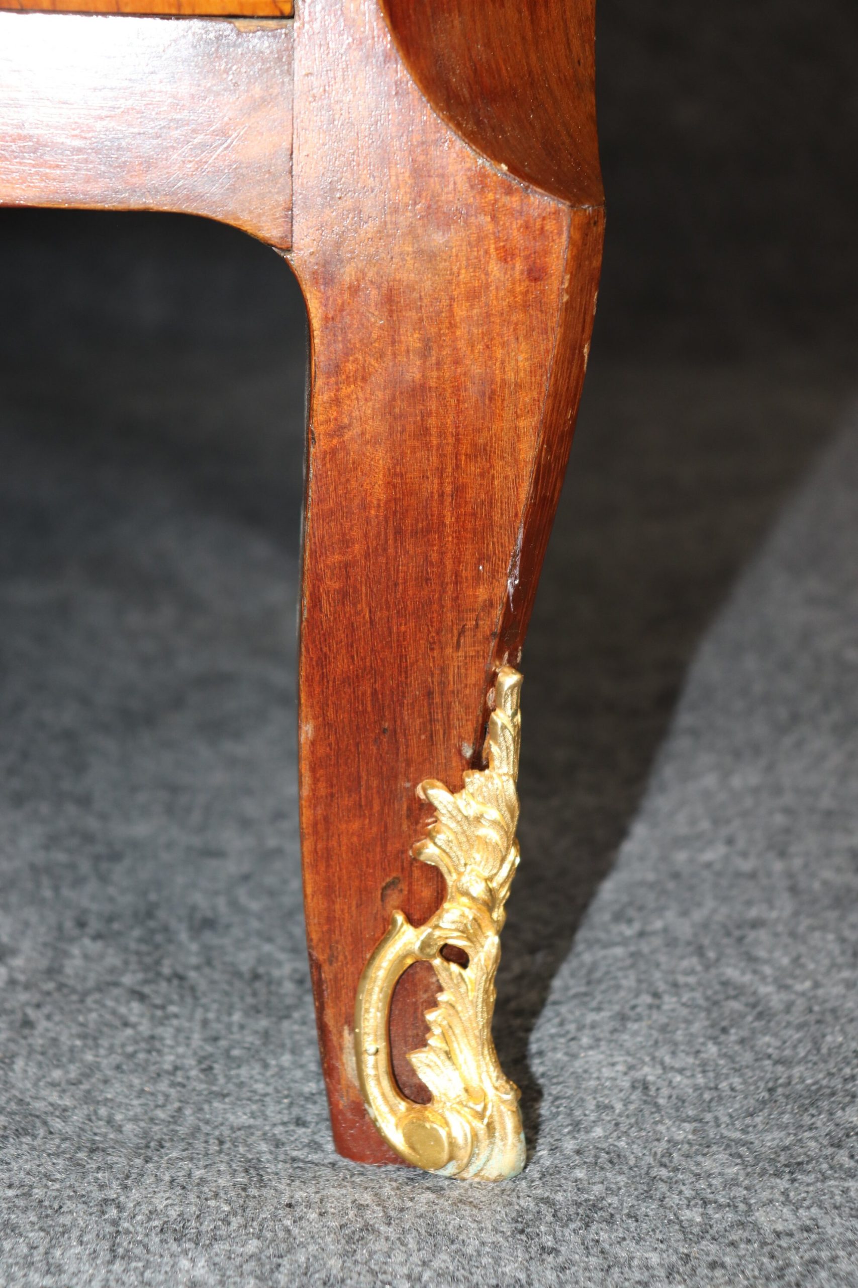This Antique Late 19th Century Louis XV Style Bronze Mounted Marble Top Commode is made of the highest quality! If you take a look at the photos provided you will see the attention to detail within the matched and inlaid veneer as well as the finely detailed bronze ormolu mounts! This piece is equipped with 5 spacious lockable drawers making it perfect for storing all of your personal belongings and keeping them safe and out of reach. The locks on this commode are also signed by Vachette Freres a prominent locksmith in Paris during the late 19th and early 20th century. This commode is also equipped with a lovely thick marble top which really adds to the luxuriousness of the piece! Antique furniture and vintage pieces have stood the test of time and this commode/chest of drawers is no exception! With its quality materials and great craftsmanship this piece will last you and your family for many years to come. This piece is bound to bring a sense of character and luxury into your home and will certainly be a topic of conversation at your next gathering or event! The commode is in good antique condition with the exception of some light surface scratches, minor finish loss and some very minor chipping to the veneer as well as some scratches to the marble top but otherwise really good condition considering its age!