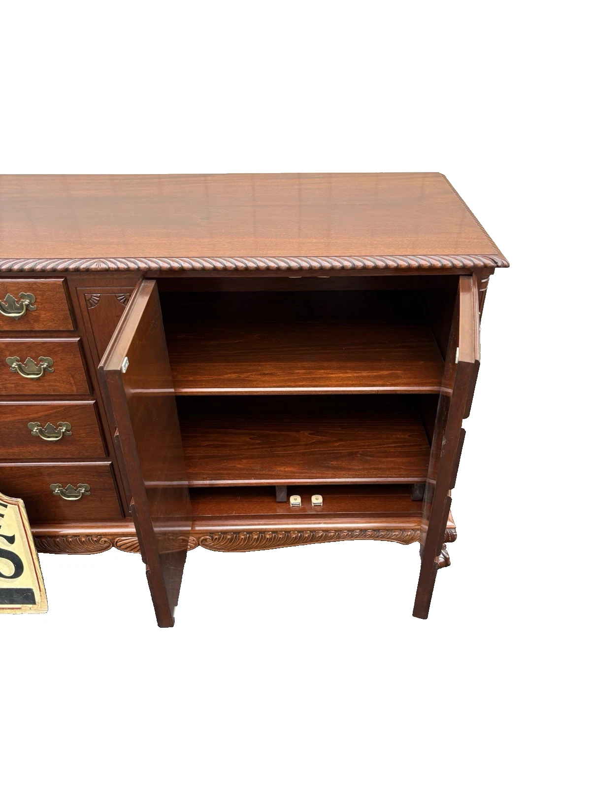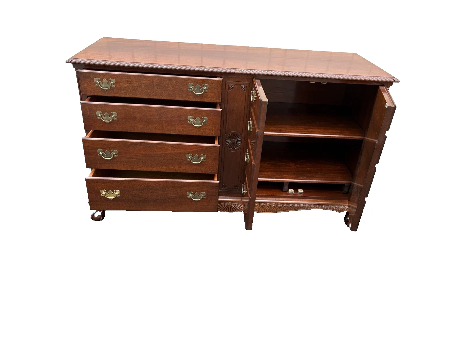 Crafted in the elegant Chippendale style, this antique mahogany dresser cabinet chest from the mid-20th century showcases the timeless beauty of handcrafted furniture. With its four spacious dovetailed drawers and two charming doors, it offers both functional storage and a touch of classic sophistication to your space. The warm, rich mahogany finish reveals a gentle patina that tells the story of its age, while its sturdy construction ensures it remains a cherished piece for generations to come. A true testament to quality craftsmanship, this dresser is not just a storage solution but a piece of history waiting to be admired.