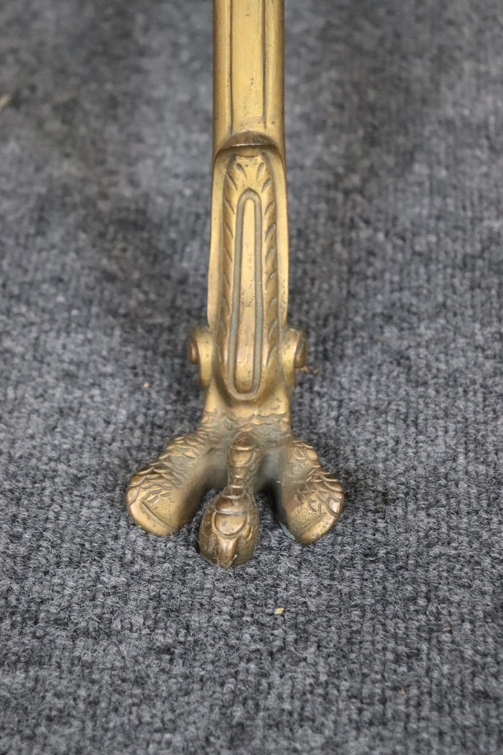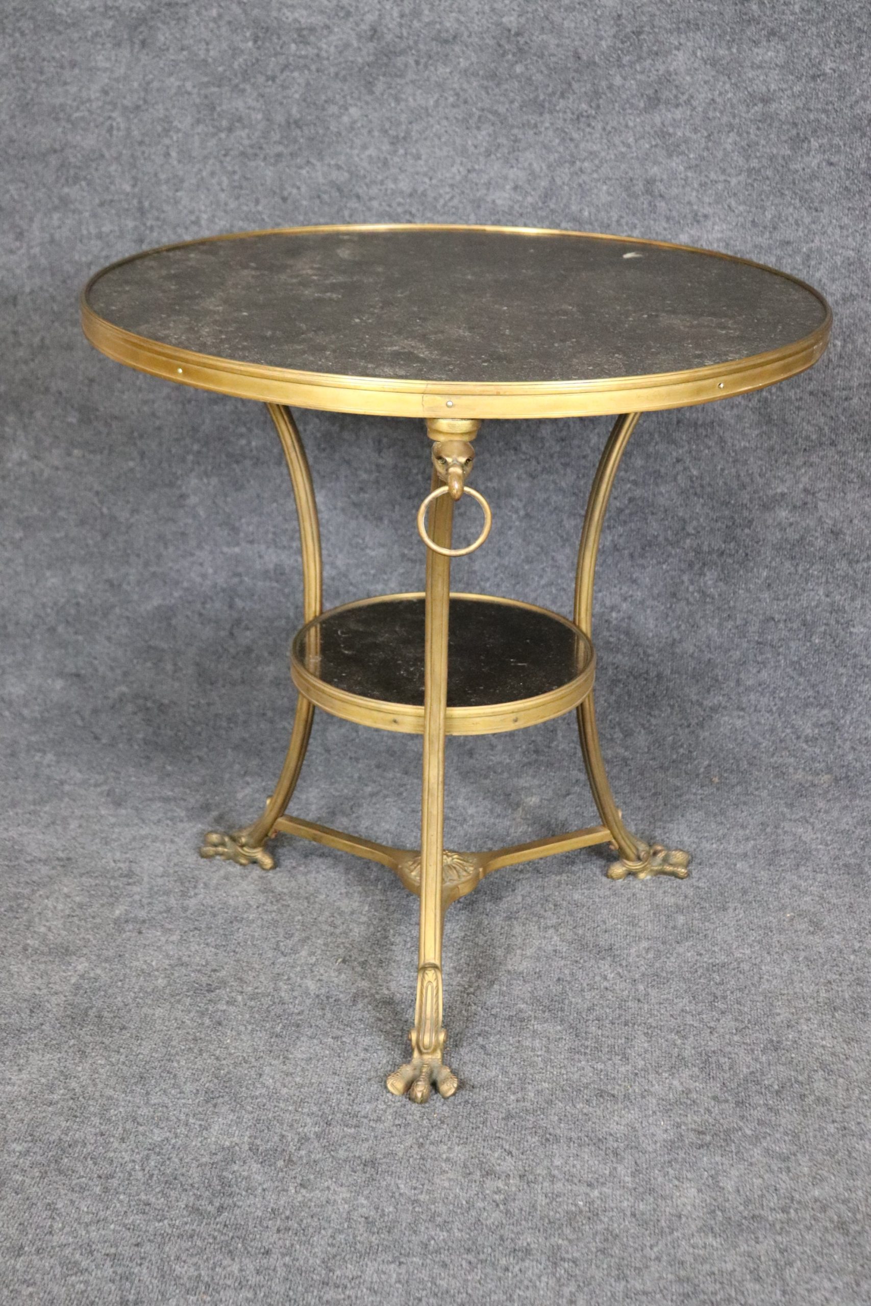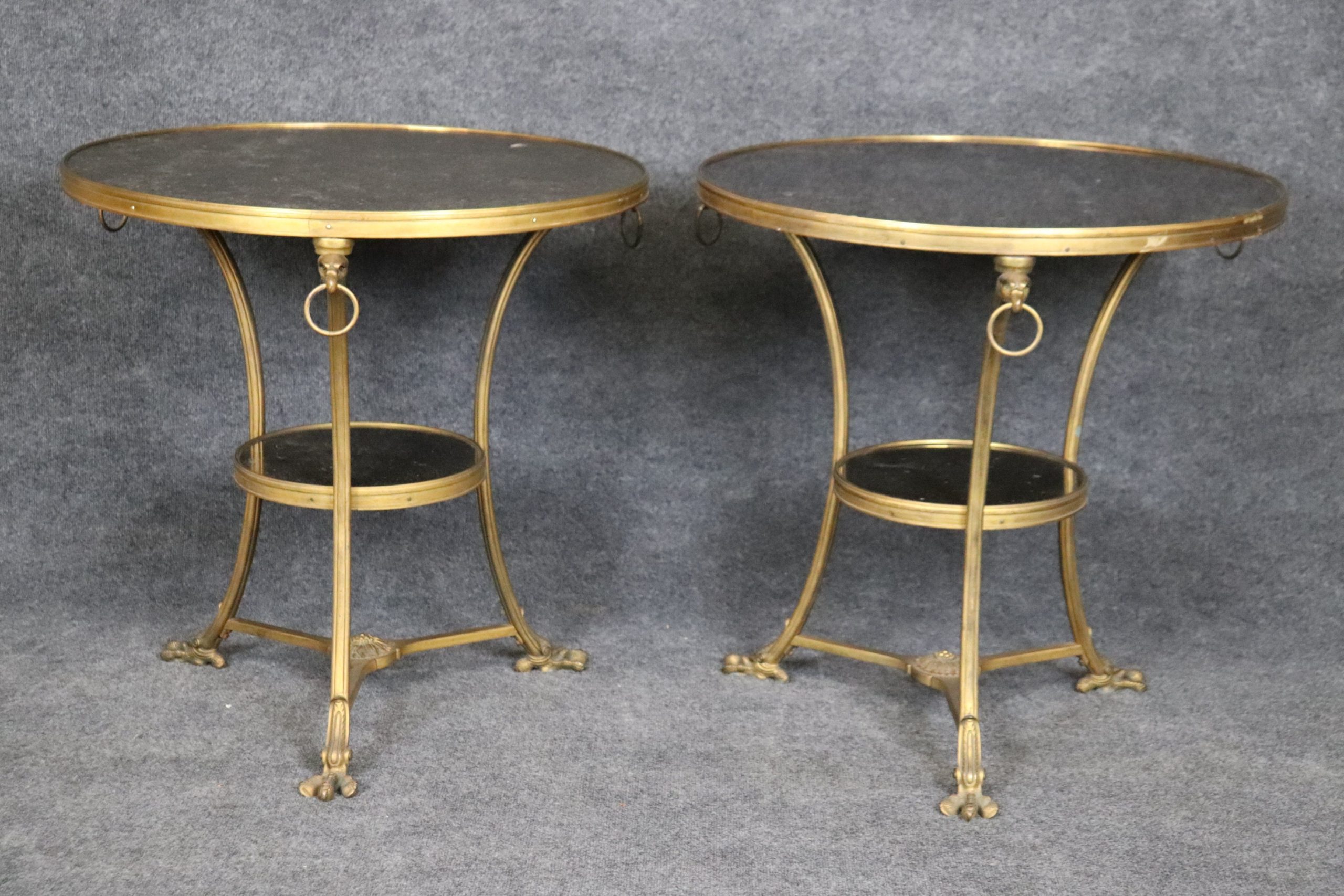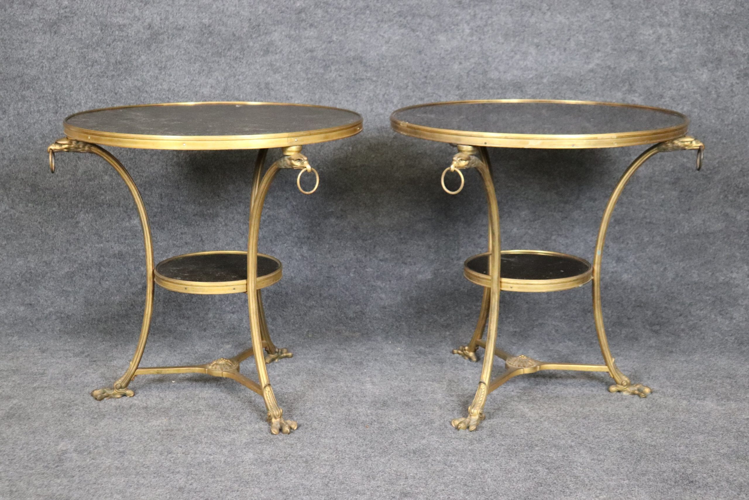 This antique Regency style bronze ormolu and marble top gueridons or marble top tables with eagle heads pack a big punch! This pair of gueridons are made of the highest quality and are perfect for you and your home or place of choosing. This pair is perfect to be used as a pair of end tables or side tables for your living room, or they can be used on each opposing side of an entry way as accent tables and can also be used as night stands if you’d like. A really nice quality about these tables is their ability to be paired with a variety of other styles you may already have in your home and will certainly be a conversation starter at your next gathering! The pair is in good vintage condition with light surface scratches and some minor oxidation to the base as to be expected with items of age but otherwise good condition.