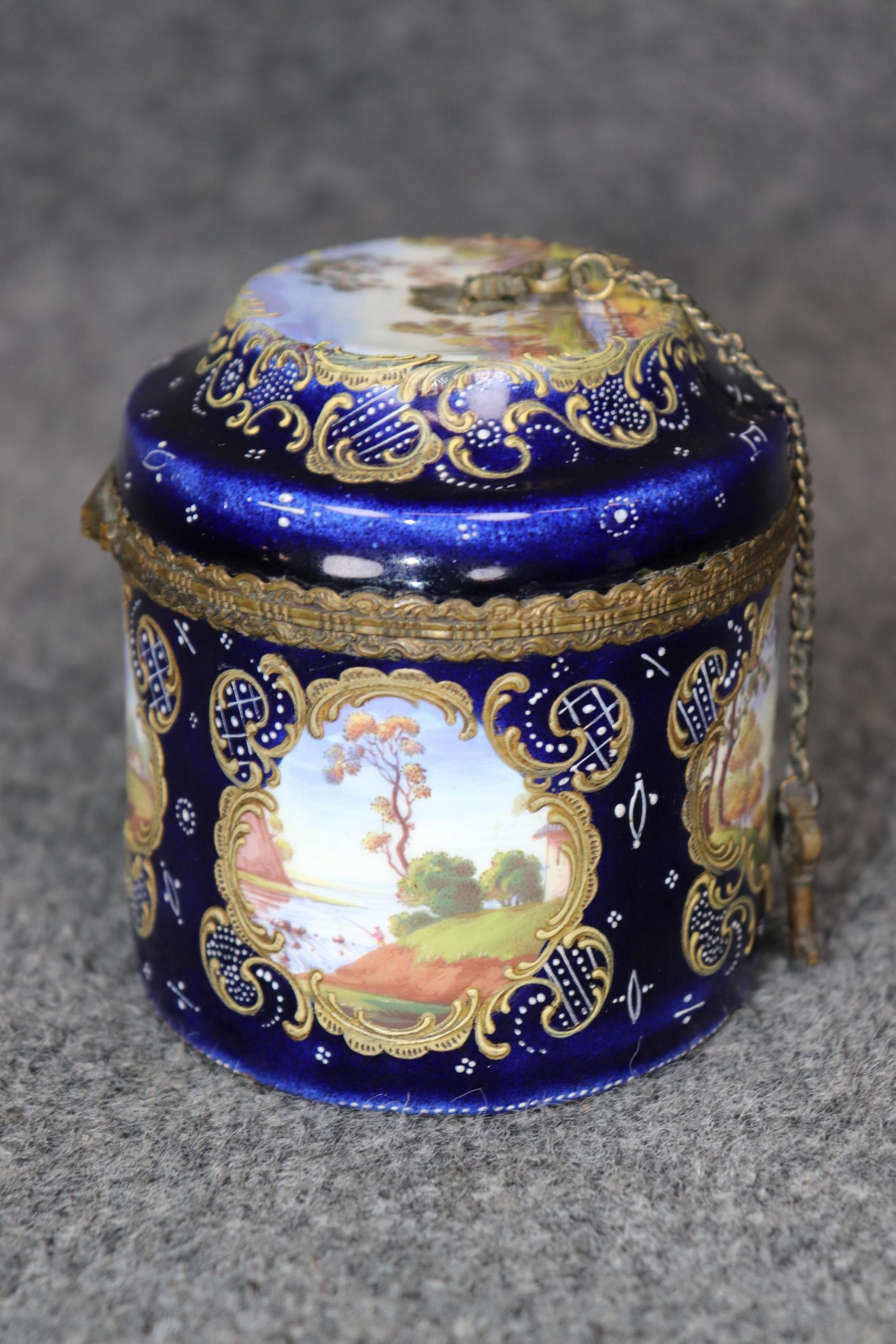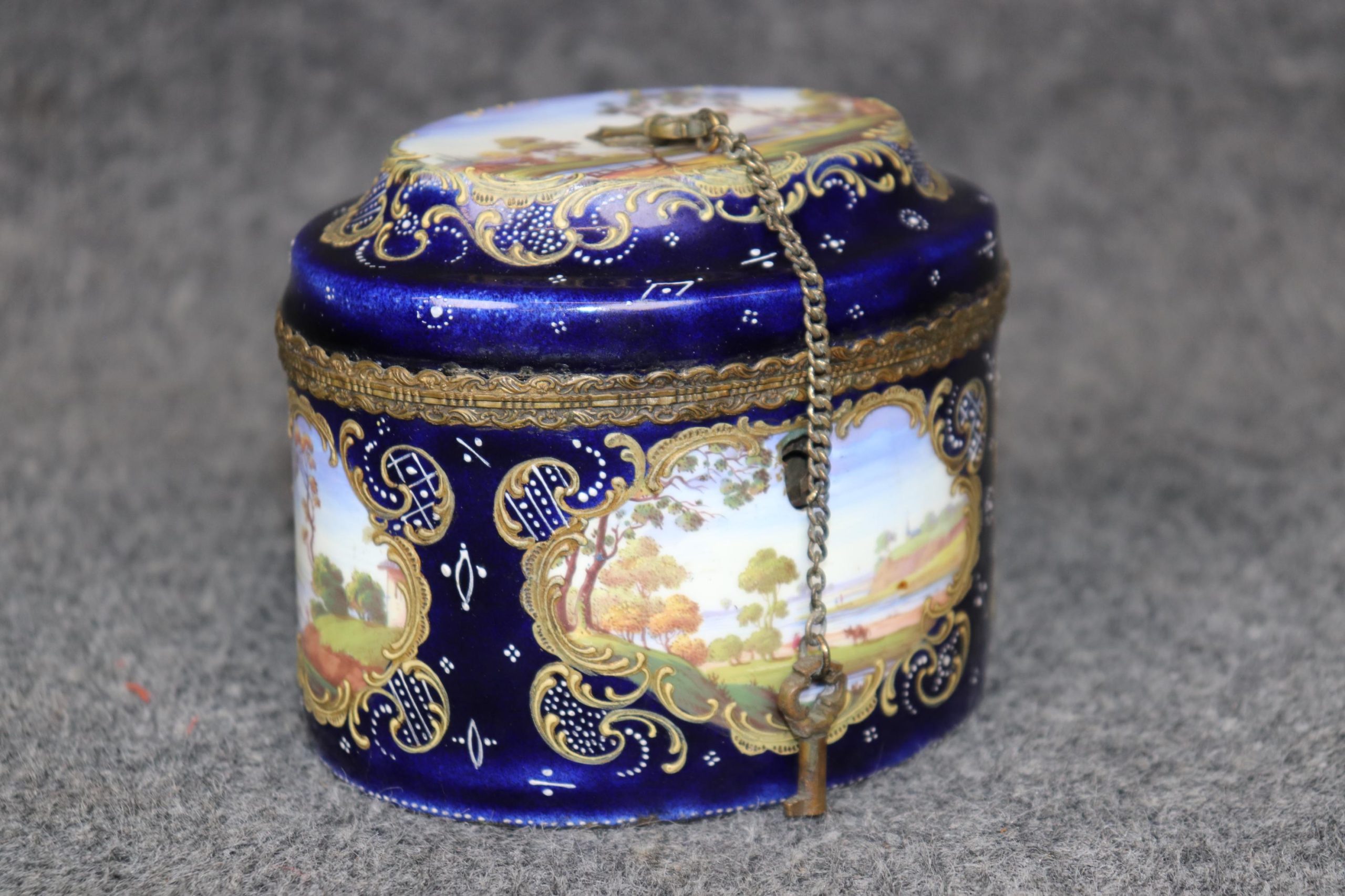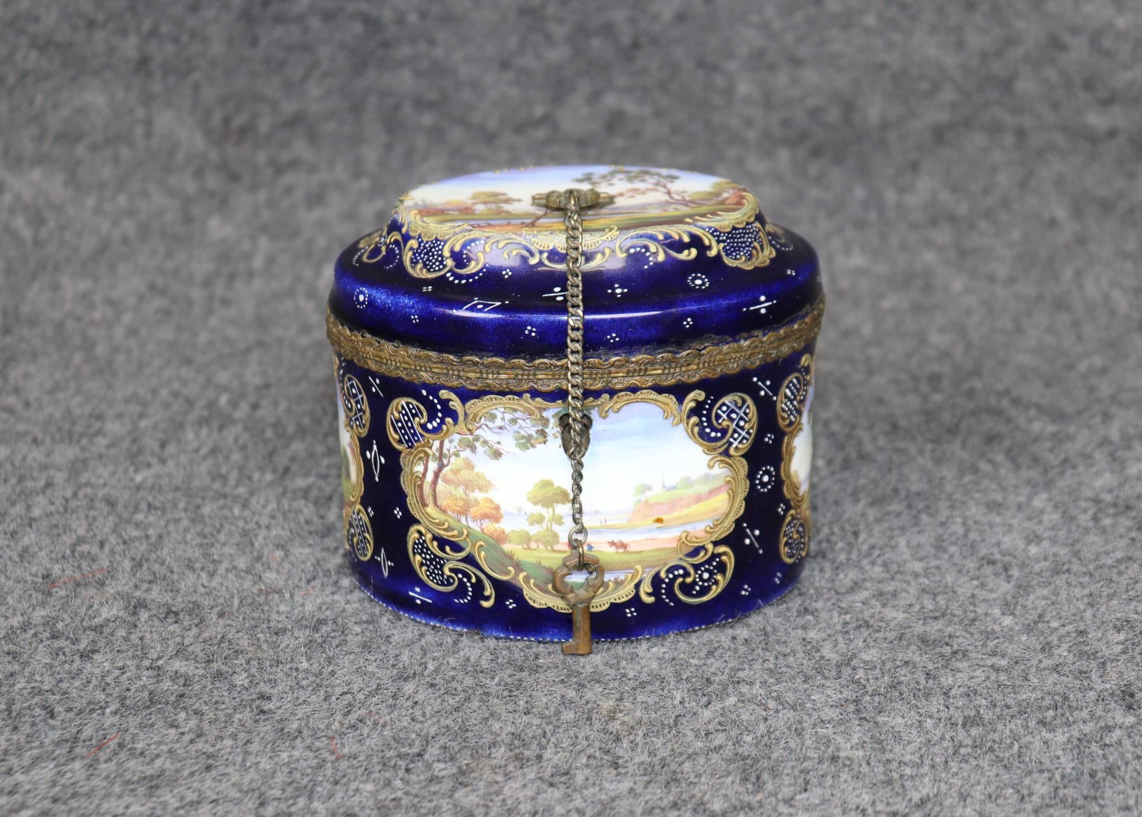 This antique 19th century Royal Vienna jewelry casket is made of the highest quality! Made in the 1890’s, this petite jewelry box perfect for storing away any precious jewelry or small object. If you look at the pictures provided, you can see the detail floral hand glazed scenes on all sides of the piece. This would make a wonderful addition to your bedroom, office, or any other room of your choosing and is bound to bring a sense of character and creativity! two unique things about this piece is that its equipped with the original key and is part of the jewelry box. The box also features its original velvet lining! Most of the time these boxes lose their original key throughout the years. This Piece is among some of the finer examples available on the market and is really a museum quality piece. This jewelry casket is in good antique condition with some surface scratches and wear, as to be expected of an item this age.