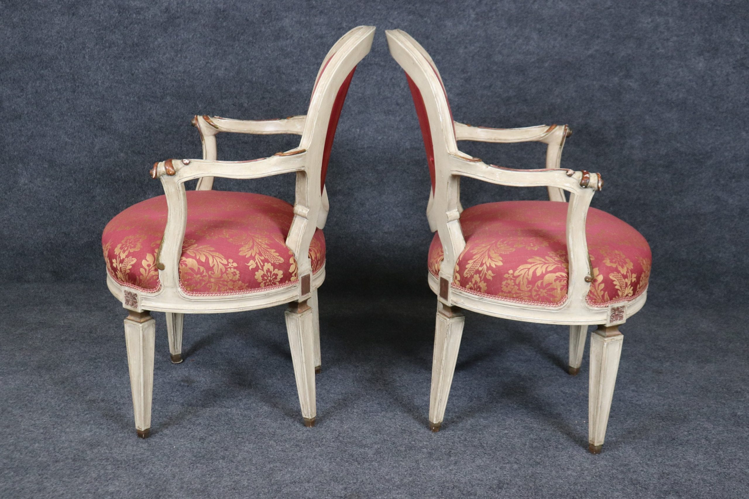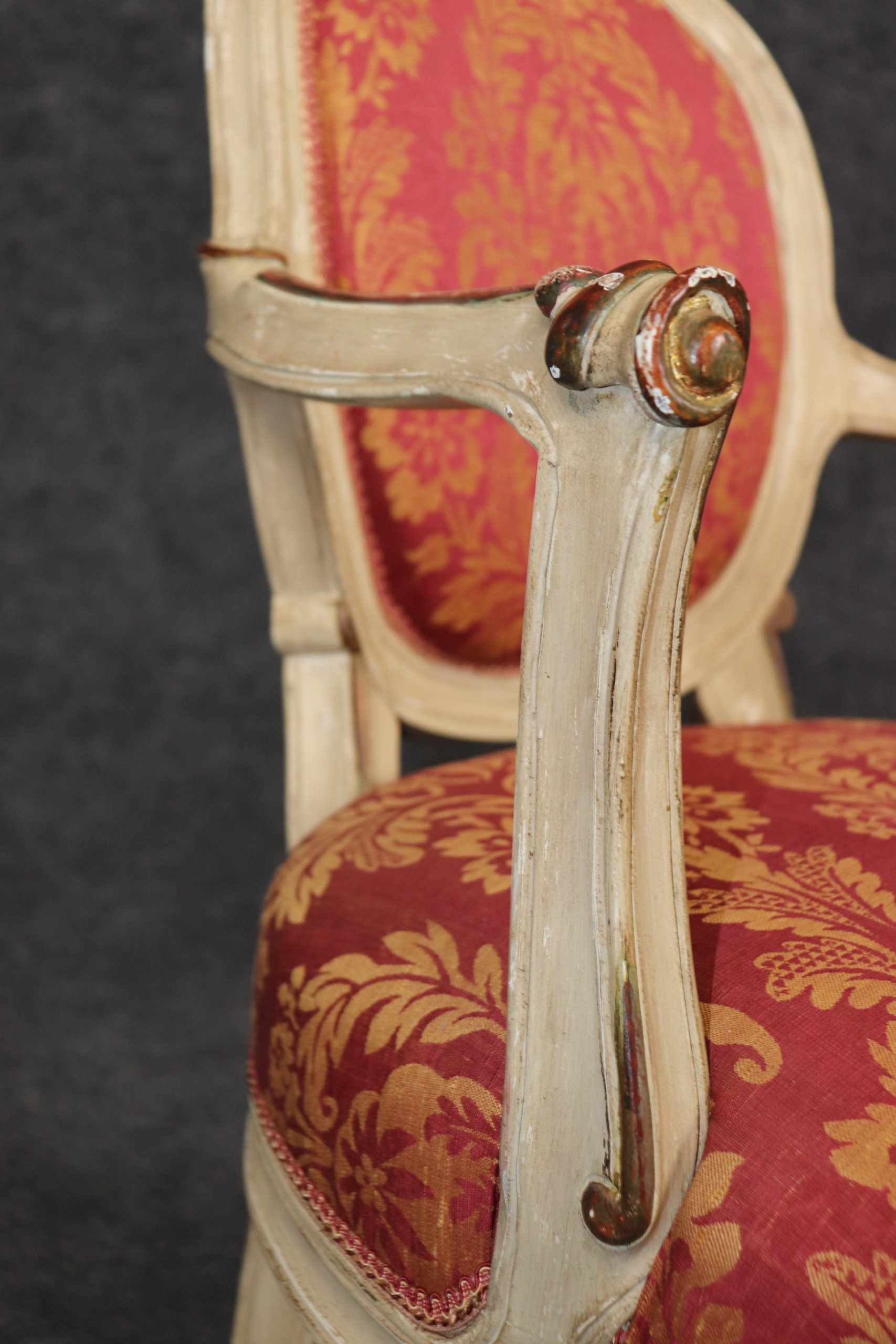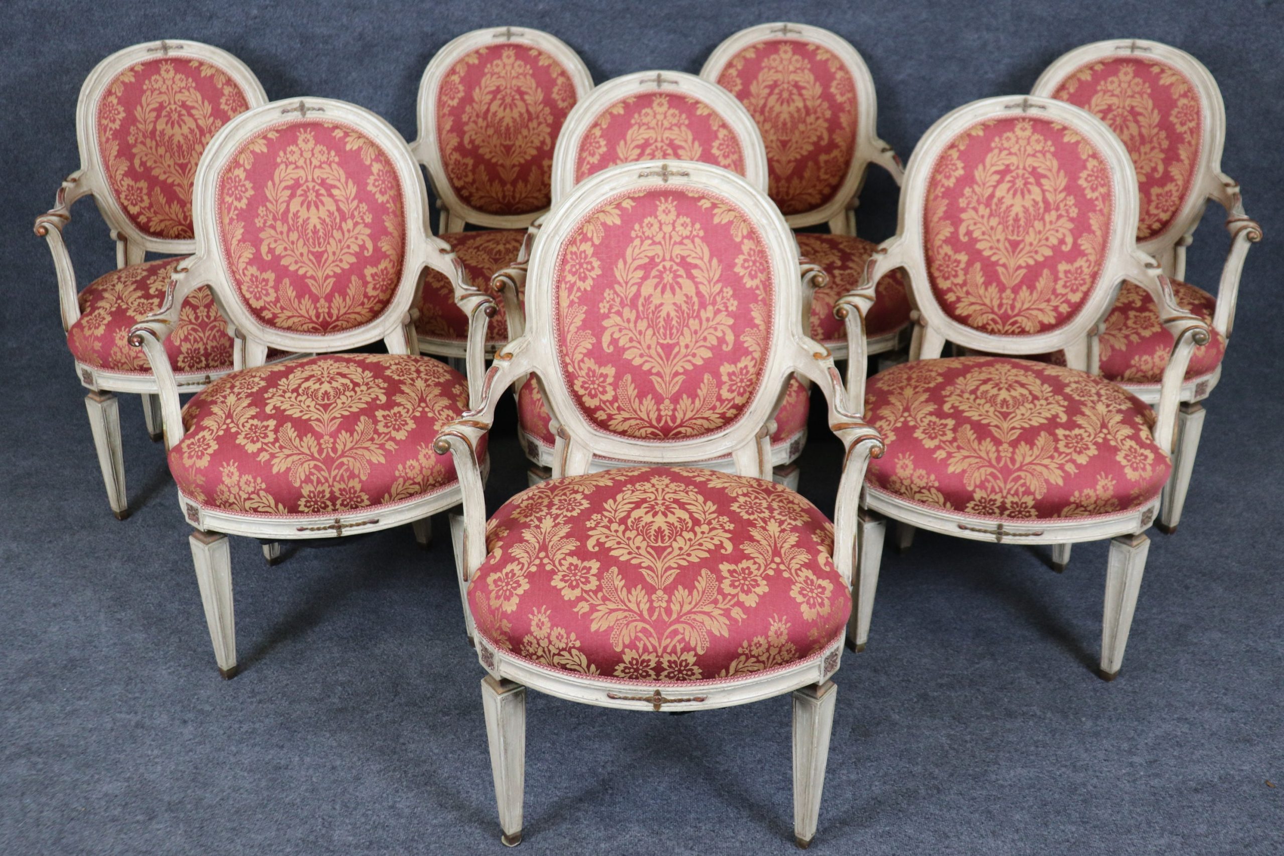 This antique set of 8 Louis XVI style paint decorated dining room chairs is of the highest quality! If you look at the photos provided, you can see the luxurious floral upholstery. These chairs are perfect for you and your home and will bring a sense of luxury and sophistication into your home or place of choosing! These chairs can be used as dining room chairs, kitchen chairs or office chairs as there are 8 armchairs a fairly rare thing to find in a set. Antique furniture and vintage pieces have stood the test of time and this set of chairs is no exception! With their great craftsmanship and quality materials this set will last you and your family for many years to come. The chairs are in good antique condition with light surface scratches, discoloration and minor finish loss as the chairs are a little distressed as to be expected, otherwise good condition. There is also a pull to the upholstery on the back of one chair as shown.