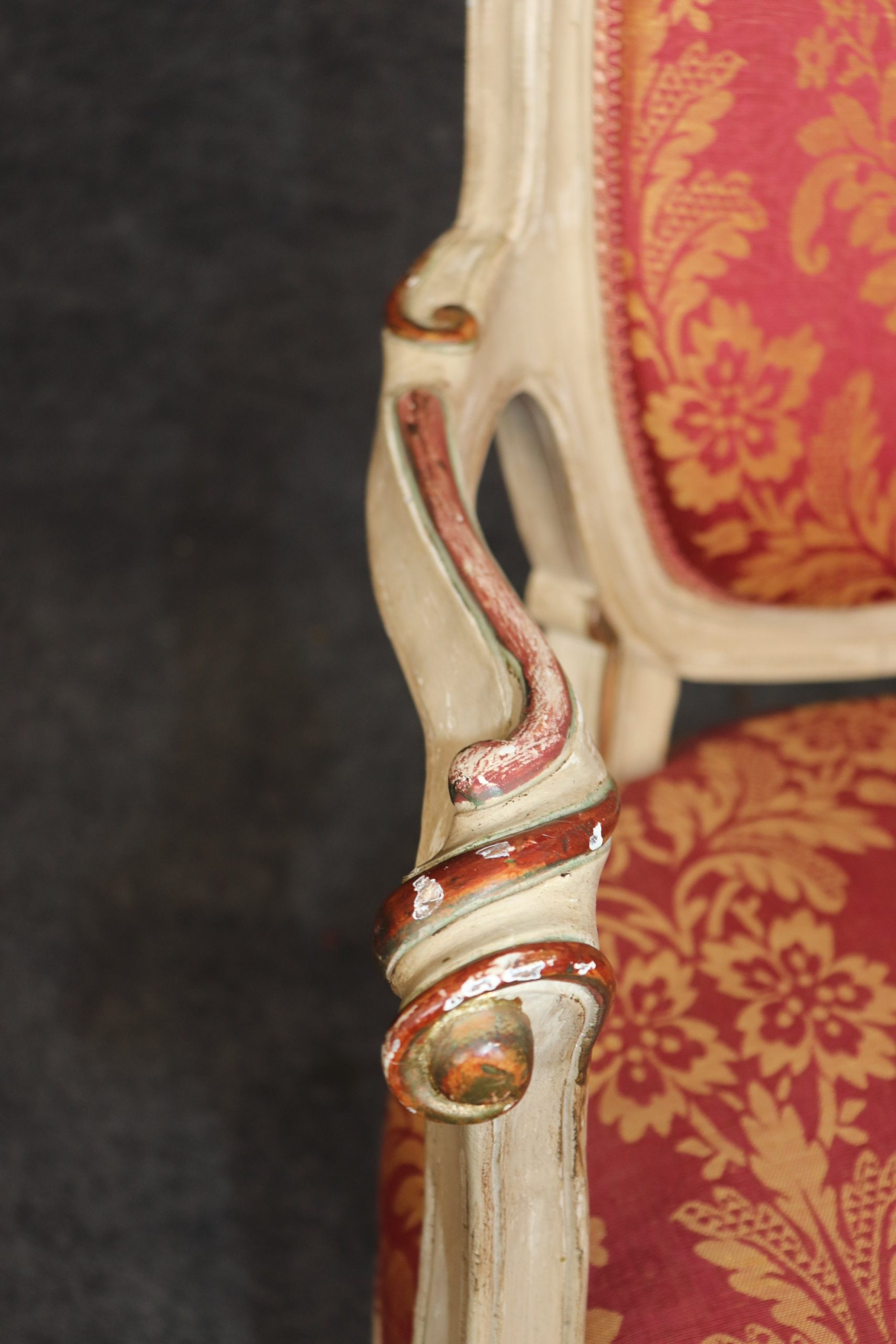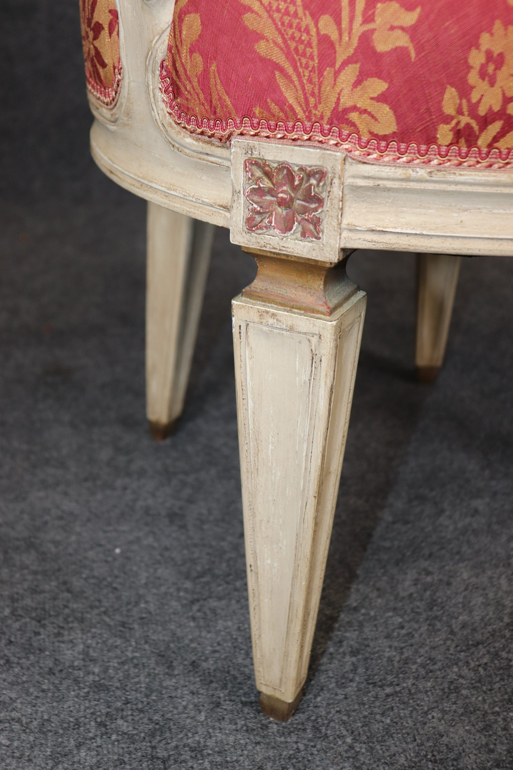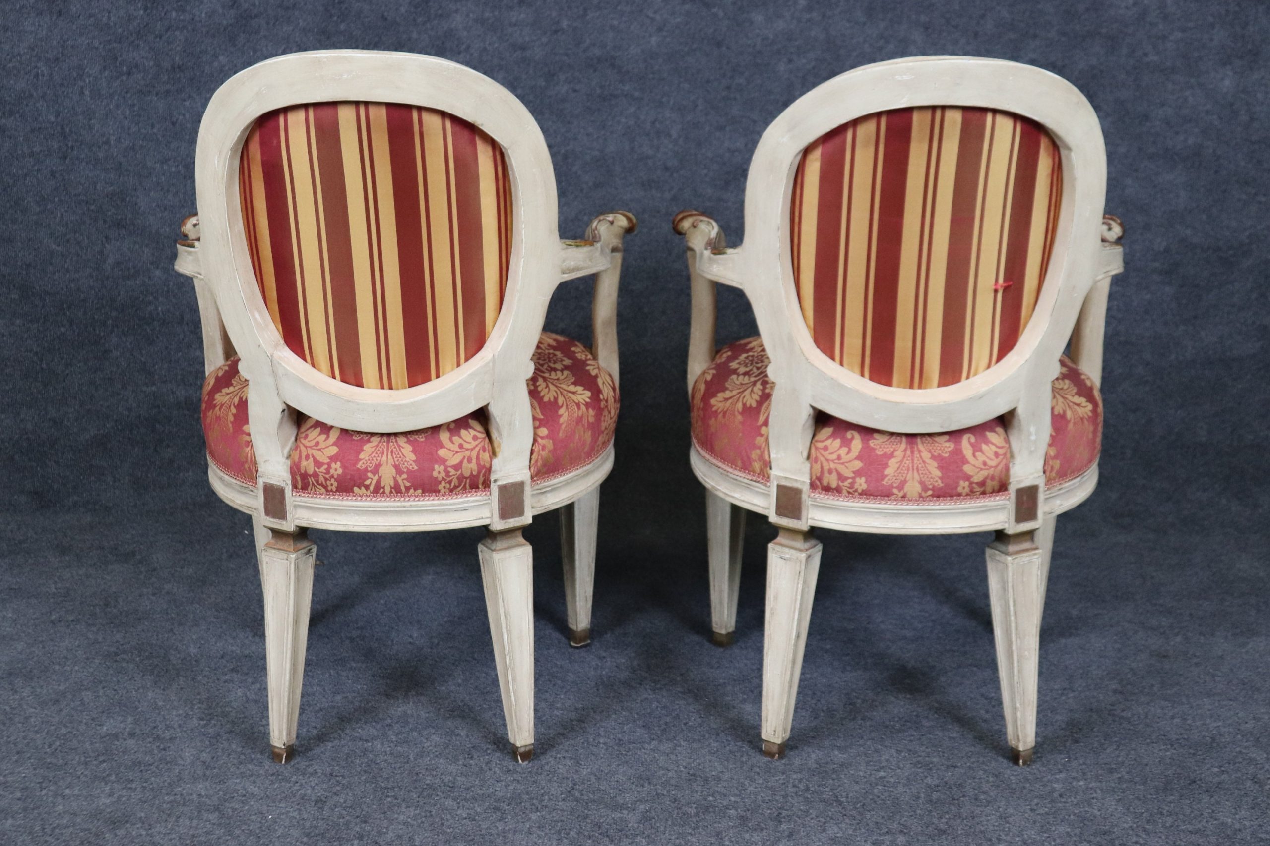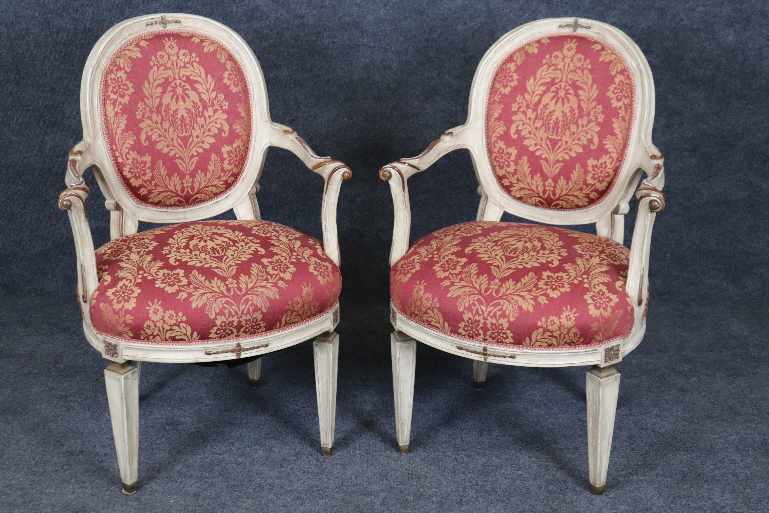 This antique set of 8 Louis XVI style paint decorated dining room chairs is of the highest quality! If you look at the photos provided, you can see the luxurious floral upholstery. These chairs are perfect for you and your home and will bring a sense of luxury and sophistication into your home or place of choosing! These chairs can be used as dining room chairs, kitchen chairs or office chairs as there are 8 armchairs a fairly rare thing to find in a set. Antique furniture and vintage pieces have stood the test of time and this set of chairs is no exception! With their great craftsmanship and quality materials this set will last you and your family for many years to come. The chairs are in good antique condition with light surface scratches, discoloration and minor finish loss as the chairs are a little distressed as to be expected, otherwise good condition. There is also a pull to the upholstery on the back of one chair as shown.