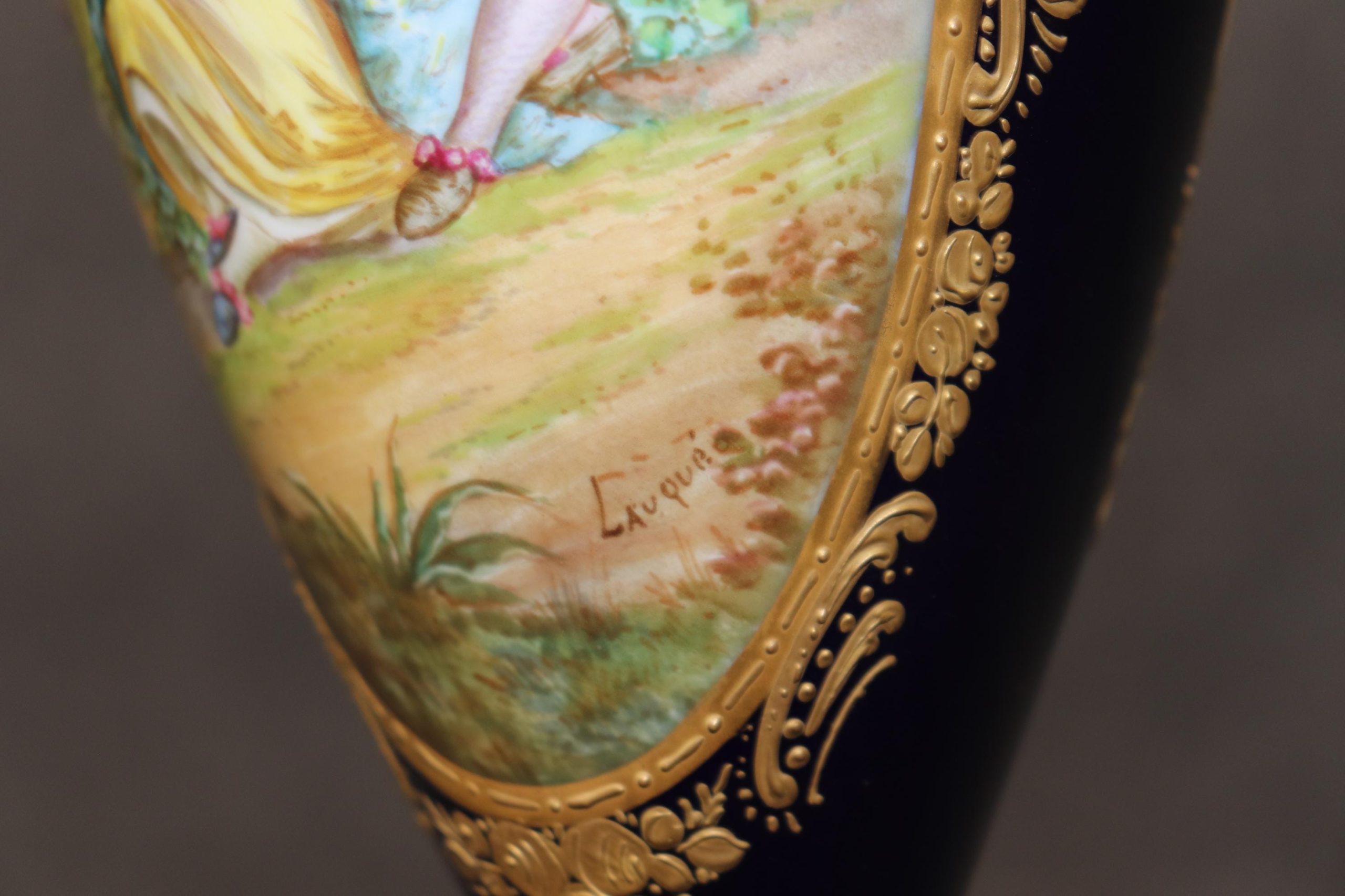 The royal blue glaze that adorns this vase is one of the most coveted and recognizable features of Sèvres porcelain. Known for its deep, rich hue, royal blue was used extensively in the 19th century to evoke a sense of luxury, refinement, and imperial grandeur. The color itself is applied with a high level of expertise, resulting in a perfectly smooth, lustrous finish that captures the light beautifully. Its rich intensity creates a dramatic backdrop for the fine detailing that adorns the vase, highlighting the contrasting decorative elements, particularly the intricate gilding and painted scenes.