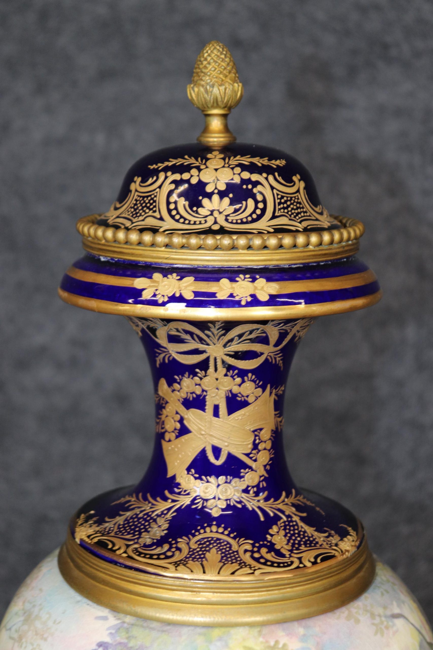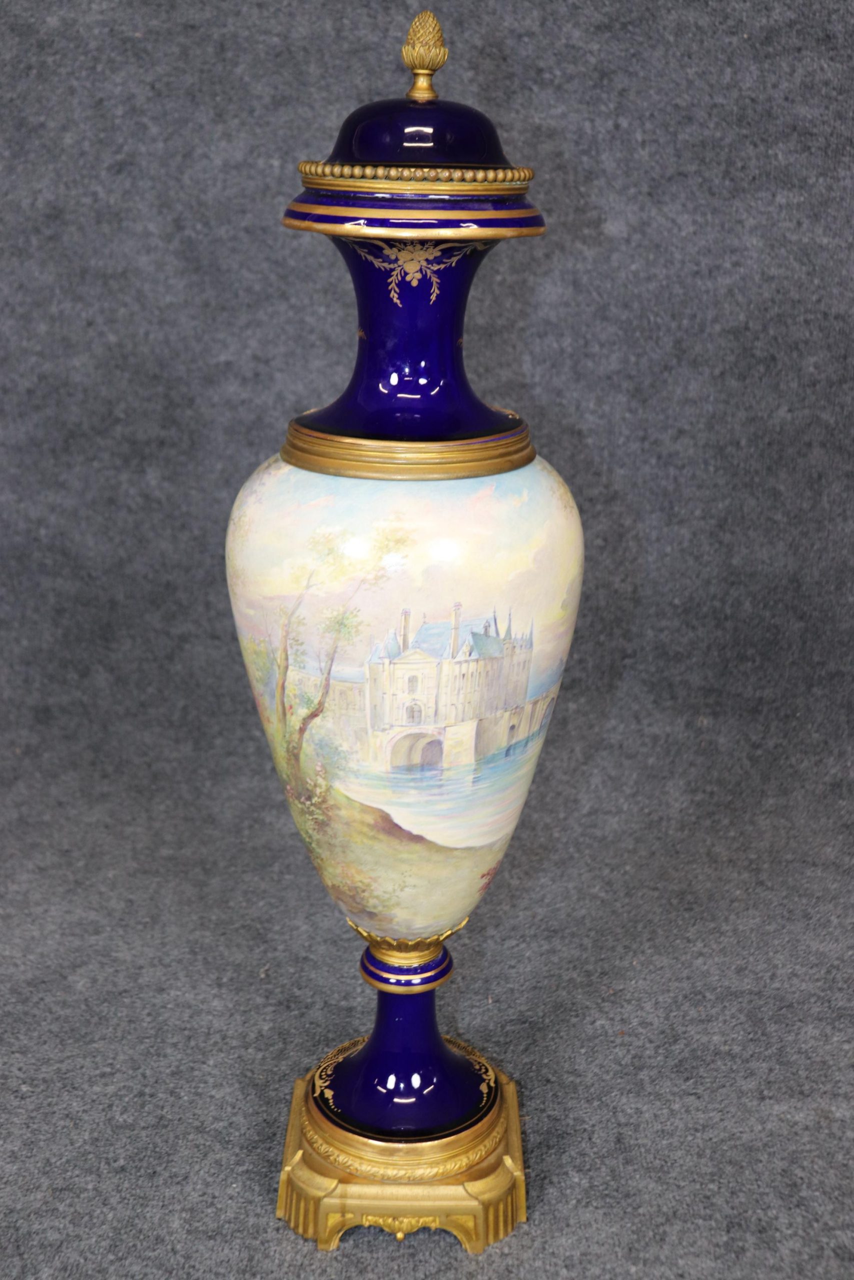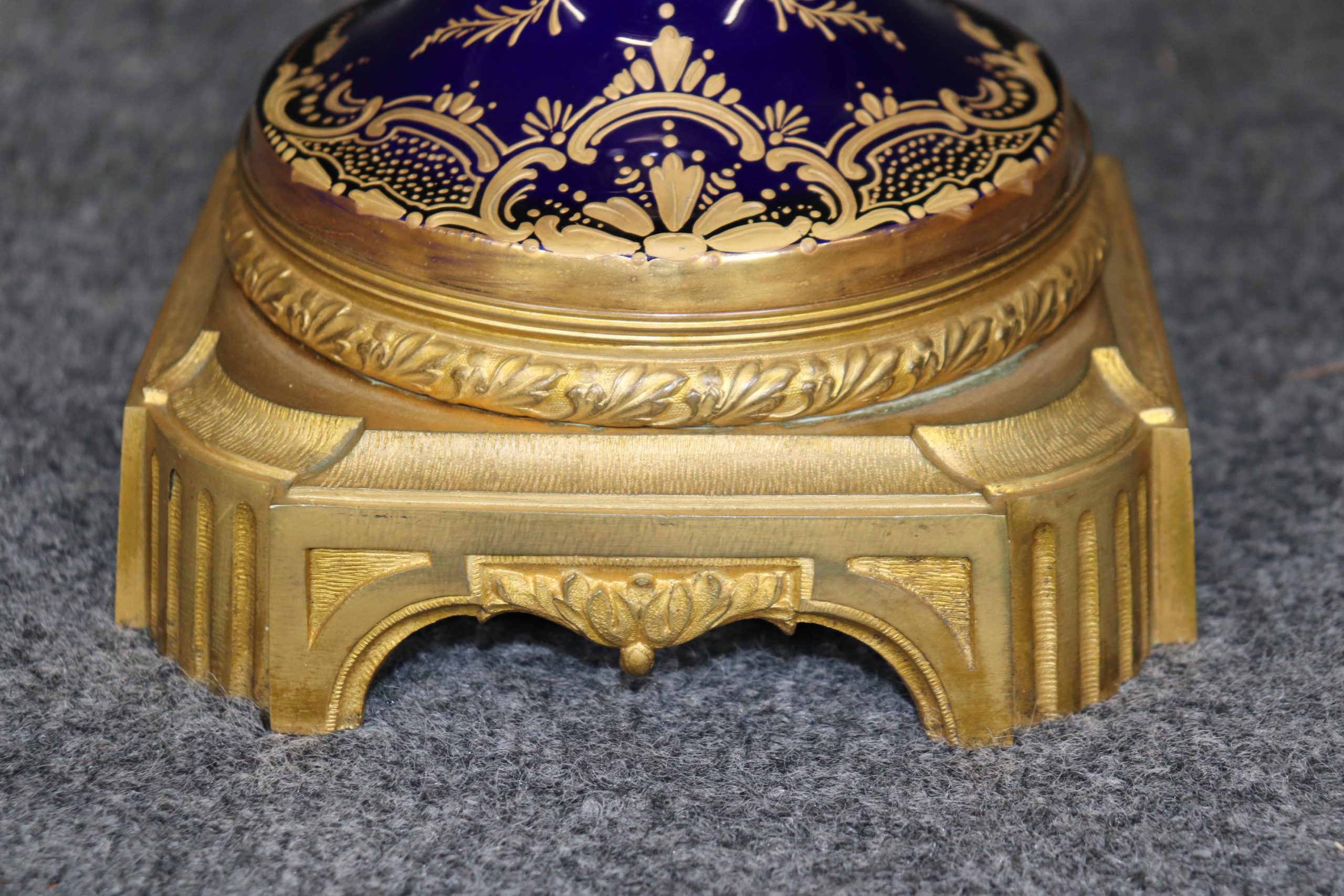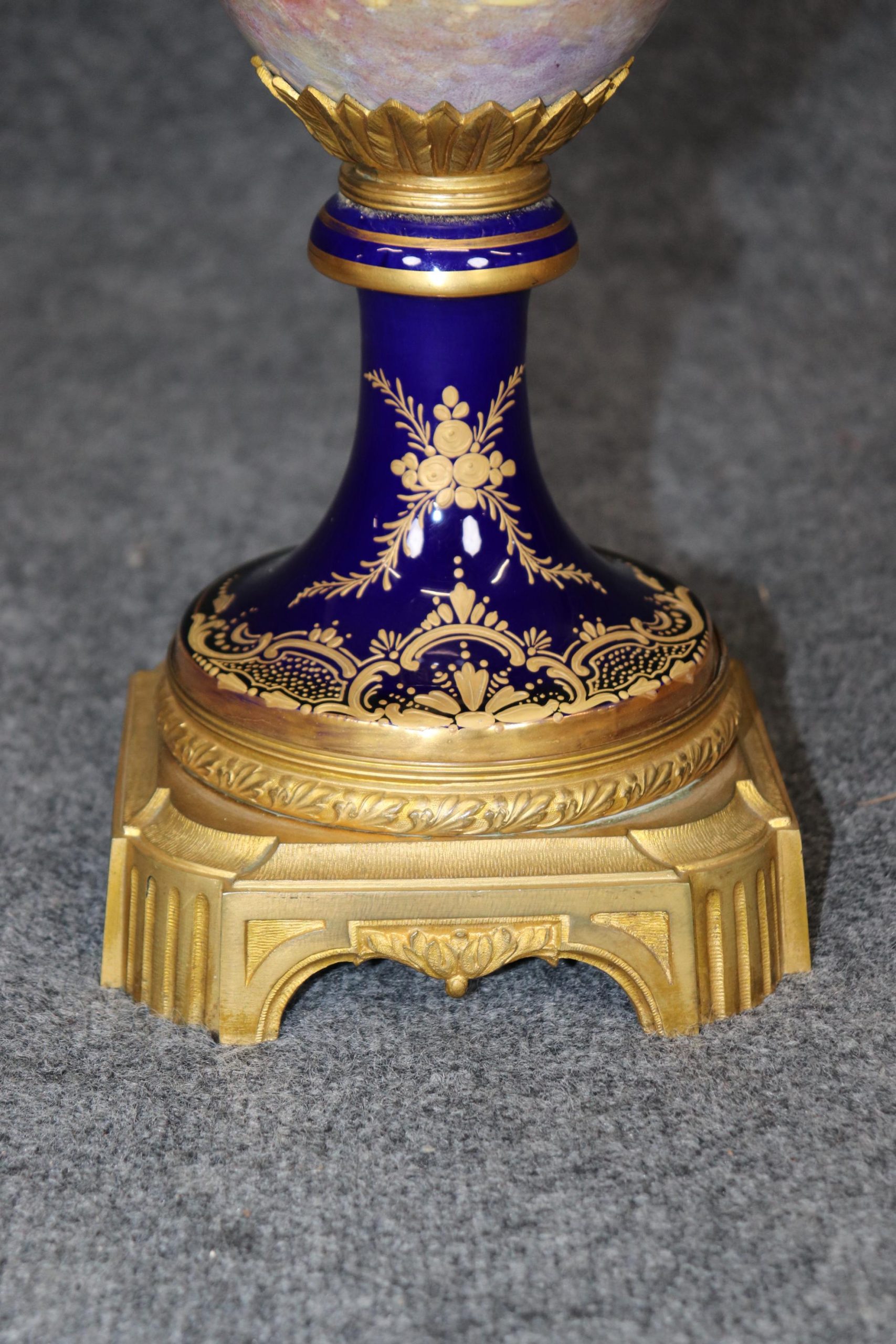 This antique late 19th century royal blue bronze ormolu and porcelain vase is an exquisite representation of the unparalleled craftsmanship and artistic legacy of the renowned Sèvres porcelain factory. Established in the 18th century, the Sèvres factory became synonymous with luxury, refinement, and innovation in porcelain production, and this vase exemplifies the highest standards of 19th-century French porcelain artistry. Featuring the iconic royal blue glaze, this vase combines opulent color with intricate hand-painted decoration, making it a coveted treasure for collectors and connoisseurs alike.