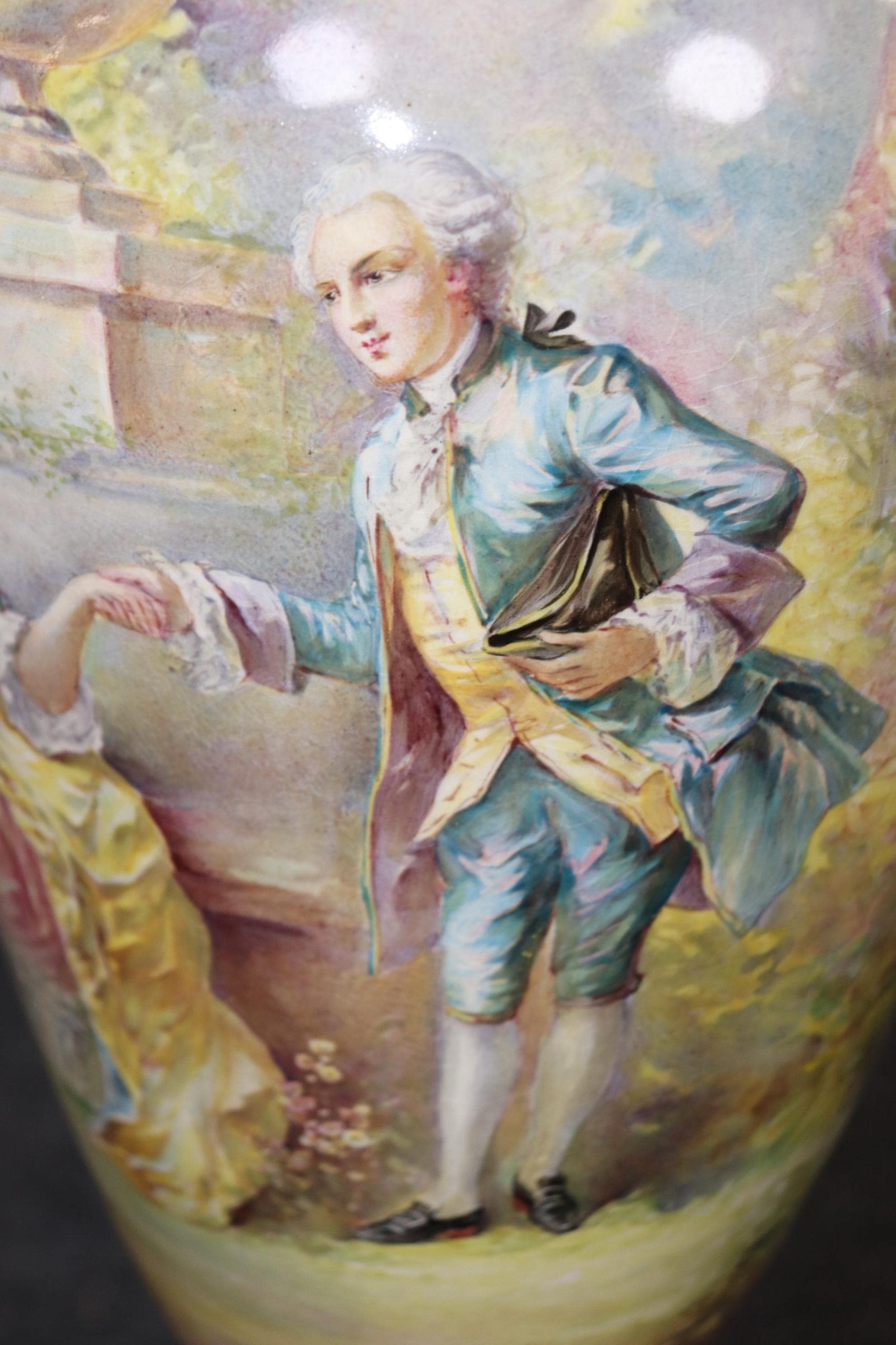 The royal blue glaze that adorns this vase is one of the most coveted and recognizable features of Sèvres porcelain. Known for its deep, rich hue, royal blue was used extensively in the 19th century to evoke a sense of luxury, refinement, and imperial grandeur. The color itself is applied with a high level of expertise, resulting in a perfectly smooth, lustrous finish that captures the light beautifully. Its rich intensity creates a dramatic backdrop for the fine detailing that adorns the vase, highlighting the contrasting decorative elements, particularly the intricate gilding and painted scenes.