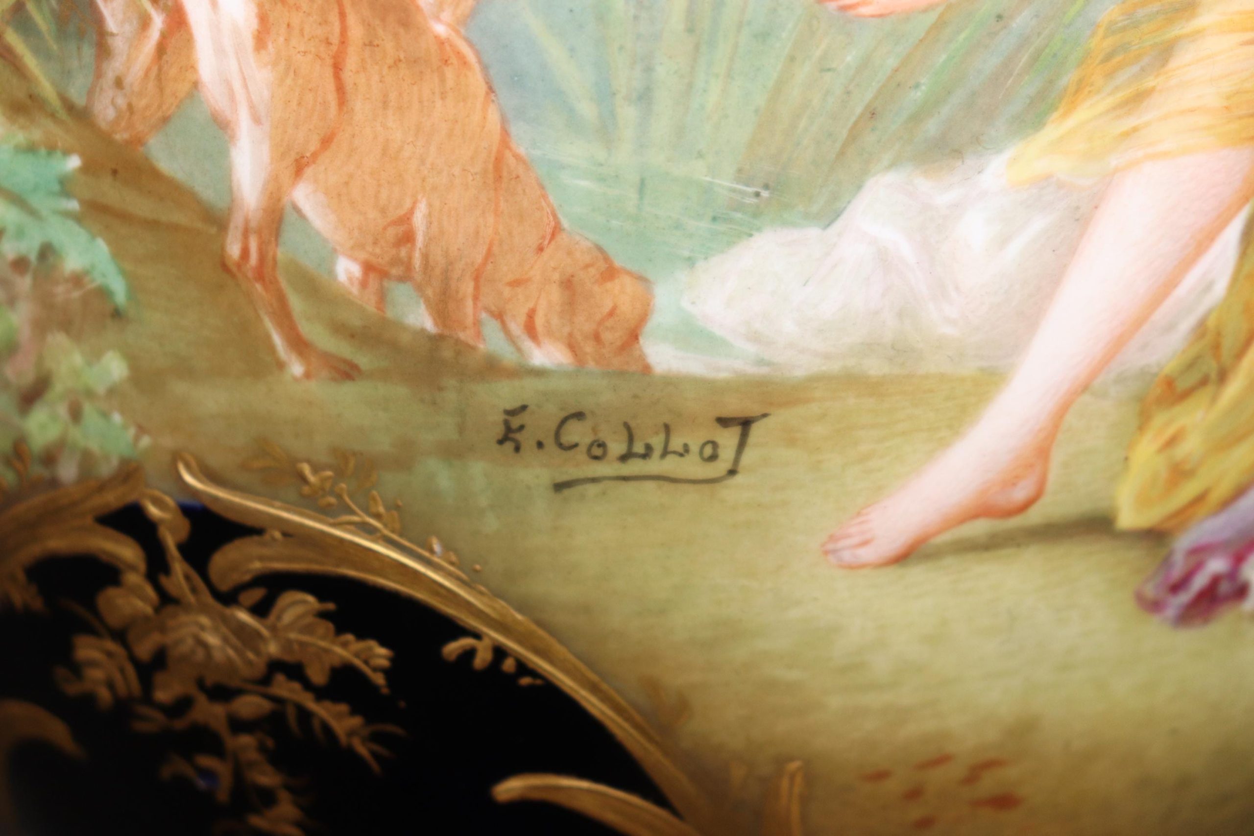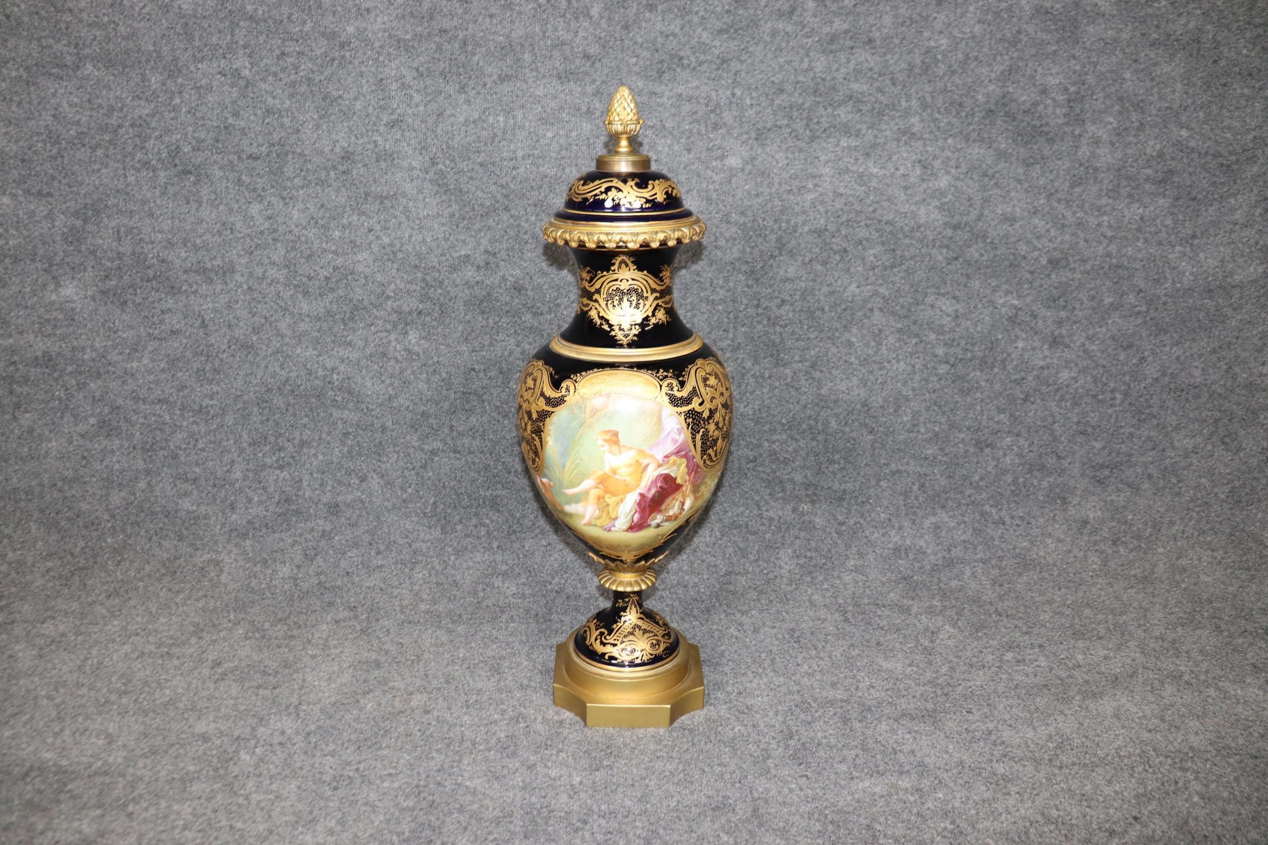 This antique late 19th century royal blue bronze ormolu and porcelain vase is more than just a decorative object—it’s a piece of history. Combining extraordinary craftsmanship, timeless design, and exquisite materials, this vase embodies the best of French porcelain artistry during the 19th century. With its striking royal blue color, intricate hand-painted designs by E.Collot, this vase remains a testament to the enduring legacy of Sèvres and the luxurious tastes of the aristocracy. Its beauty, rarity, and craftsmanship make it a highly prized collector’s item, sought after by those who appreciate the elegance and sophistication of the finest porcelain ever made.