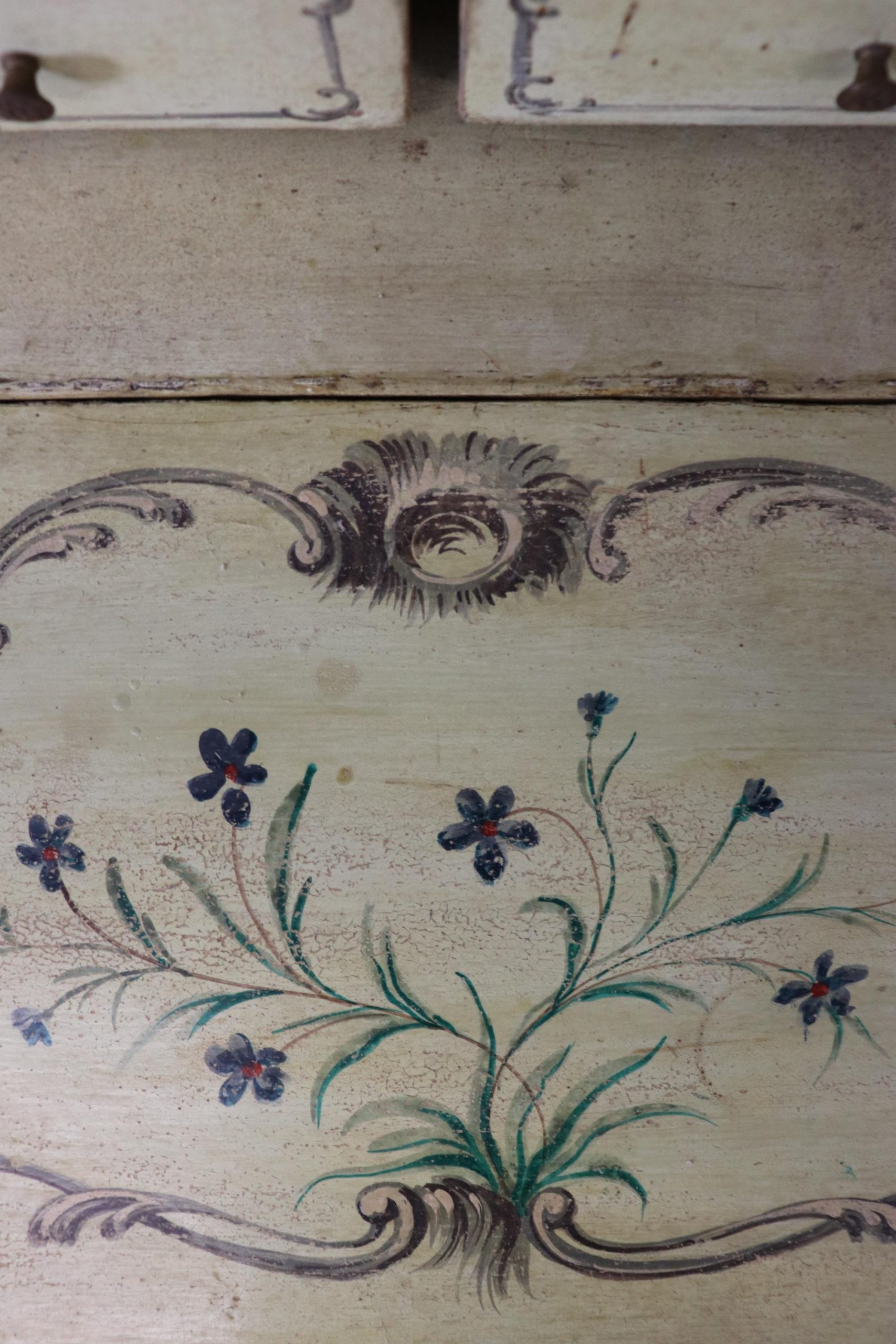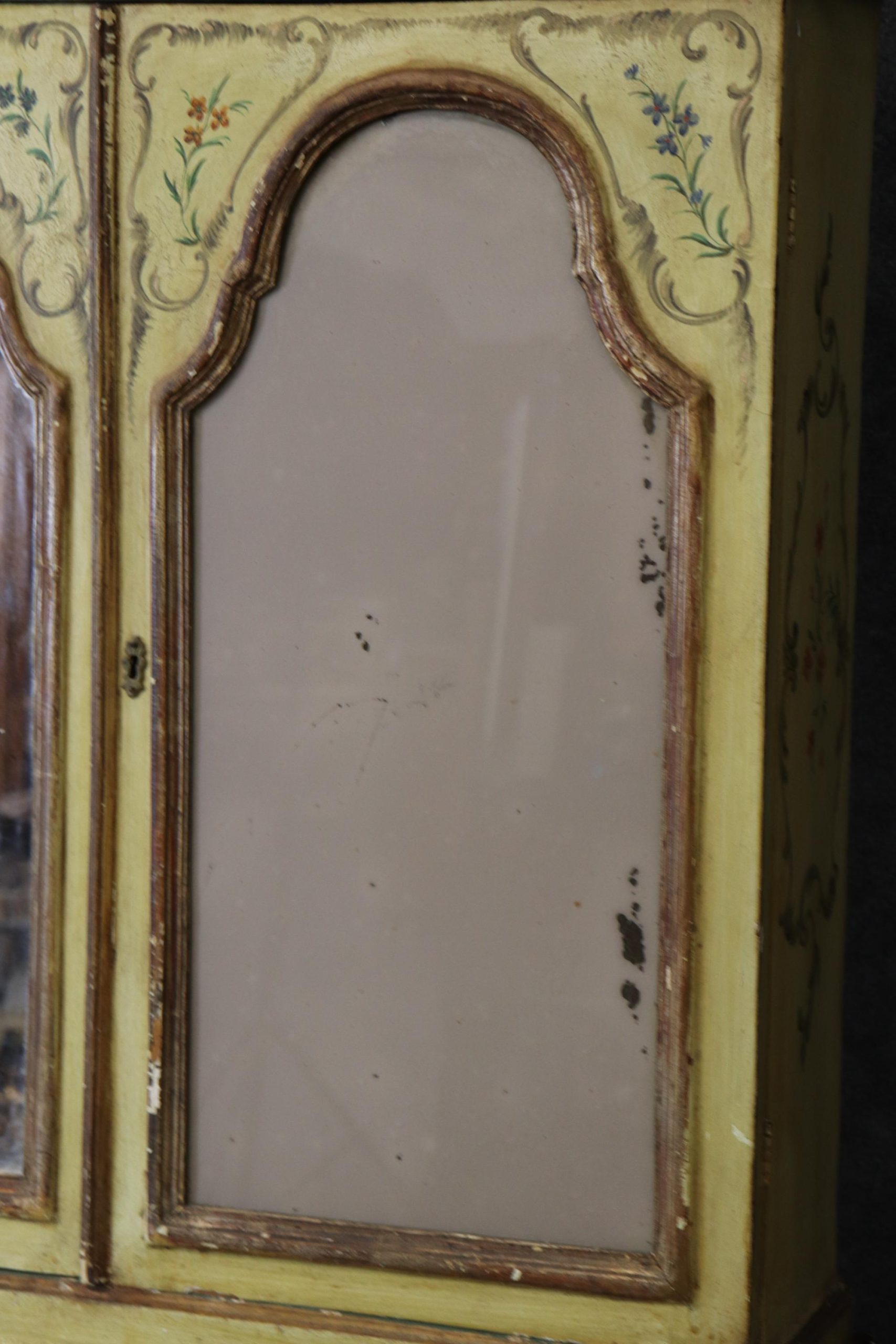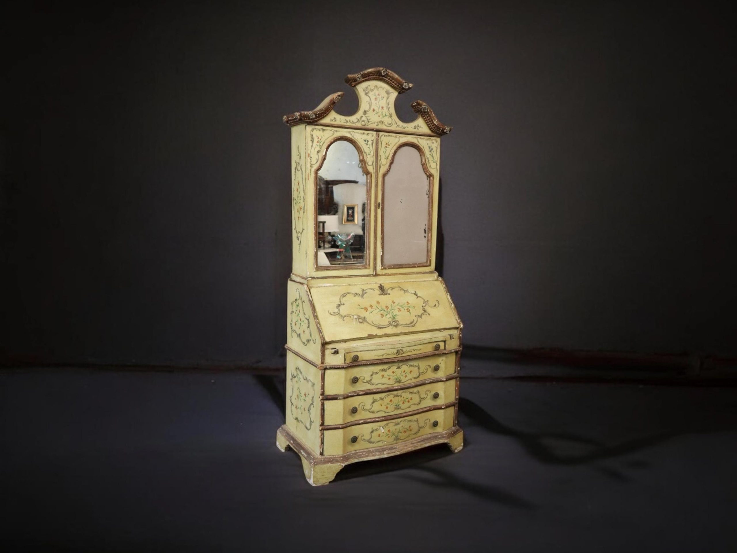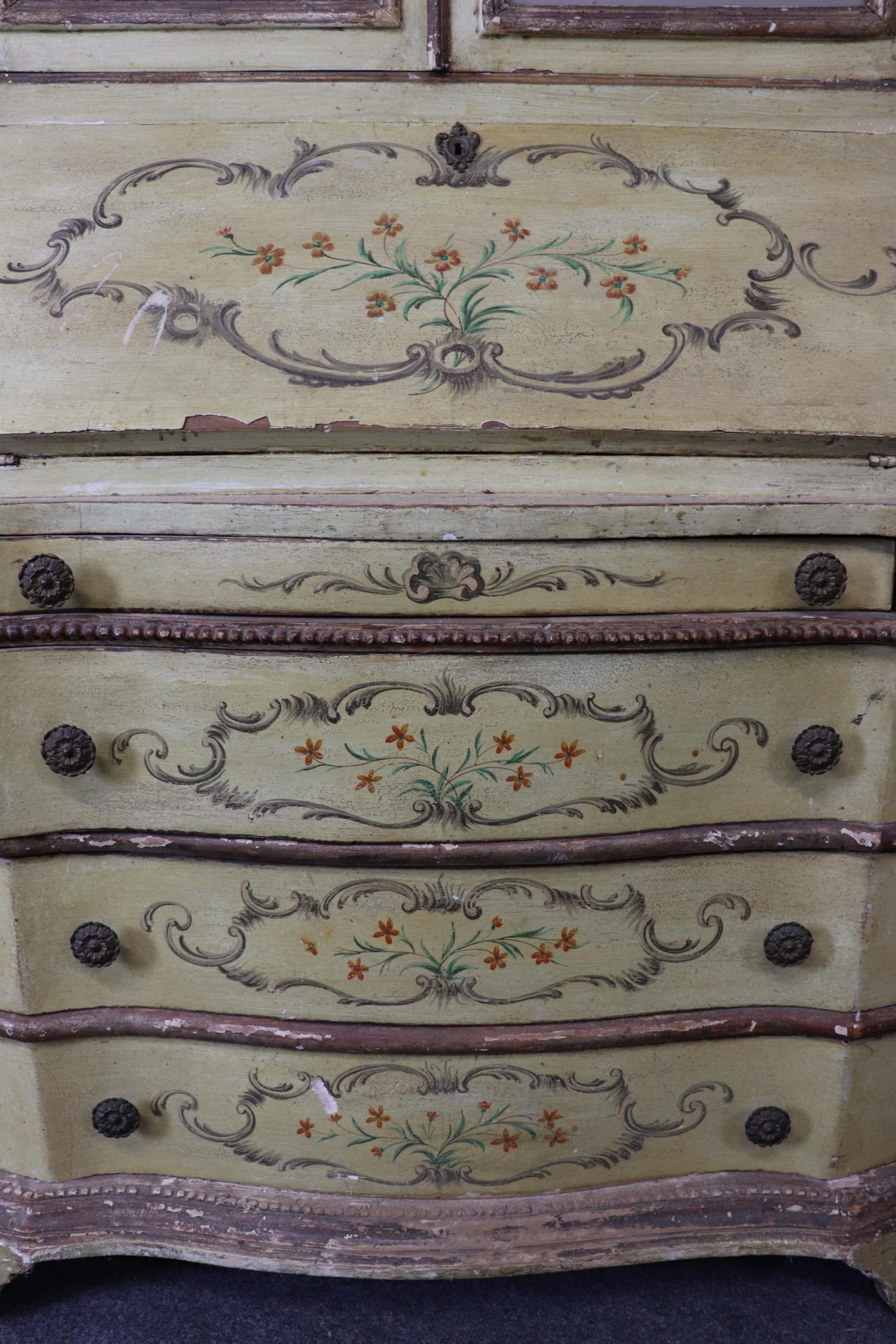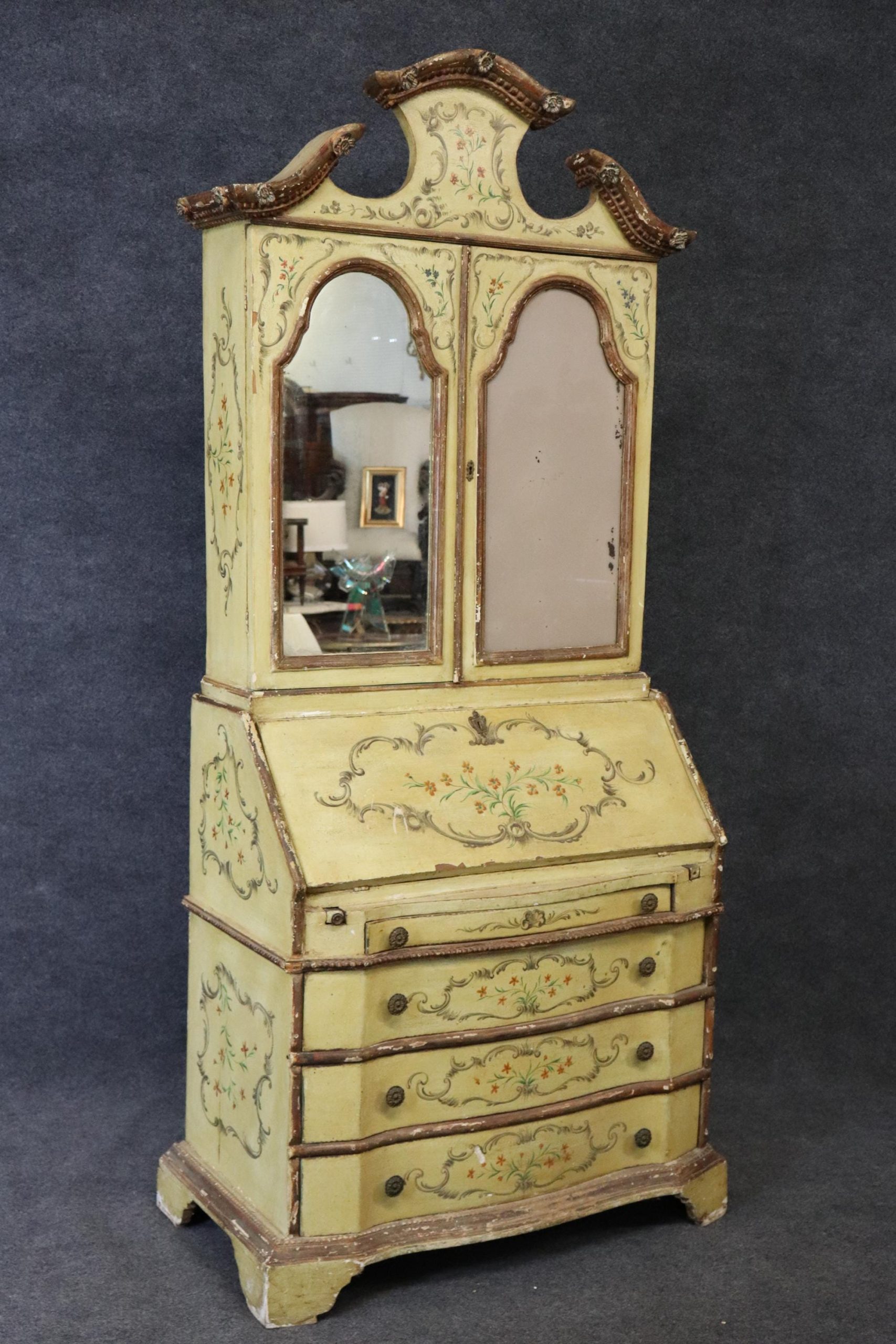 This antique turn of the century Italian Venetian style paint decorated secretary desk is made of the highest quality! This piece is perfect for any living room, bedroom, office, kitchen or large bathroom and is equipped with 2 shelves on the top section over a drop desk and 4 drawers at the bottom, perfect for storing your personal belongings all while bringing a sense on luxury and class into your home! This piece is bound to bring a sense of creativity and character into your home or place of choosing and will surely have your guests mesmerized by its attention to detail. Antique furniture and vintage furniture has stood the test of time and this piece is no exception! With its quality materials and great craftsmanship this desk will last you and your family many years to come. The secretary is in antique condition with normal age related chips, finish losses and wear as to be expected with an antique item. The one door is missing the mirror, as shown in photos.