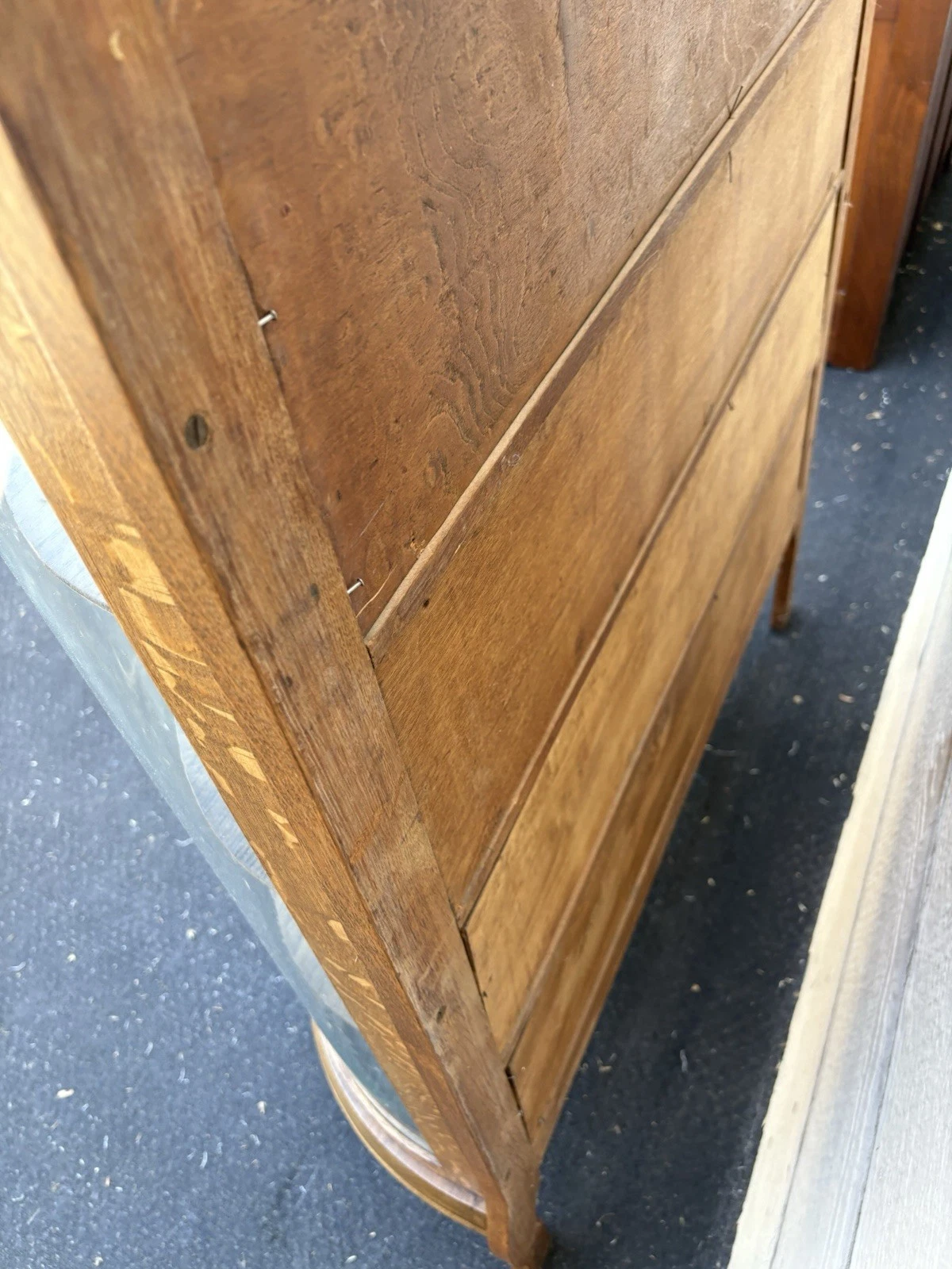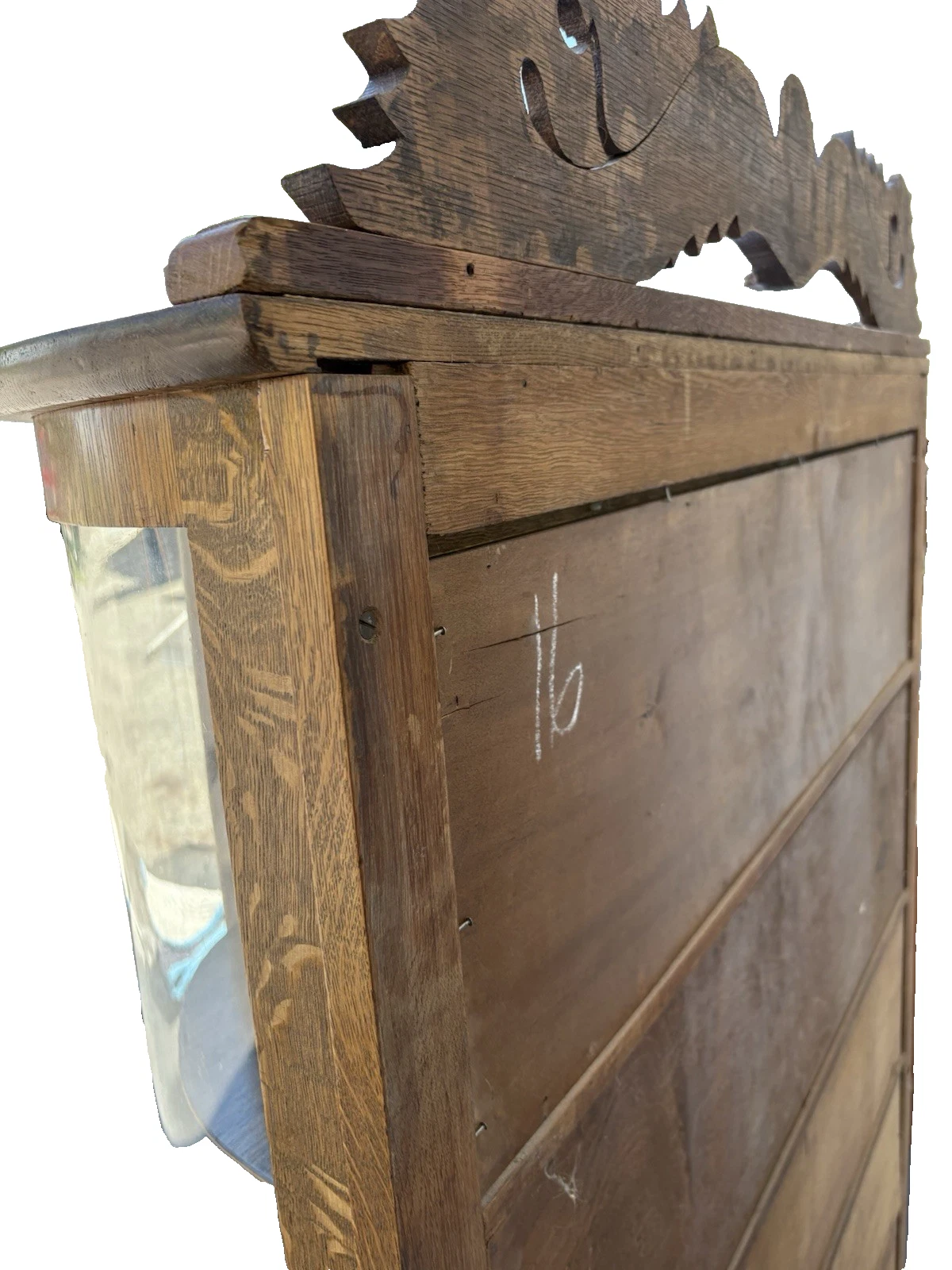 Step into a bygone era with this exquisite Victorian bow glass curio cabinet, a stunning testament to early 20th-century craftsmanship. Handcrafted from rich oak, its gracefully curved glass showcases the treasures within while the intricately carved angel cherub backsplash adds a touch of ethereal charm. Each of the four shelves offers ample space for displaying your favorite collectibles, making it not just a cabinet, but a conversation piece that brings history and elegance into your home. Its timeless design and attention to detail reflect the artistry of a period dedicated to beauty and craftsmanship.