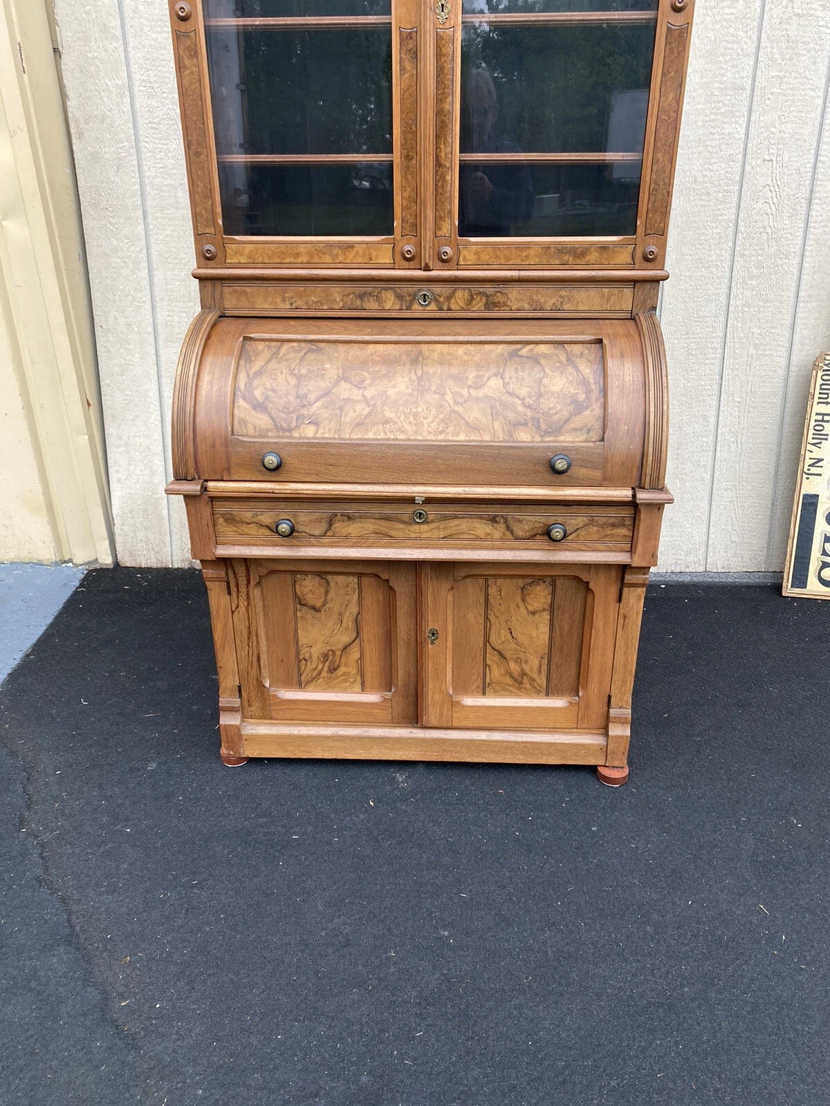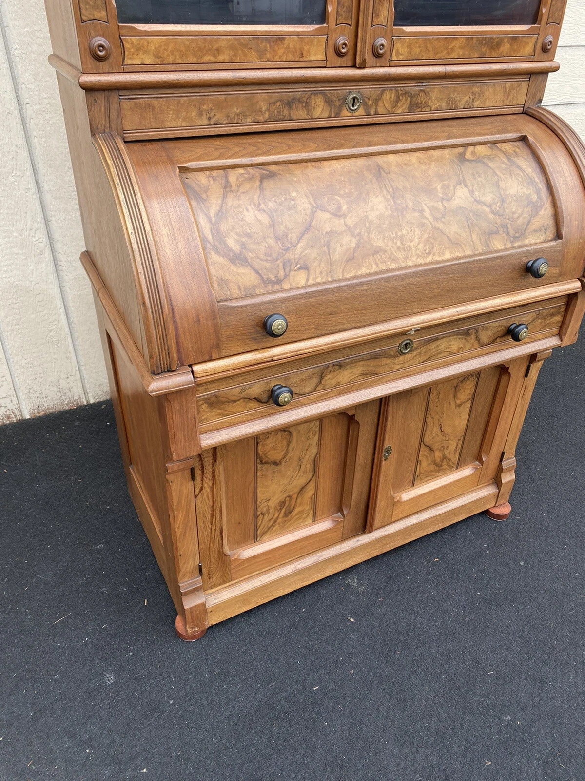 This exquisite Victorian burled walnut cylinder desk, crafted in the late 1800s, showcases the remarkable artistry of its time with rich, swirling grain patterns that tell a story of both elegance and durability. Featuring a charming bookcase top with four doors and a single, functional drawer, this desk not only serves as a practical workspace but also as a stunning focal point in any room. The included keys for locking both the top and bottom add a touch of historical intrigue, making it a unique treasure for collectors and enthusiasts alike. Embrace the warmth of history with this beautiful piece that embodies the craftsmanship of a bygone era.