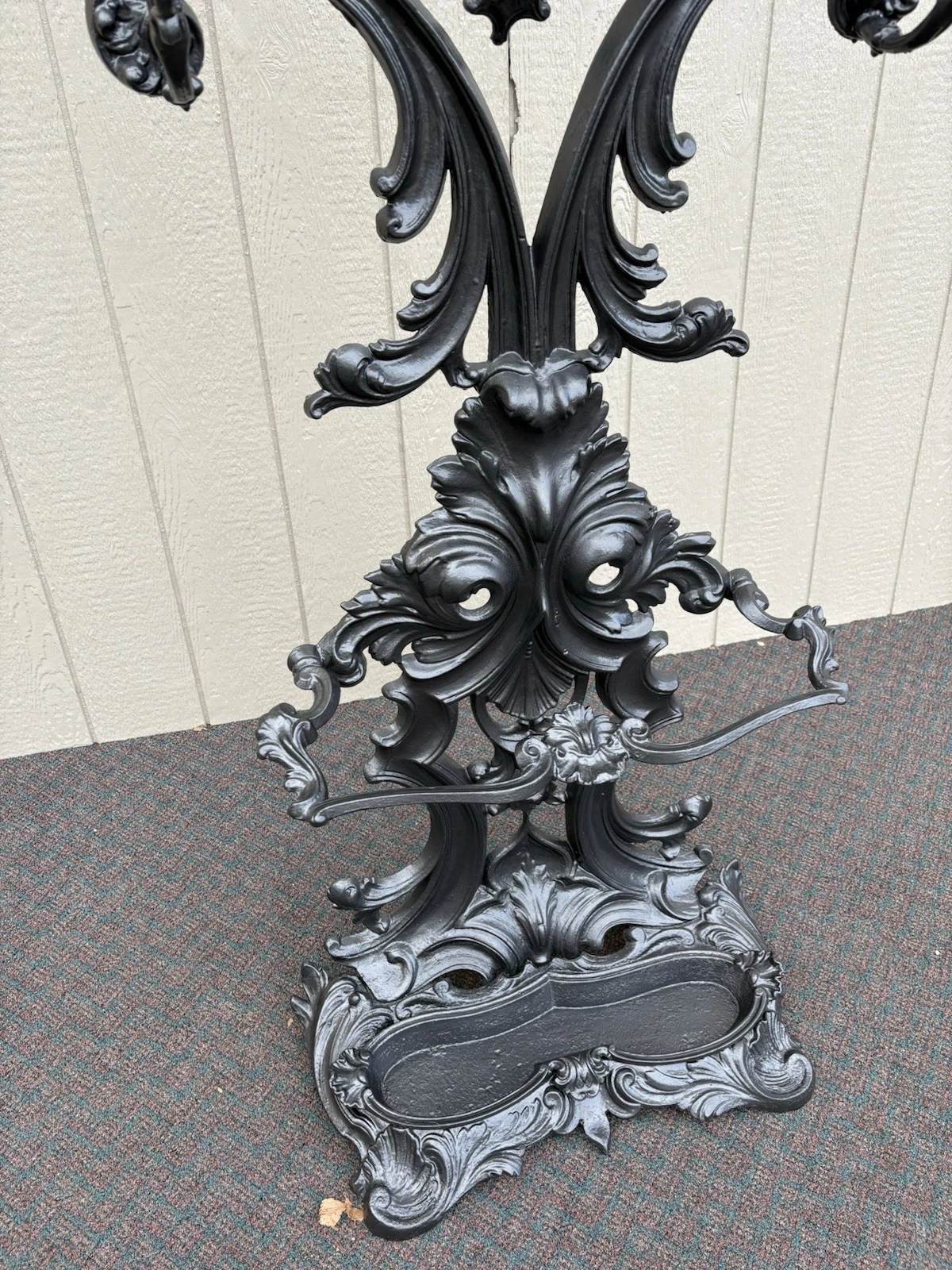 Step into the elegance of the Victorian era with this stunning cast iron hall tree, complete with a beautifully framed mirror and practical umbrella holders. Handcrafted with meticulous attention to detail, the intricate designs on the sturdy cast iron showcase the artistry of a bygone age, making it not just a functional piece but a timeless statement for any entryway. This charming relic, dating back to the early 1900s, invites warmth and character into your home, embodying the spirit of family gatherings and cherished moments. Let this exquisite hat rack be a welcoming sight for your guests, combining beauty with practicality in a way that only antiques can.