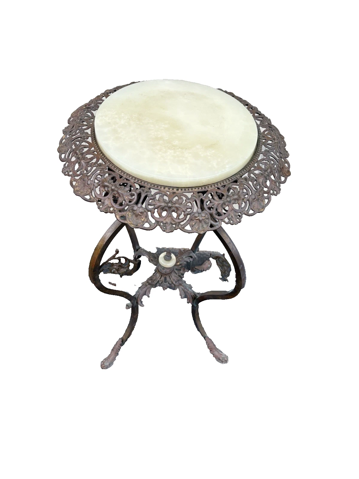 This charming Antique Victorian Marble Top Lamp Table Stand, crafted between 1900 and 1919 in the United States, embodies the elegance of a bygone era. Its exquisite marble tabletop is framed by a sturdy metal base, showcasing the skilled craftsmanship of the Victorian period. The table’s refined silhouette and antique finish make it a versatile addition, perfect for any room in your home. Whether serving as a lamp stand or an accent piece, this table invites warmth and character, reflecting the love and history of family gatherings around it.
