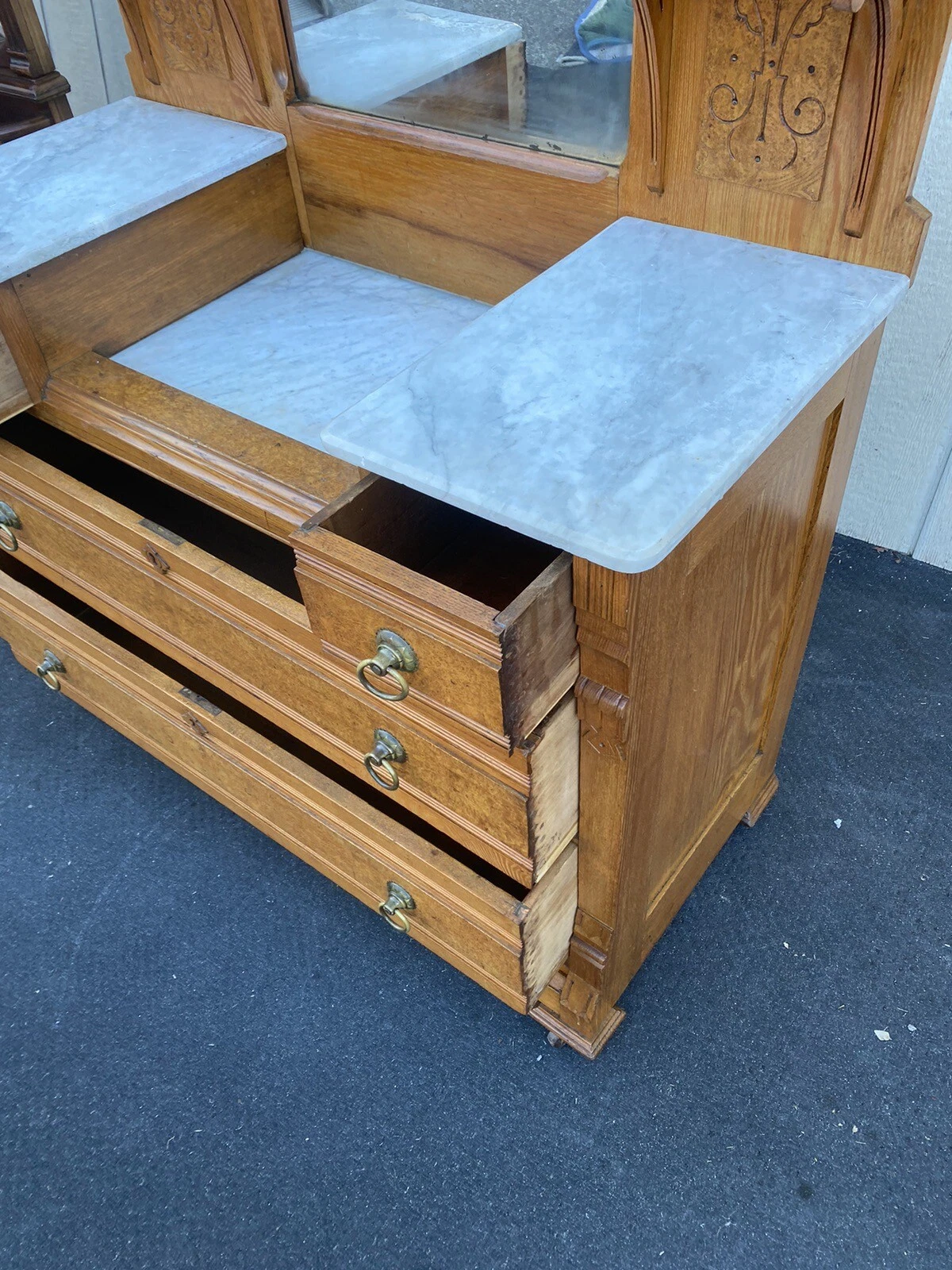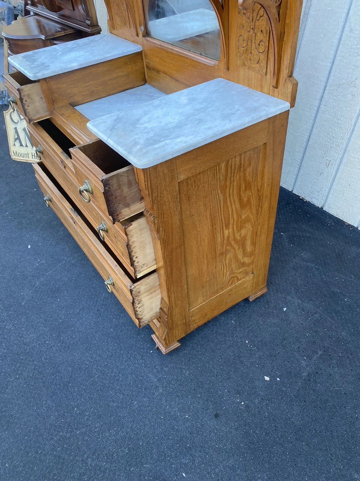 This charming antique Victorian oak dresser, crafted in the early 1900s, beautifully marries functionality with timeless elegance. Adorned with a graceful mirror, it features four spacious drawers that showcase meticulous craftsmanship, ensuring both durability and style. The rich oak finish highlights the natural grain, adding warmth to any room, while subtle signs of age tell the story of its journey through time. A perfect blend of history and practicality, this dresser is not just a piece of furniture but a cherished heirloom waiting to find its new home.