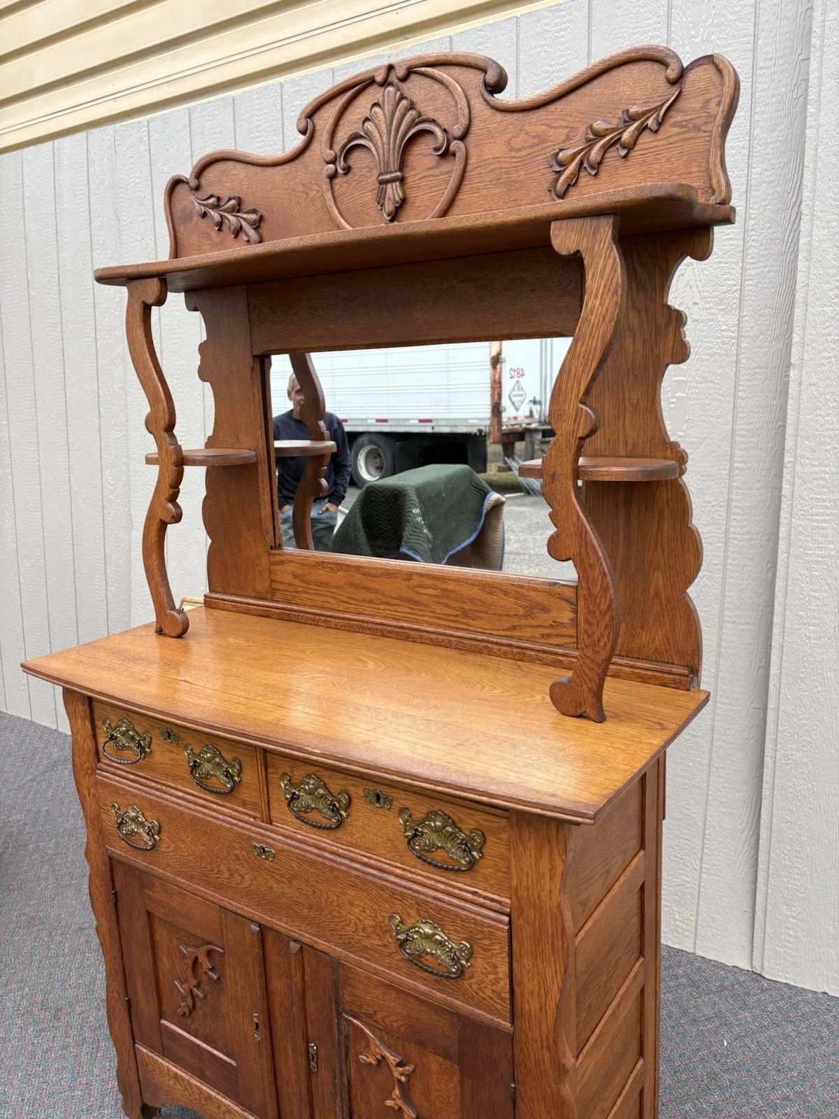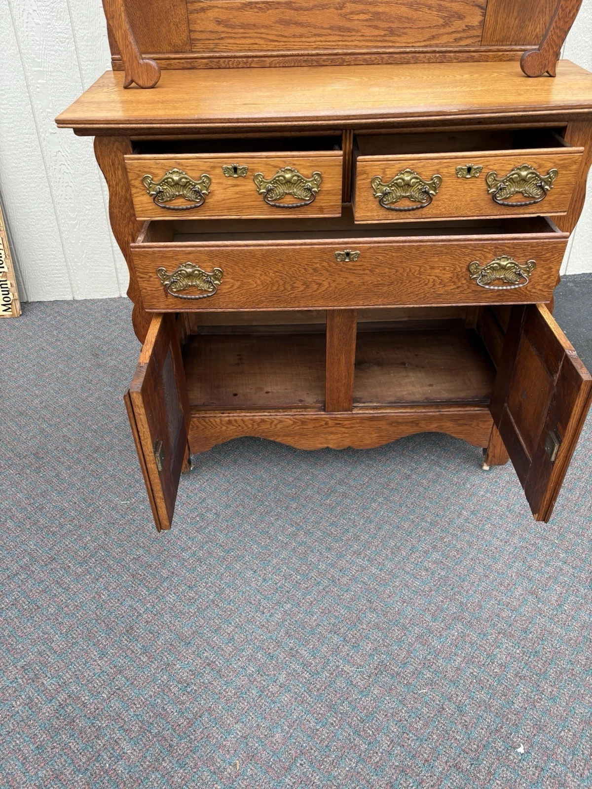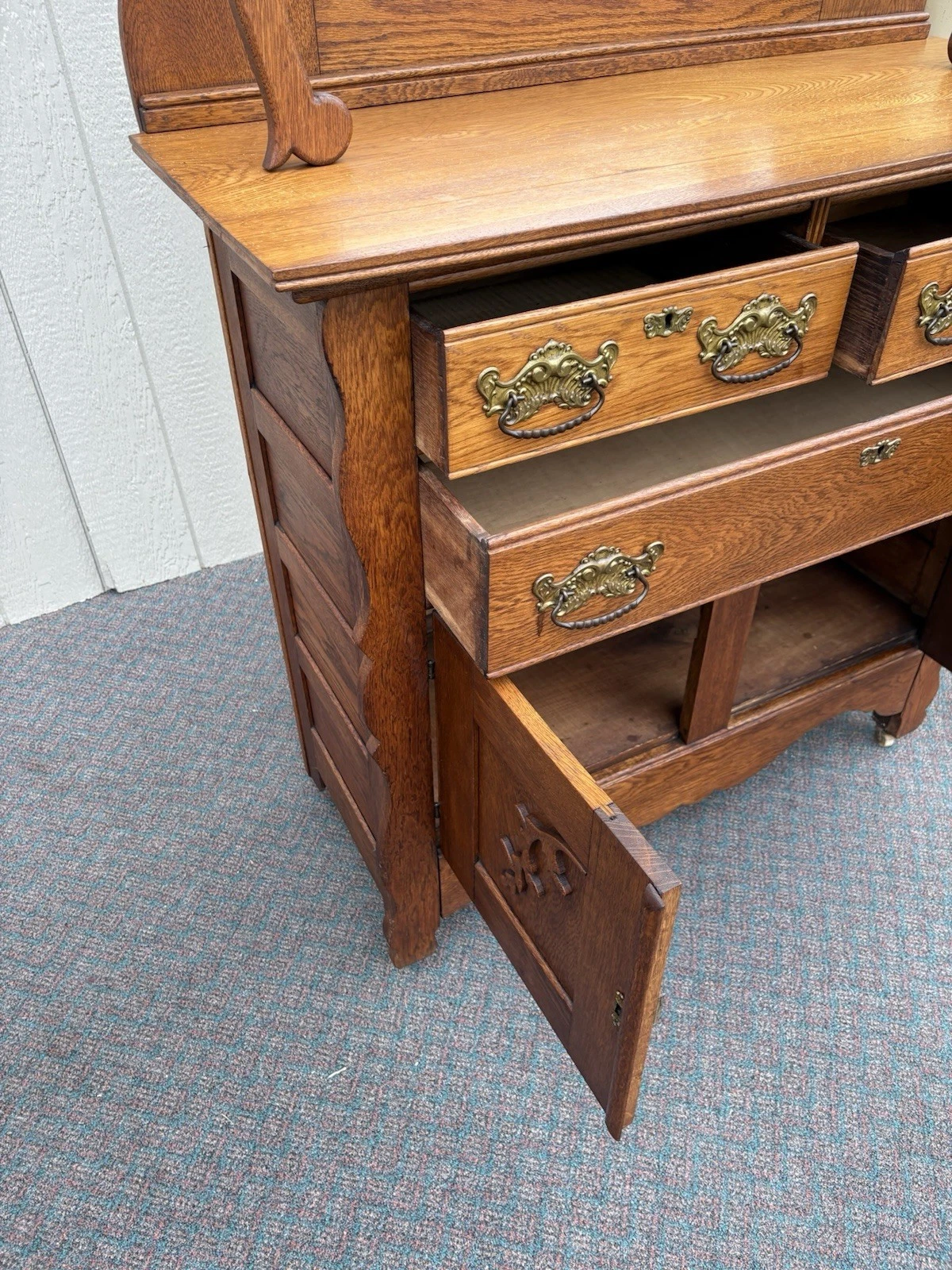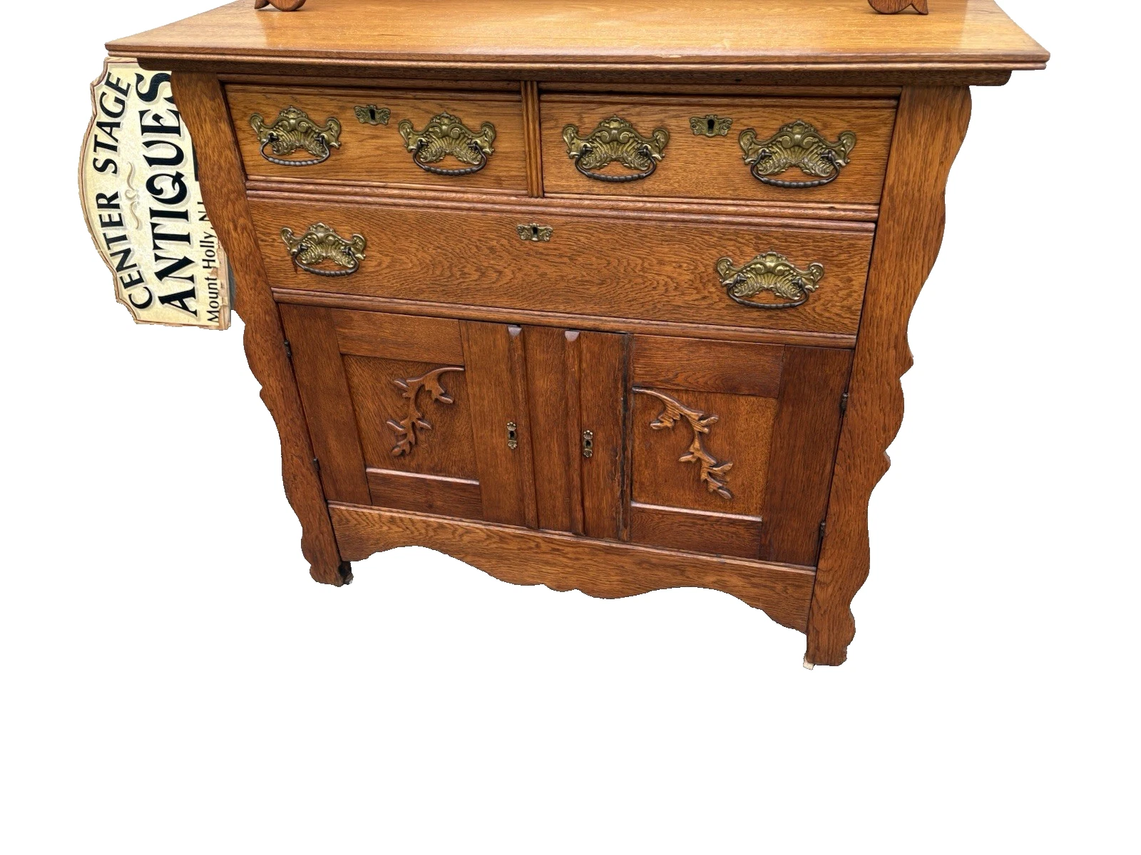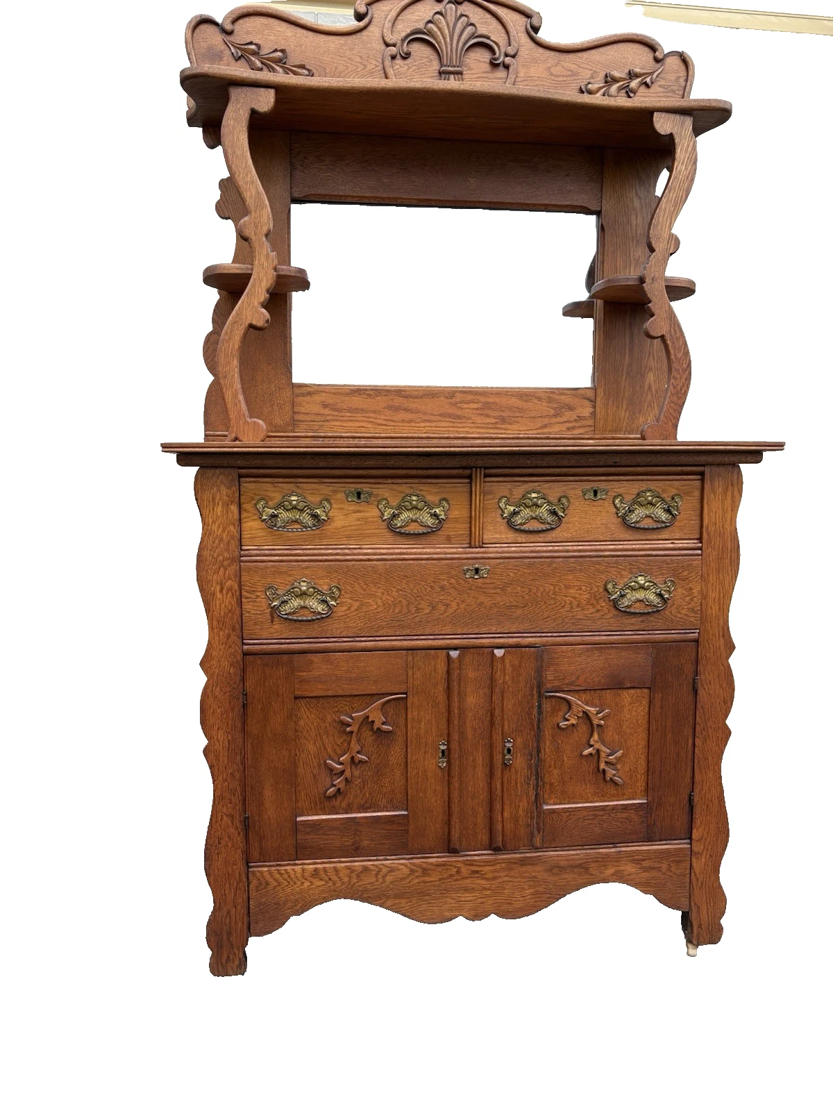 This exquisite Antique Victorian Oak Sideboard Server Cabinet, handcrafted in the late 19th century, showcases the meticulous artistry of its era with elegant lines and rich, warm wood tones. With three spacious drawers and two beautifully adorned doors, it offers both functionality and charm, making it a perfect focal point for any dining room or entryway. The sturdy construction and intricate detailing reflect the craftsmanship of a bygone time, inviting you to appreciate its historical significance while adding a touch of vintage elegance to your home.