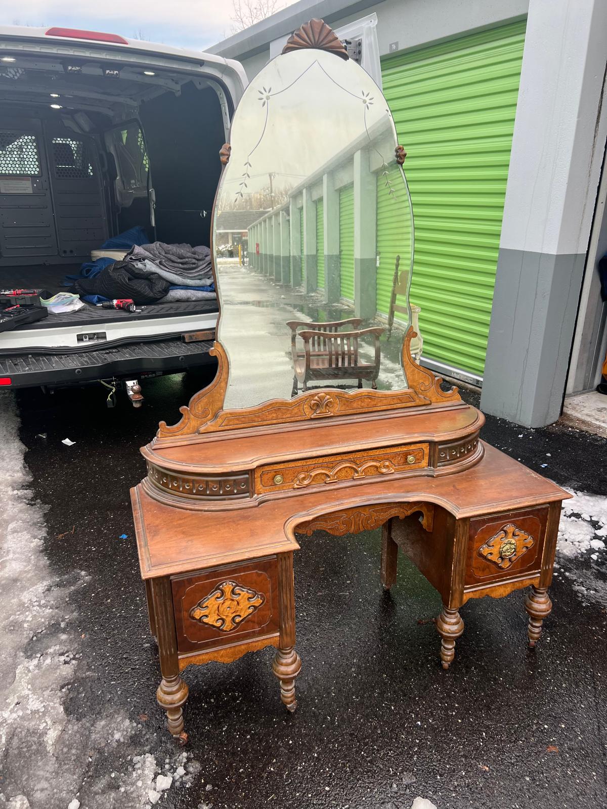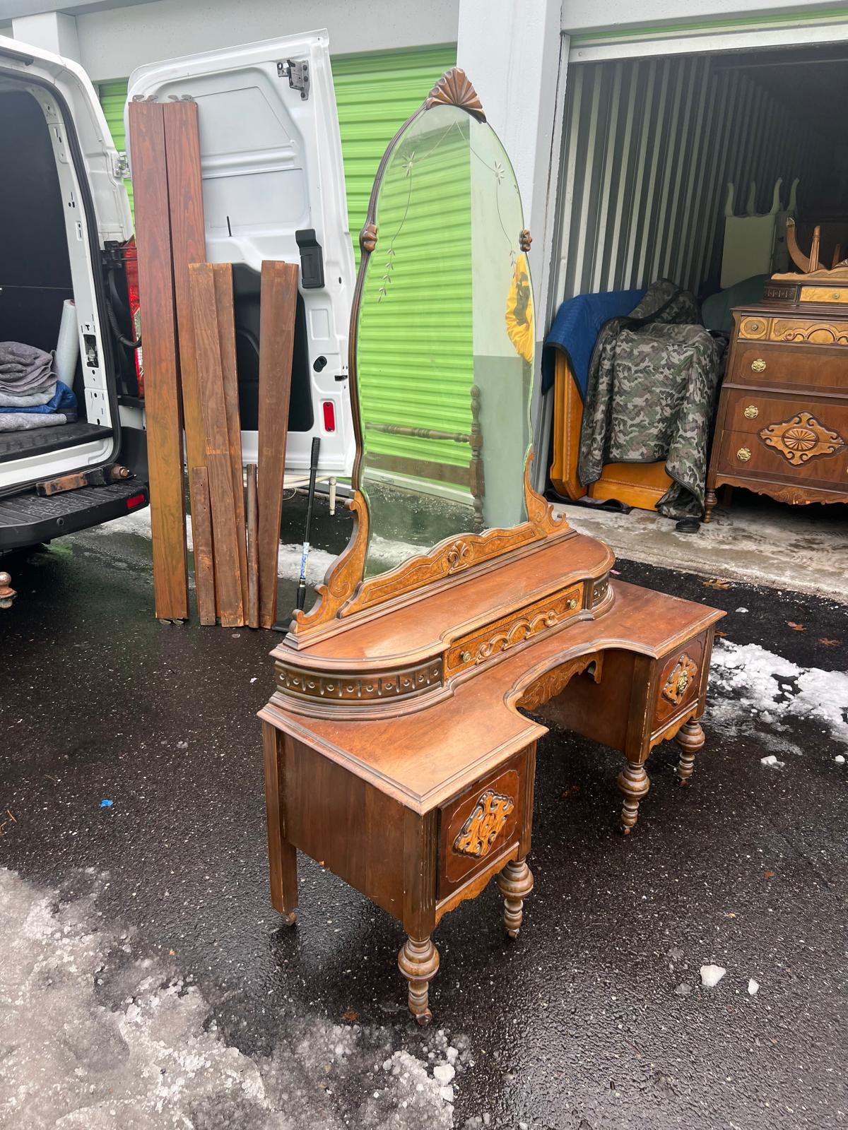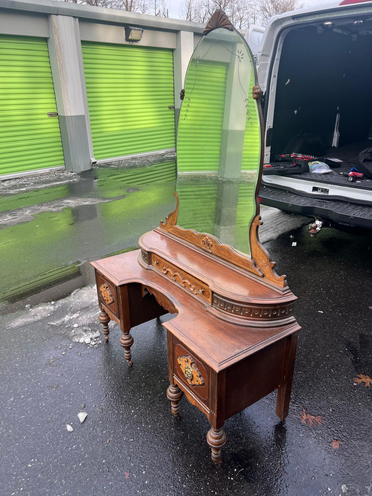 This authentic antique Victorian vanity dates to the late 19th century and showcases the rich ornamentation and craftsmanship that define the Victorian era. Crafted from solid wood with beautifully figured veneers, the piece features an elegant arched mirror, decorative carved cresting, and ornate drawer fronts accented with original brass hardware. The vanity stands on turned legs with original casters, a hallmark of high-quality Victorian furniture, allowing for easy movement while maintaining a refined presence. The shaped apron, carved details, and warm patina reflect decades of age and use, adding depth and character that cannot be replicated. The mirror includes subtle etched detailing. In terms of condition it is in good condition but it is missing the handle on the left side drawer and the mirror has a bit of a hazy look to it. There are some subtle scratches and marks throughout due to the age. Please see photos. The overall size is