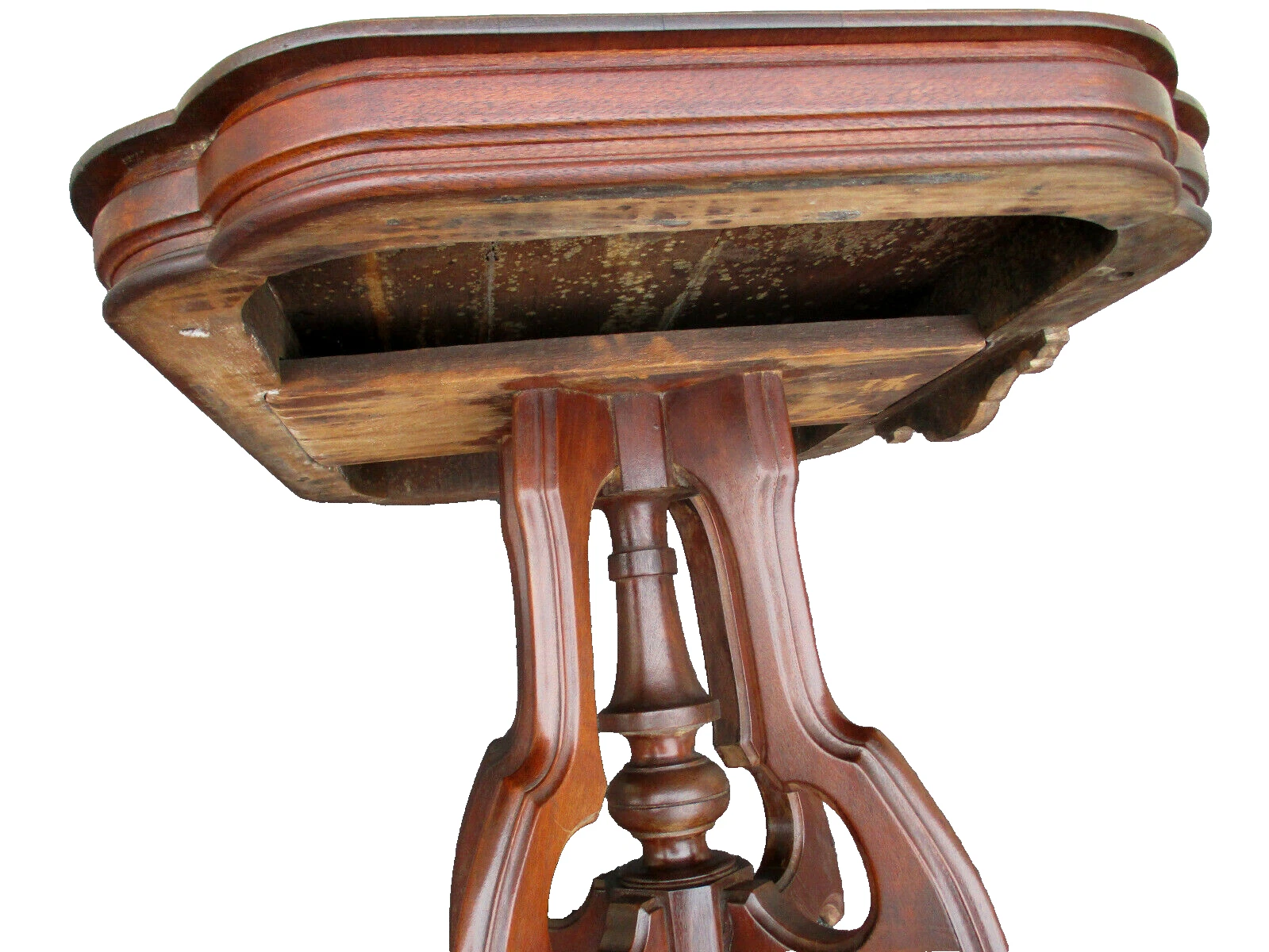 Crafted in the heart of the Victorian era, this exquisite walnut lamp table stand embodies the elegance and artistry of its time. Its rich, warm tones and intricate details speak to the skilled craftsmanship of the 1880s, making it a stunning accent piece for any room. The subtle imperfections, including a small sliver of wood missing from the edge, only add to its charm and story, inviting you to appreciate the history it carries. A perfect blend of functionality and artistry, this table is ready to be a cherished part of your home.