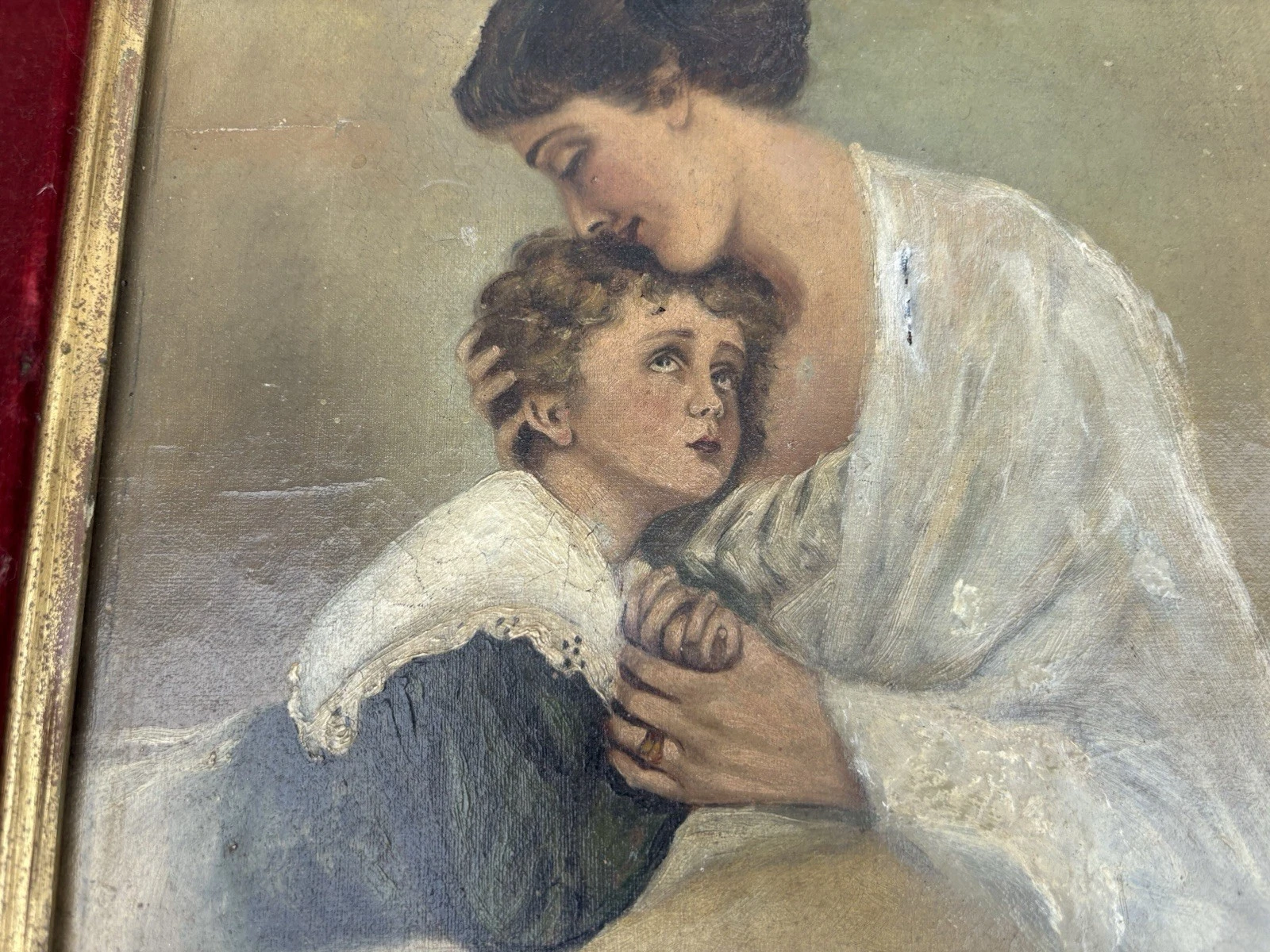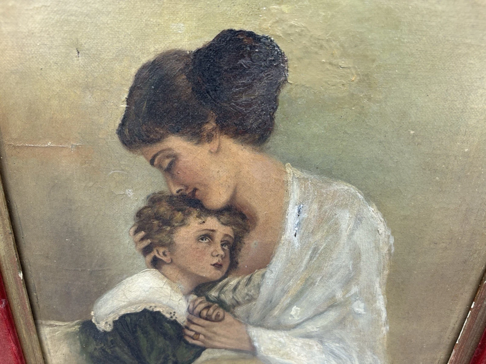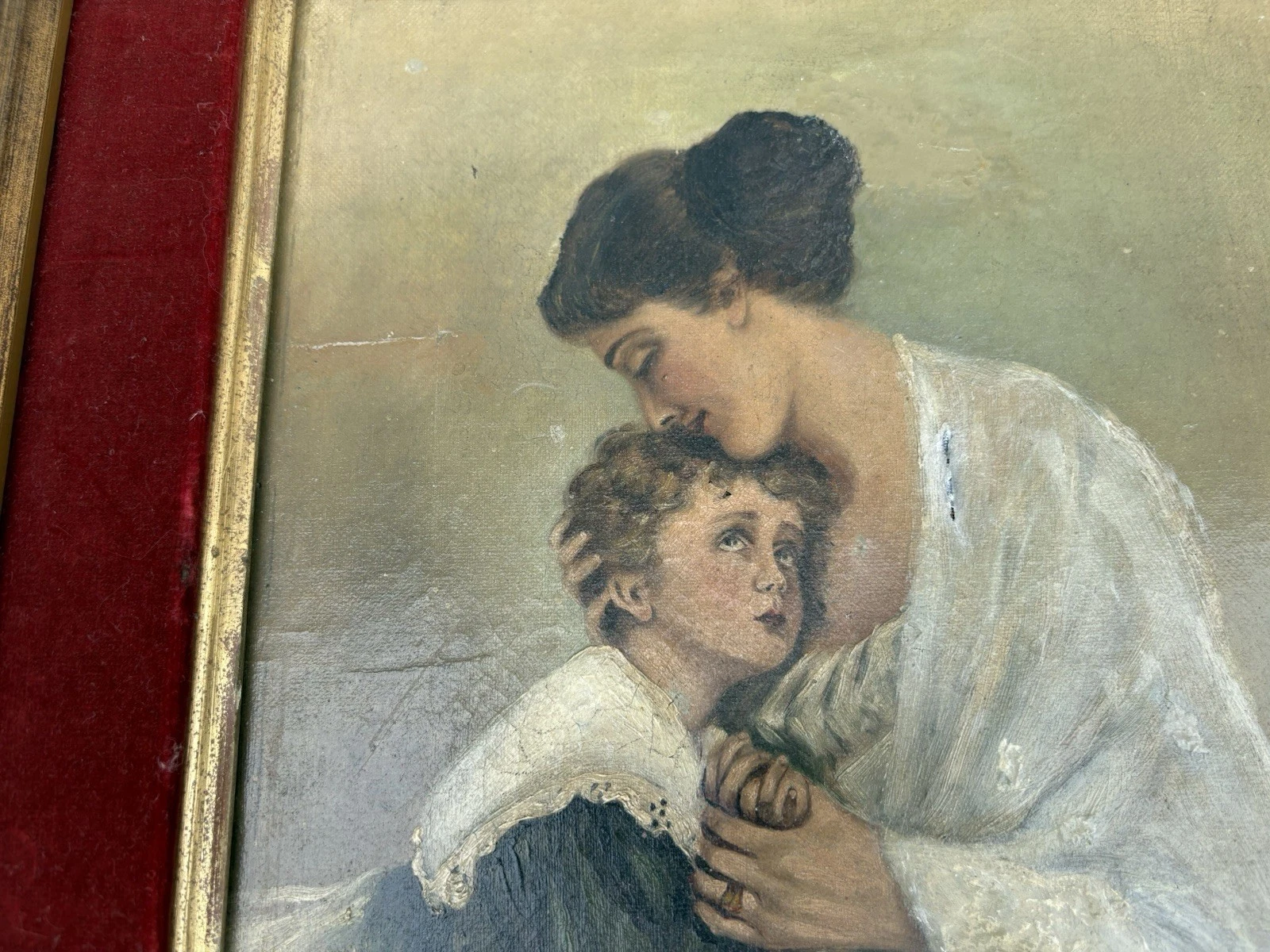 This charming antique oil on canvas captures a tender moment between a mother and child, showcasing the artist’s skill in realism. The delicate brushwork and rich colors bring warmth to the scene, inviting you to appreciate the intimate bond portrayed. Although an old repair is evident on the mother’s dress, it adds a layer of history and character to the piece, making it a unique addition to any collection. Signed by the artist, though the signature remains a mystery, this artwork speaks to the timeless beauty of familial love.