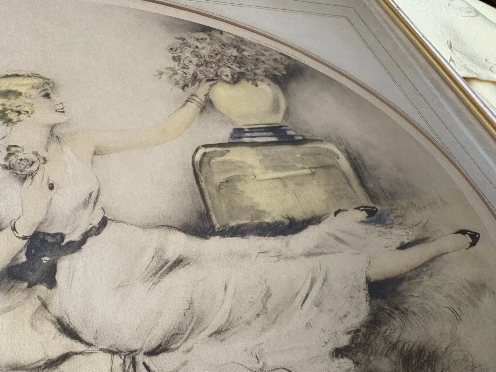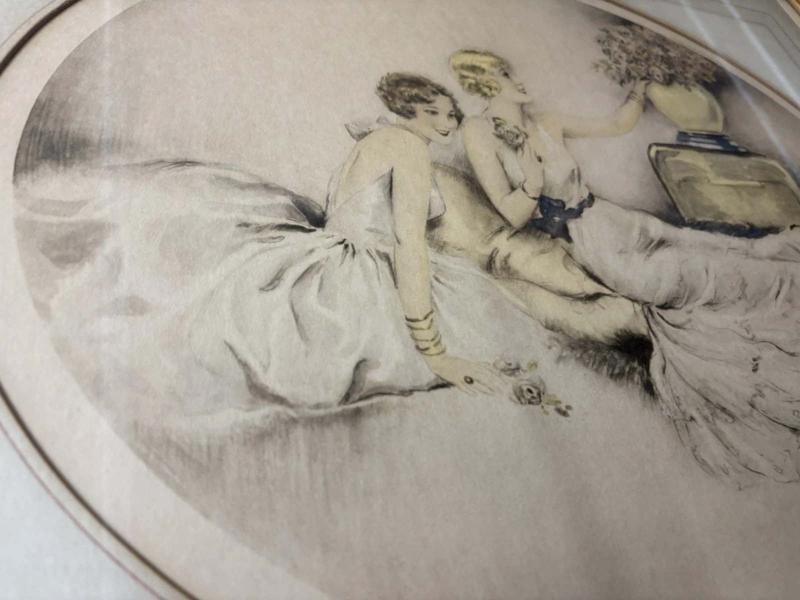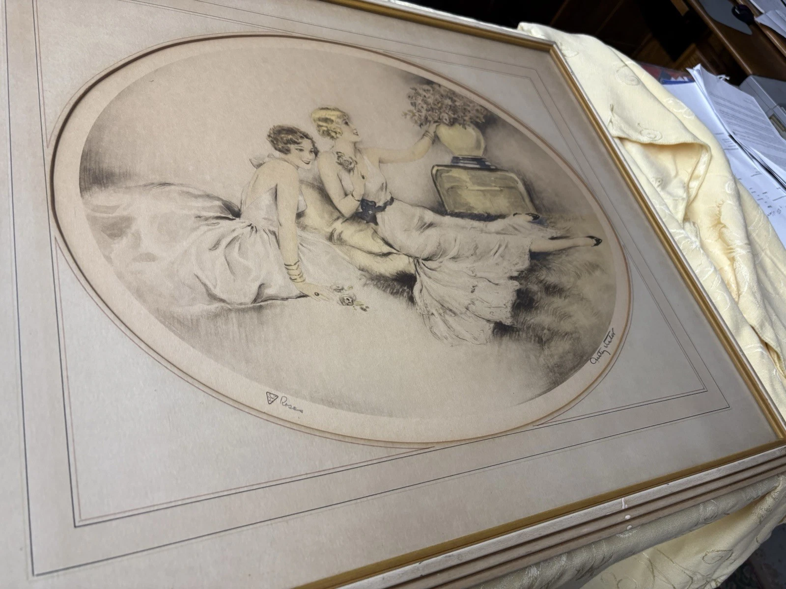 This enchanting antique print from 1934, created by the talented Camila Lucas in New York City, beautifully captures the grace of two women amidst a delicate arrangement of roses. The realism in the artwork draws you in, inviting you to ponder the story behind the scene. Framed with care, this piece not only reflects the artistry of its time but also serves as a charming reminder of the elegance and romance of the early 20th century, making it a memorable addition to any collection.