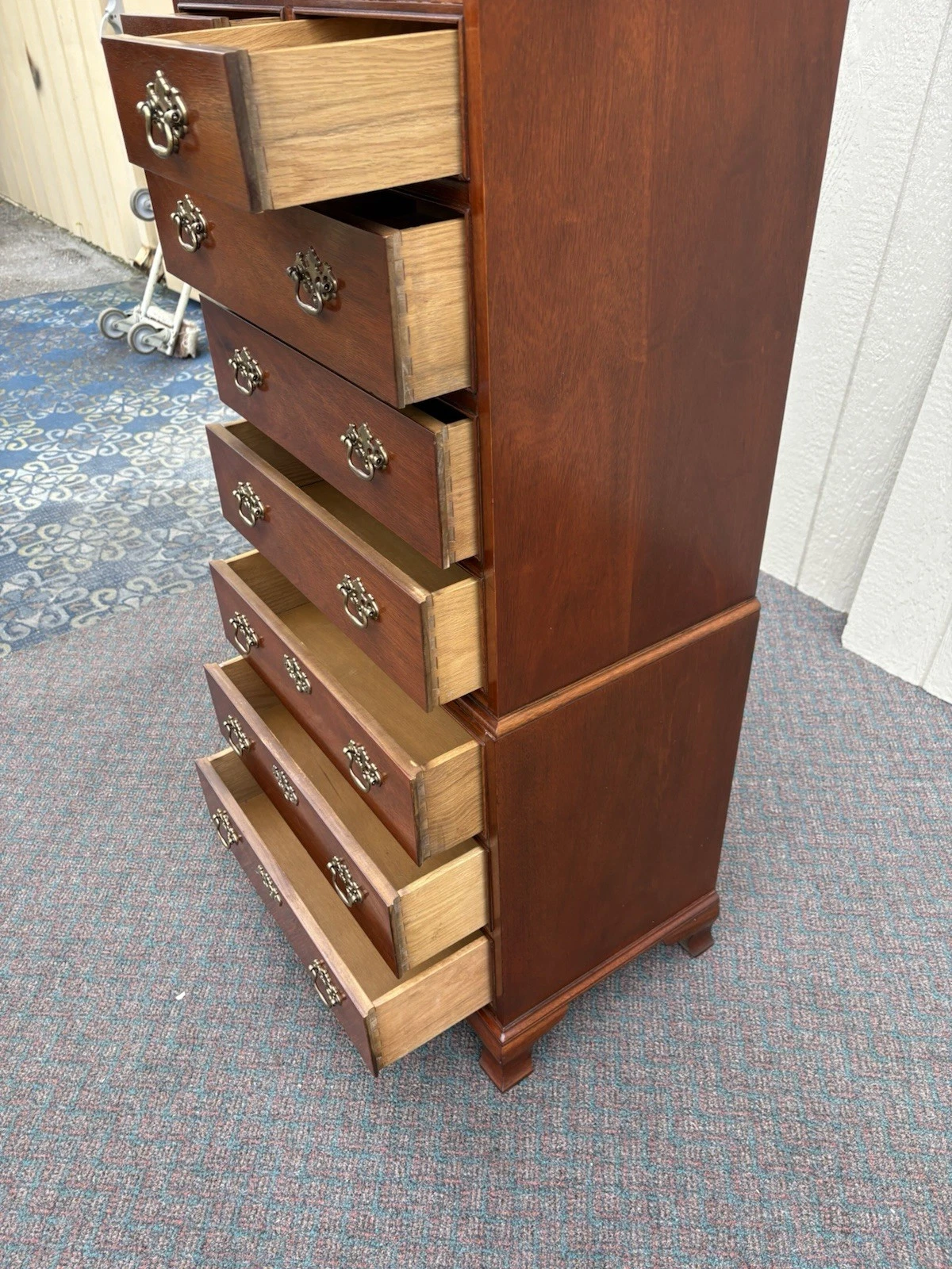 This elegant Baker Furniture lingerie chest showcases the timeless beauty of Chippendale design, crafted from rich mahogany that radiates warmth and sophistication. With eight meticulously constructed drawers, it offers both style and functionality, making it a perfect addition to any bedroom. The chest’s graceful lines and intricate banded details reflect the skilled craftsmanship of its era, ensuring it remains a cherished piece for years to come. Its sturdy build and classic aesthetic speak to a legacy of quality that has defined Baker Furniture since its inception.