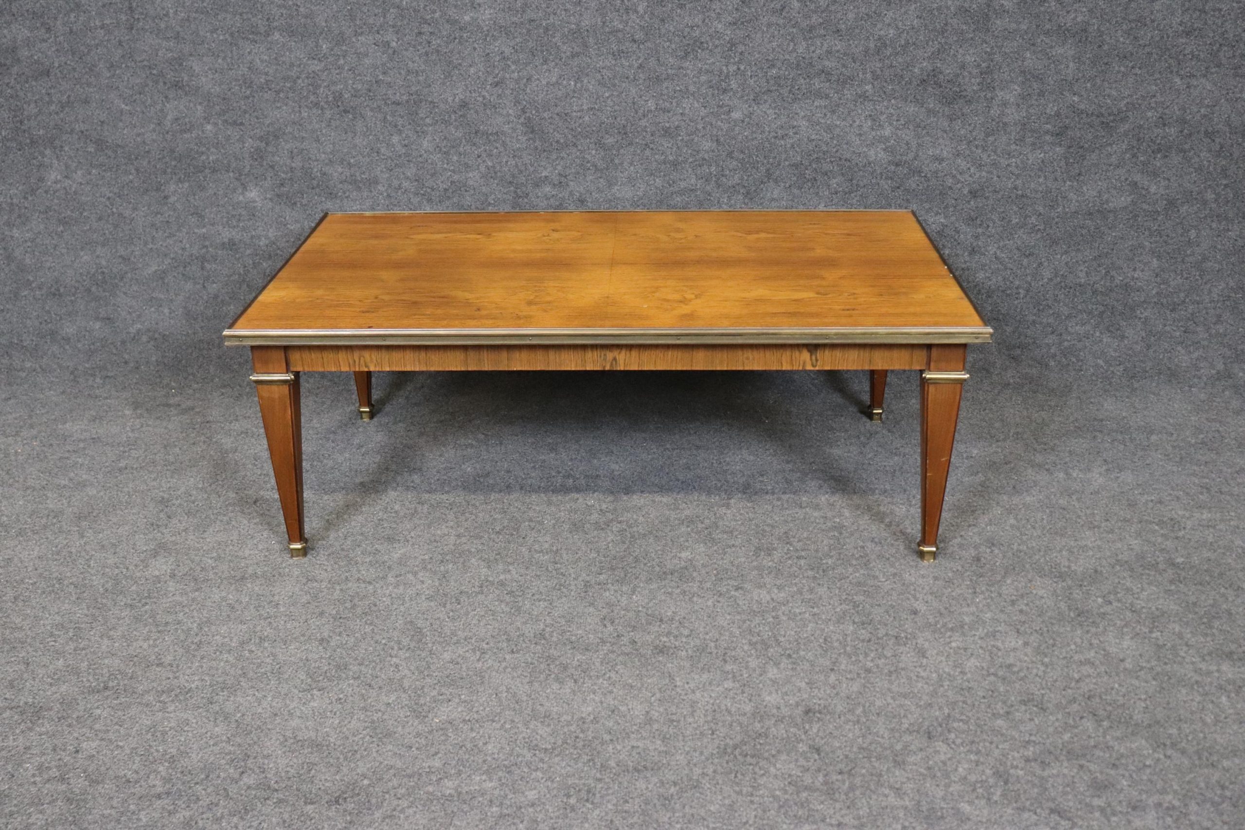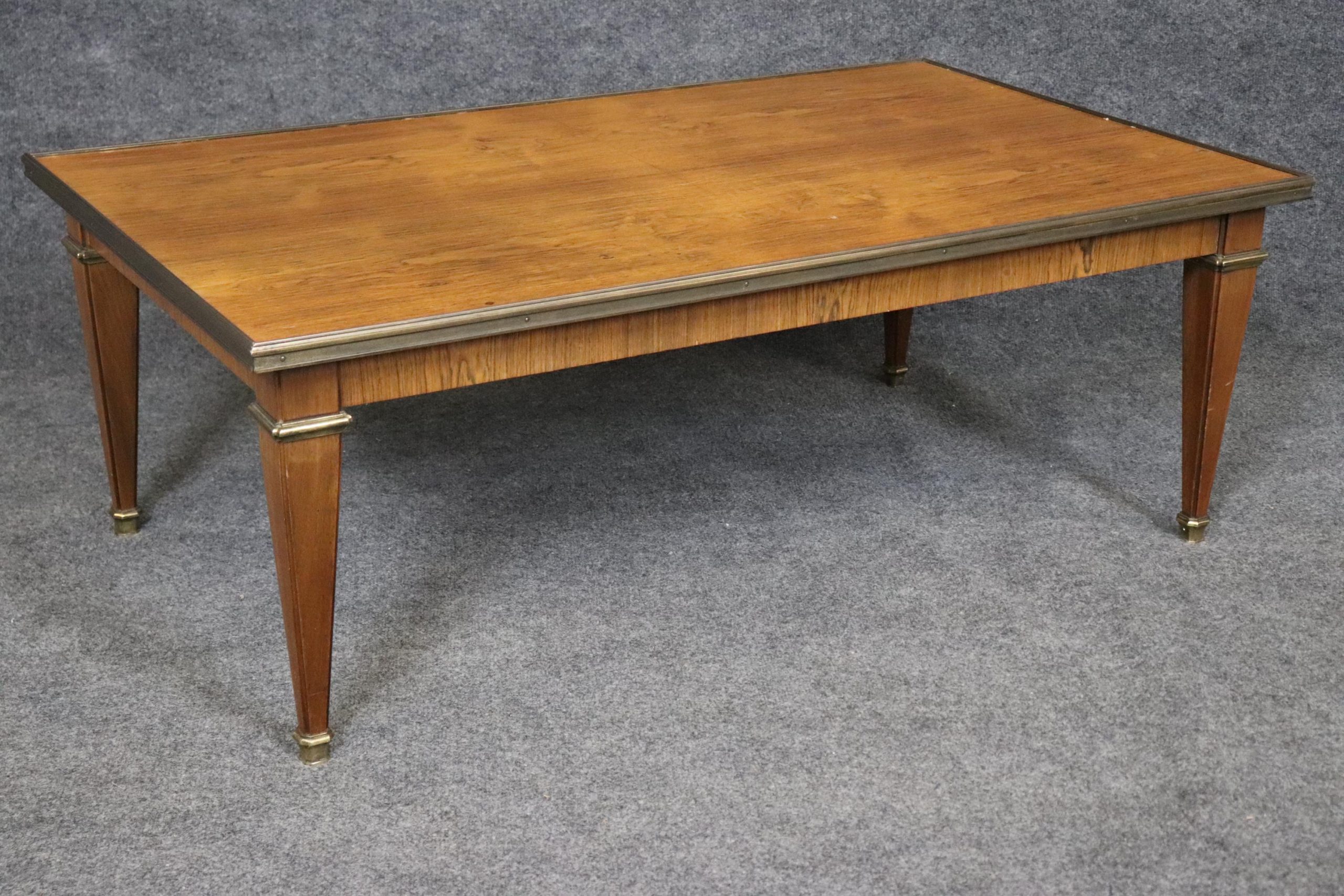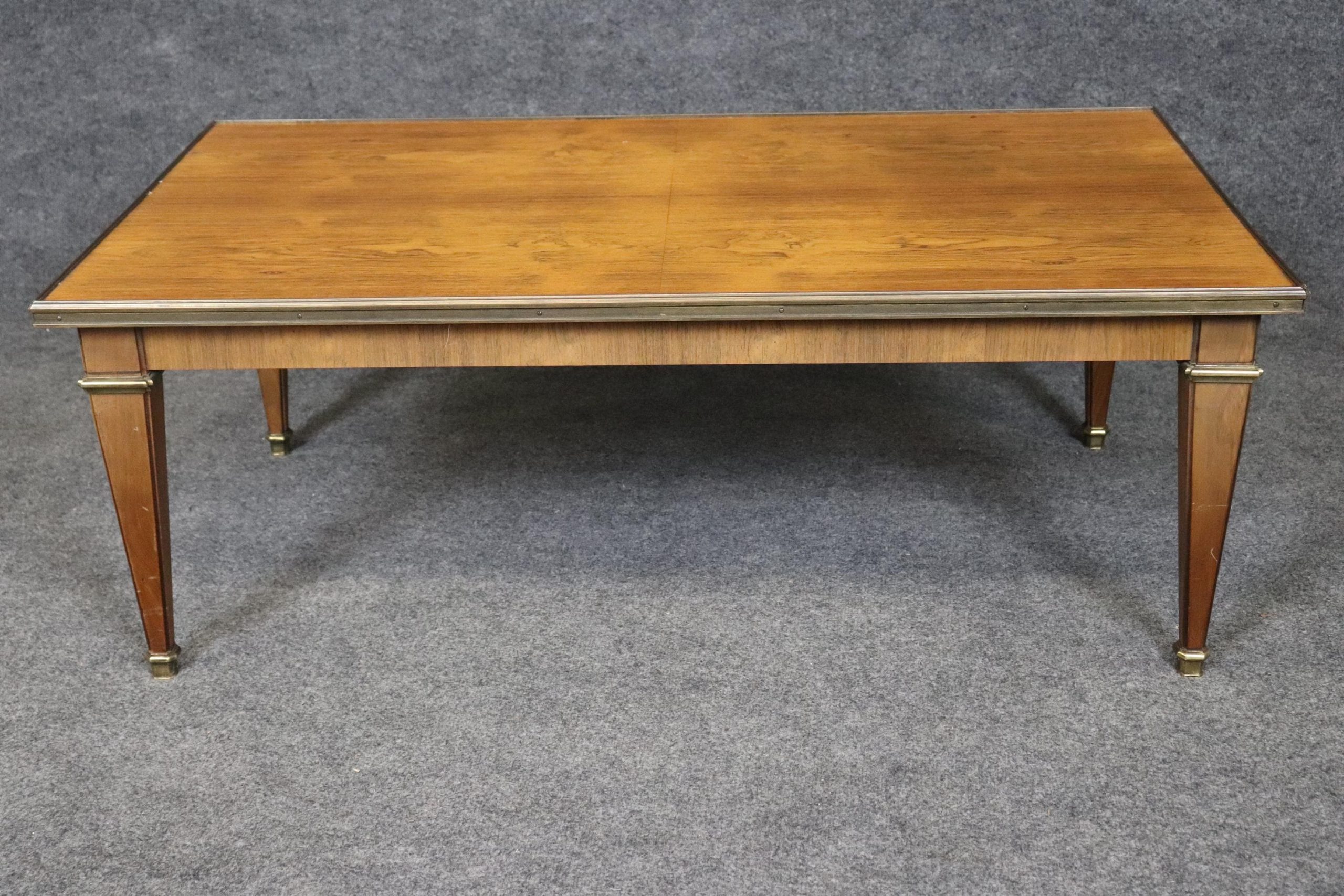 This Baker Furniture mid century Directoire style brass mounted coffee table, in the manner of Maison Jansen is of the highest quality! Baker Furniture, a high-end furniture manufacturer, was founded in 1890 by Siebe Baker in Allegan, Michigan, initially as Cook, Baker & Company. This table is bound to bring a sense of luxury and sophistication into your living room, office or place of choosing and will surely be a conversation starter at your next gathering. Antique furniture and vintage pieces have stood the test of time and this coffee table is no exception! With its quality materials and great craftsmanship this is bound to last you and your family for many years to come. The table is in very good vintage used condition with minor light surface scratches, but otherwise in good condition!