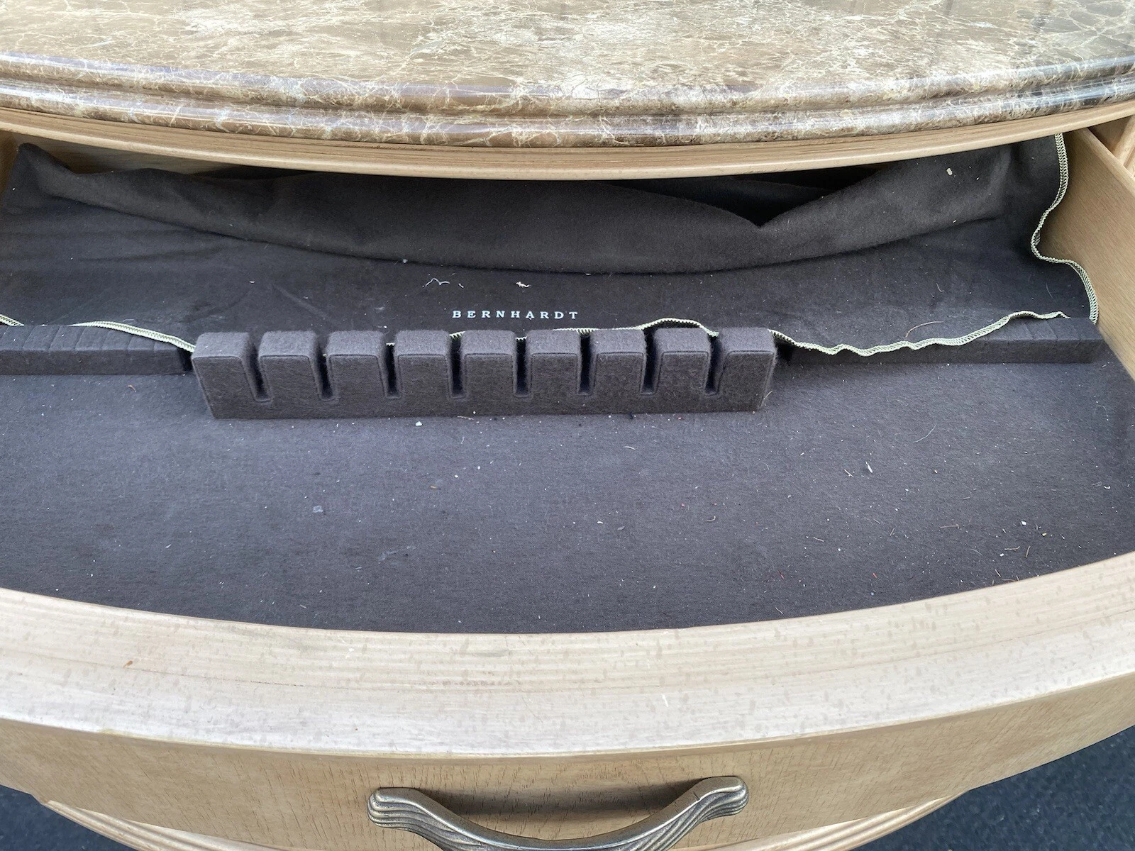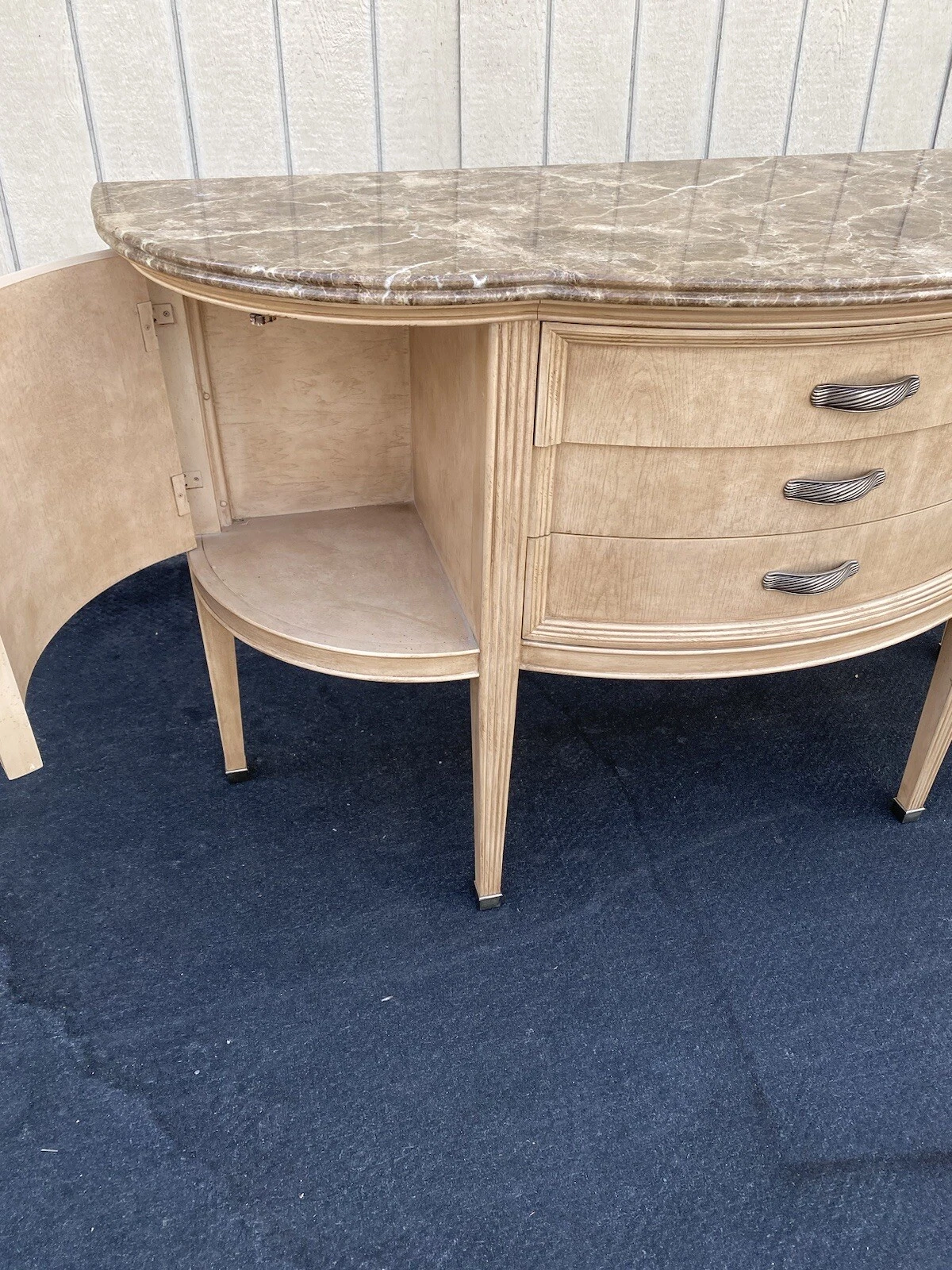 This exquisite Bernhardt sideboard buffet showcases a stunning marble top that beautifully complements its sturdy, handcrafted wooden base, making it a striking centerpiece for any dining room. With three spacious drawers featuring elegant dividers and two doors, it offers both style and functionality, perfect for storing your finest dinnerware or linens. Its decorator modern design, combined with the unique character of the multicolor marble, reflects the craftsmanship that Bernhardt is renowned for, making it a cherished addition to your home. Embrace the warmth of family gatherings around this timeless piece, rich with history and charm.