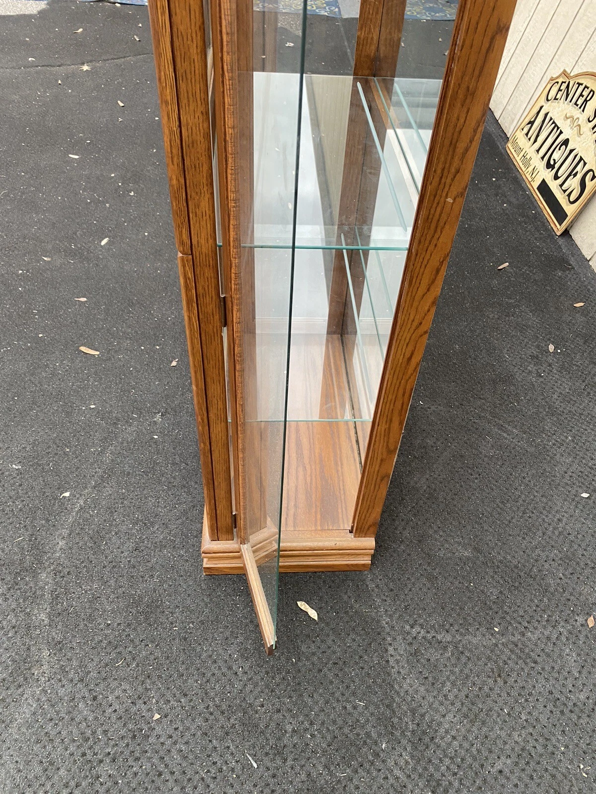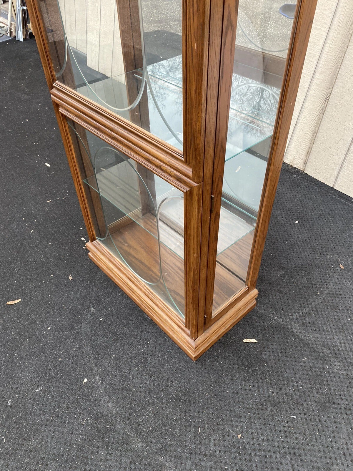 This beautifully crafted Reinisch Oak curio cabinet captures the charm of mid-20th century design with its elegant etched glass doors and traditional oak finish. The four spacious shelves offer a perfect backdrop for displaying your treasured collectibles, while the sturdy construction ensures this piece remains a lasting centerpiece in your home. Handcrafted with care, this cabinet embodies the warmth and character that only a family-owned business like Center Stage Antiques can provide, making it a delightful addition to any room.