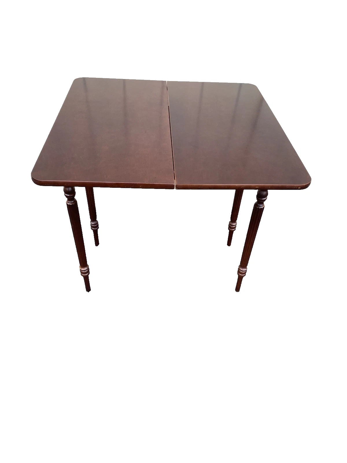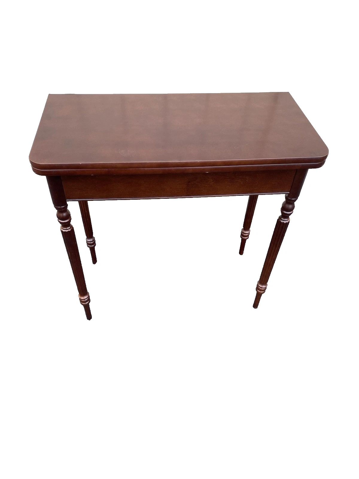 This elegant mahogany flip-top game table, with its refined Hepplewhite design, is a delightful nod to both form and function. Crafted with care, its smooth surface and sturdy construction invite countless evenings of card games and family gatherings. The rich, warm hue of the mahogany wood adds a touch of sophistication to any space, while the clever flip-top feature allows for easy storage and versatility. A charming piece that embodies the spirit of connection and leisure, perfect for creating lasting memories in your home.
