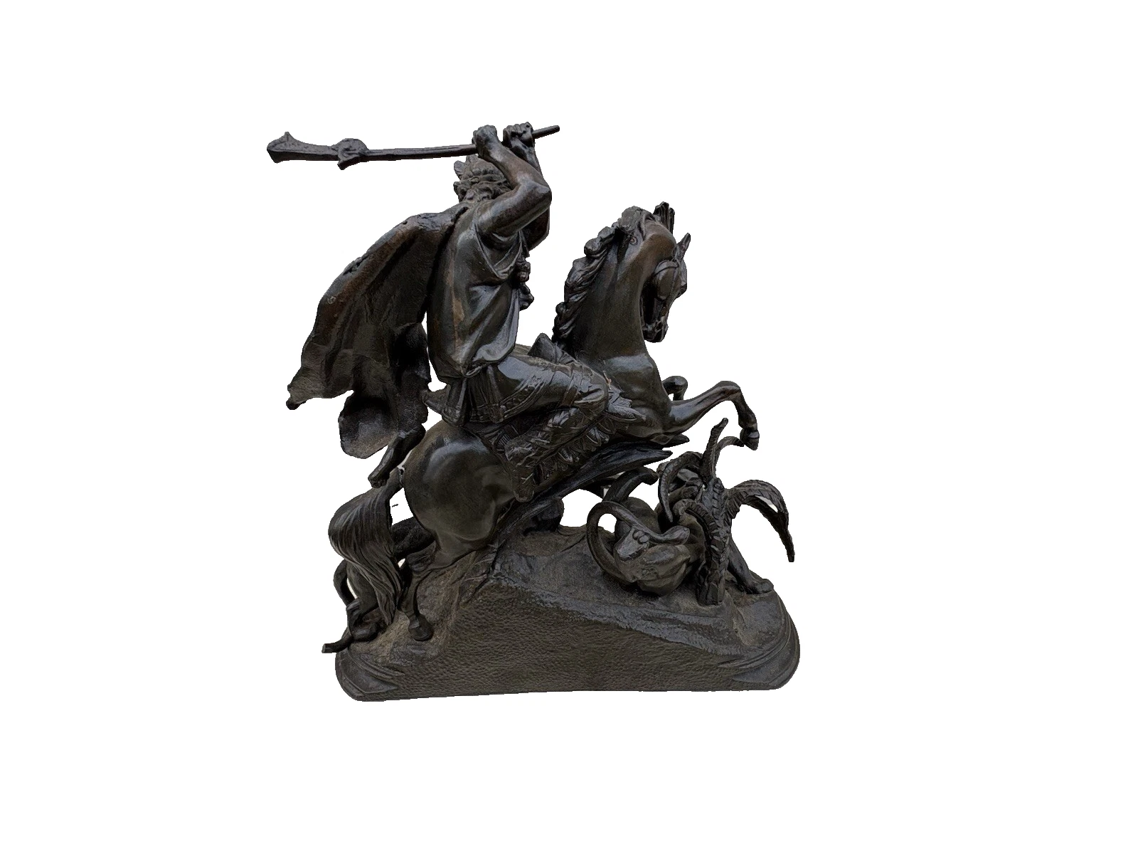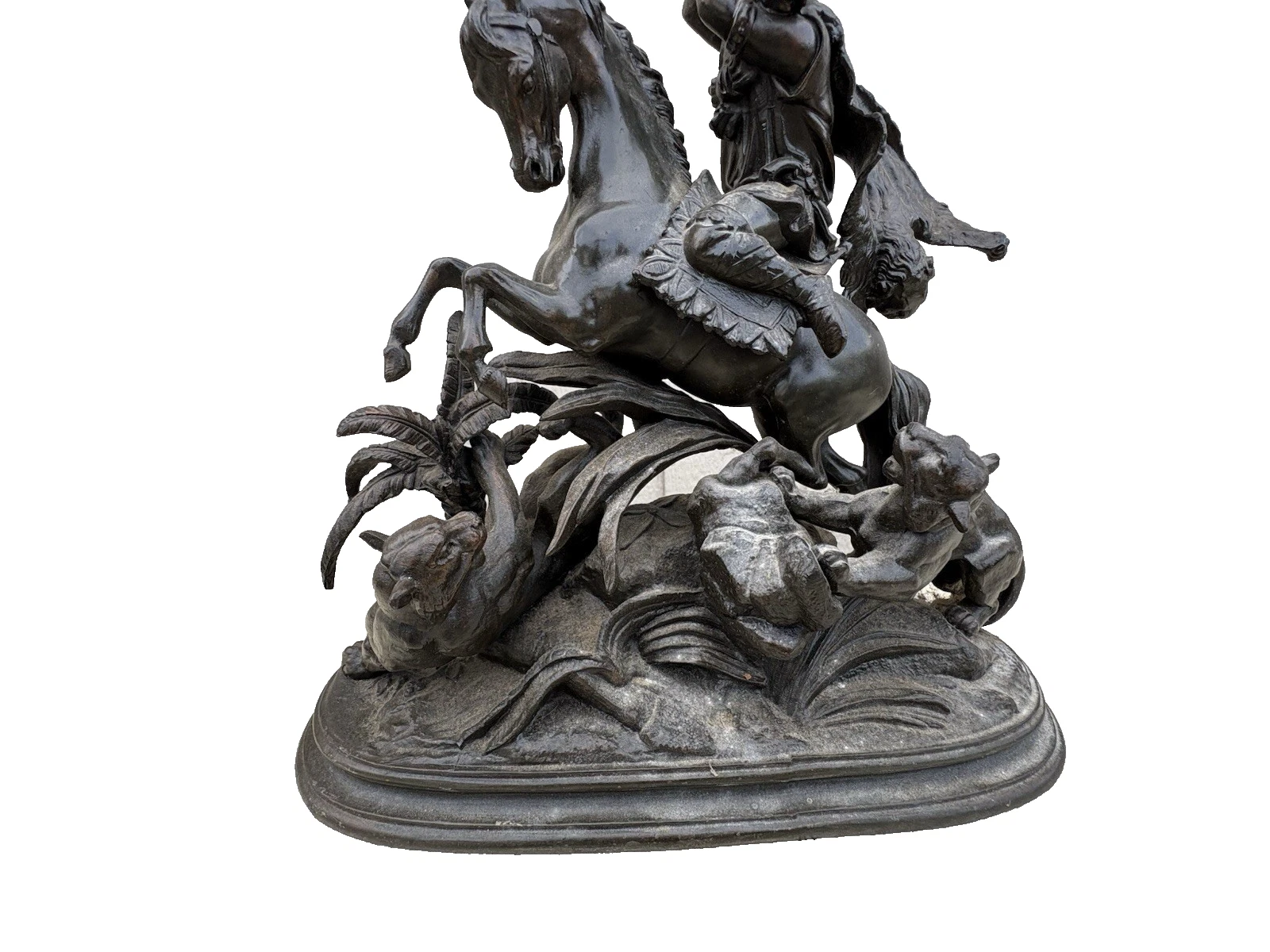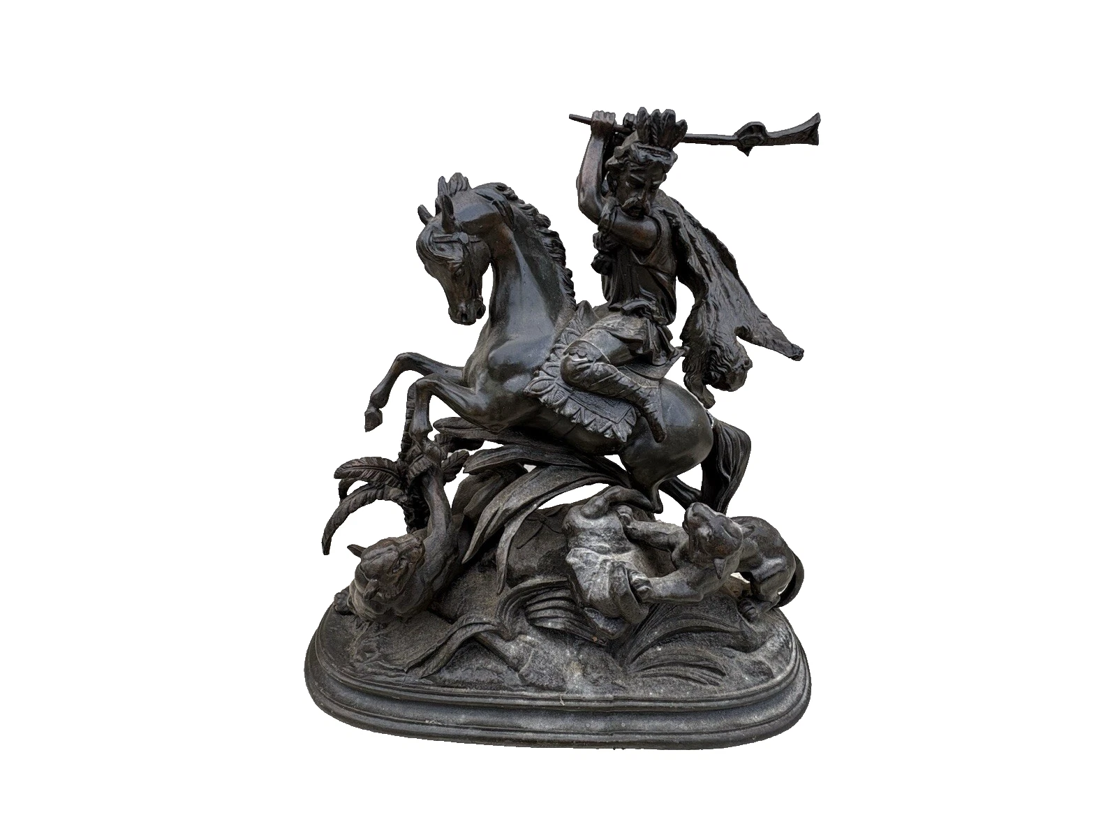 This stunning Victorian bronze figural statue captures the dynamic relationship between man, horse, and lion, showcasing the artistry and craftsmanship of its time. The intricate details, from the flowing mane of the horse to the fierce expressions of the lions, reflect a masterful hand that has preserved the narrative of bravery and nobility. Perfect for adding a touch of historical charm to your collection, this piece invites admiration and sparks conversation, embodying the rich stories of the past in a beautifully crafted sculpture.