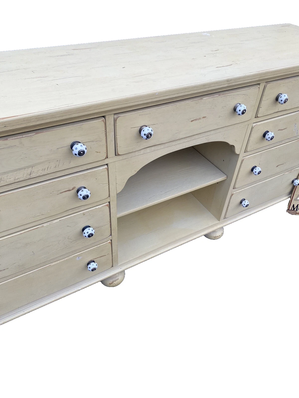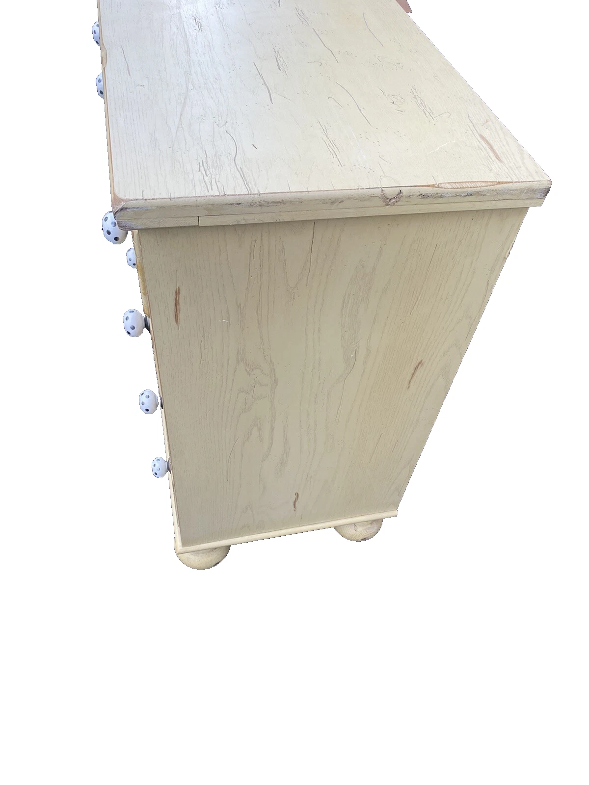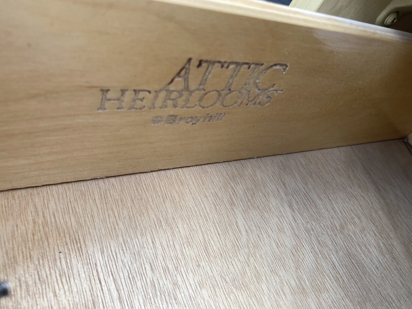 This charming Broyhill Attic Heirlooms sideboard buffet server captures the essence of rustic country living with its warm, multicolored wood finish and artisanal craftsmanship. Featuring five sturdy drawers, this piece not only offers ample storage but also serves as a delightful focal point for your dining area, inviting gatherings and cherished memories. Its handmade quality and robust construction ensure that it will stand the test of time, making it a perfect blend of functionality and timeless elegance for any home.