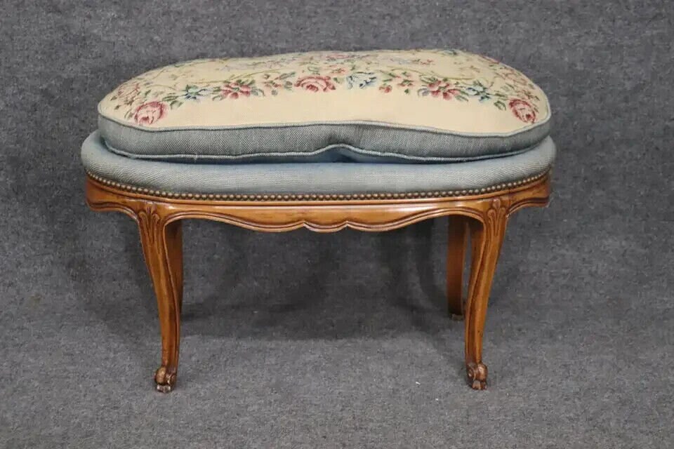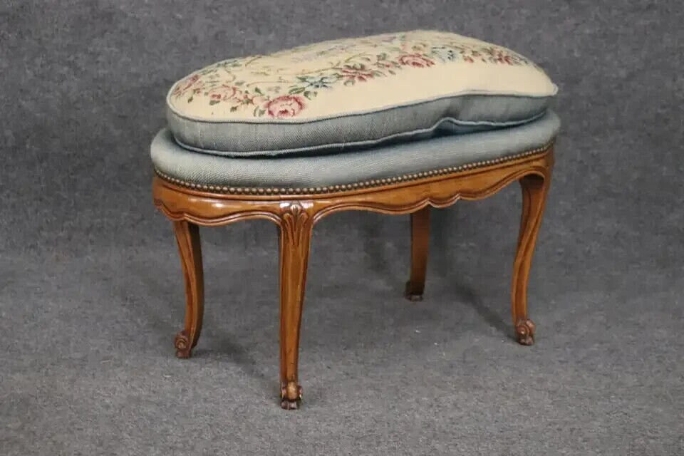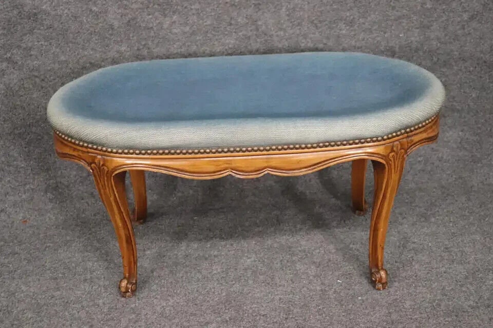 This carved walnut French Louis XV oval footstool or bench is a high quality piece accompanied by a removable tapestry or needlepoint upholstered cushion! This bench ottoman footstool will add a nice sense of luxury into your living room, bedroom or other place of your choosing! The footstool is in good vintage condition with light surface scratches to frame as to be expected for a bench from the 1930’s.