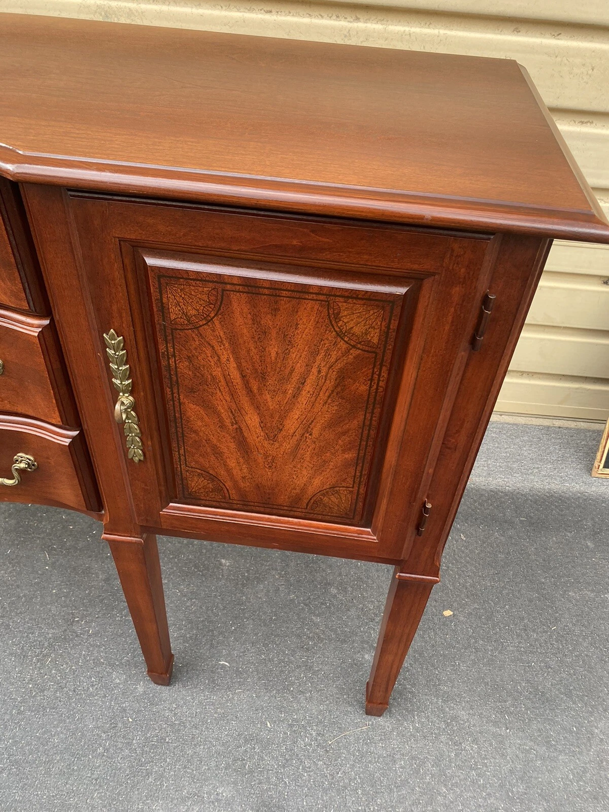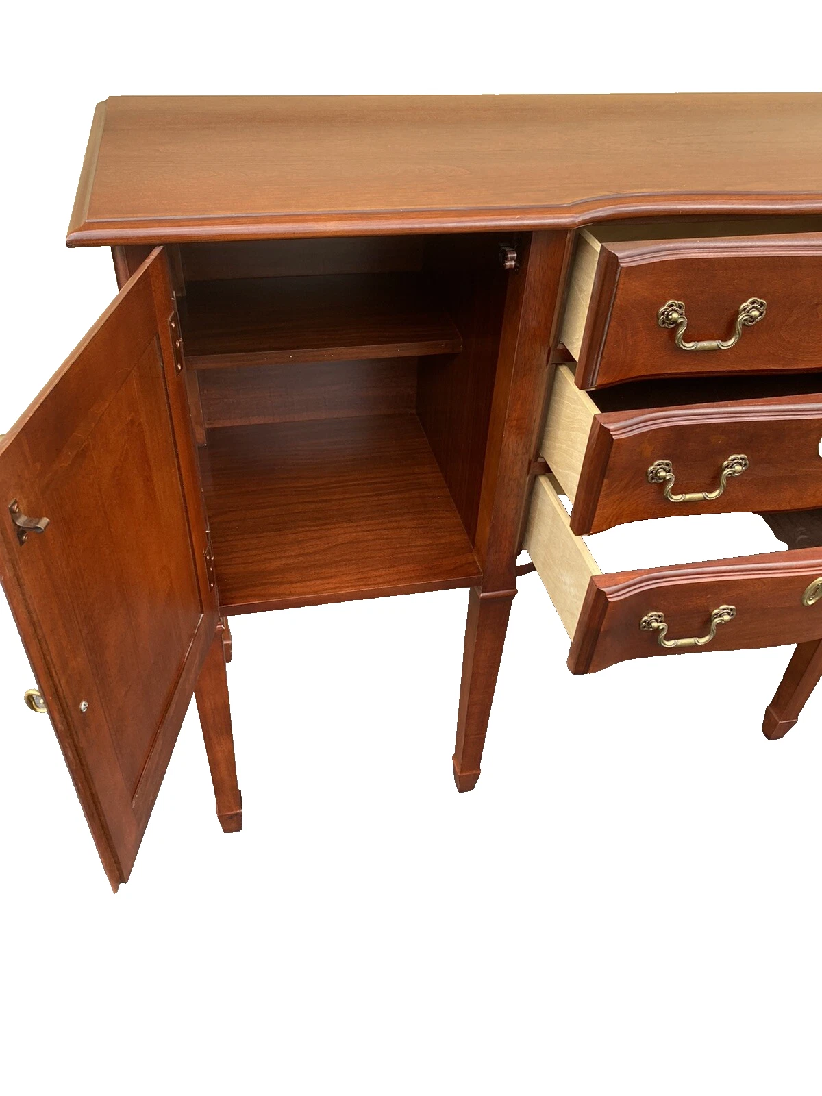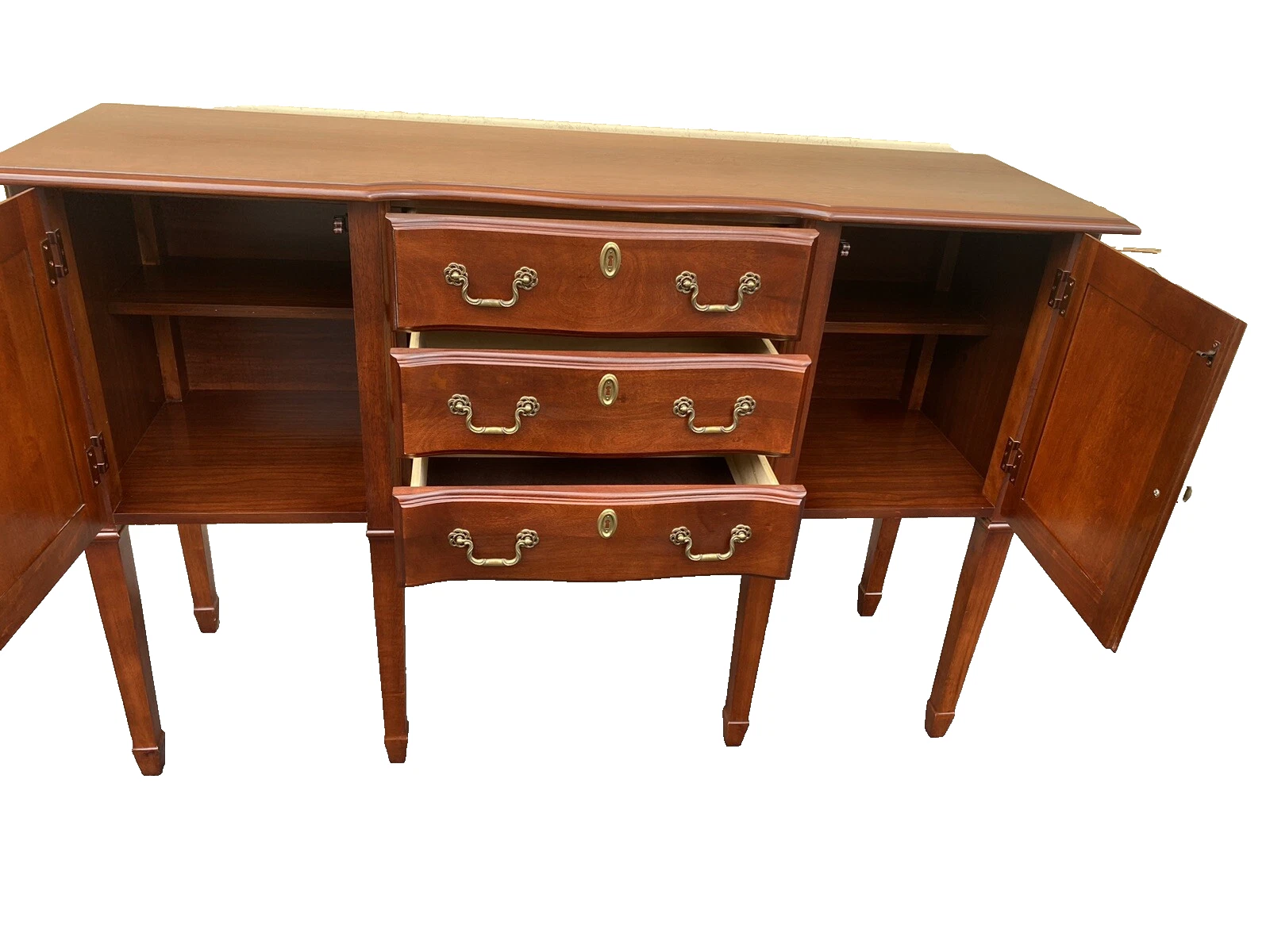This exquisite Cherry Hepplewhite buffet sideboard embodies the timeless elegance of American craftsmanship, expertly handmade with care. Featuring three spacious drawers and two charming doors, it offers both functionality and style, making it an ideal addition to your dining area or entryway. The rich, warm tones of the cherry wood enhance its classic silhouette, while the clean lines and delicate details reflect the enduring appeal of the Hepplewhite style. A wonderful piece to cherish for generations, it invites stories and gatherings around it.
