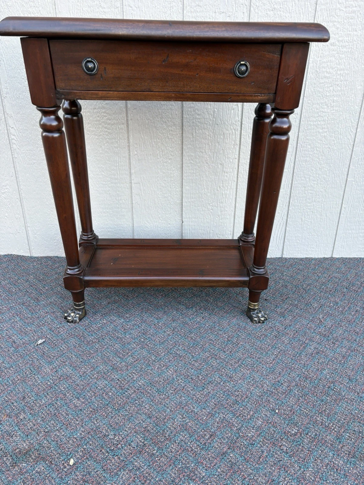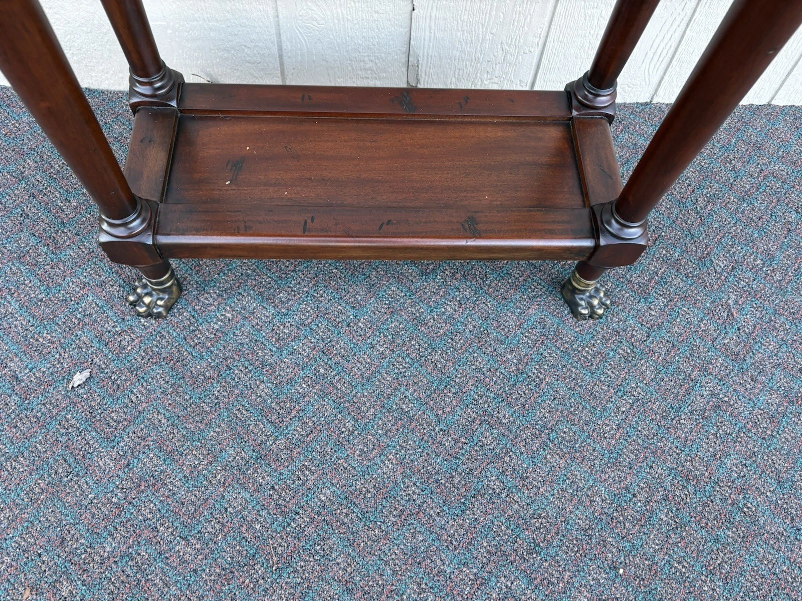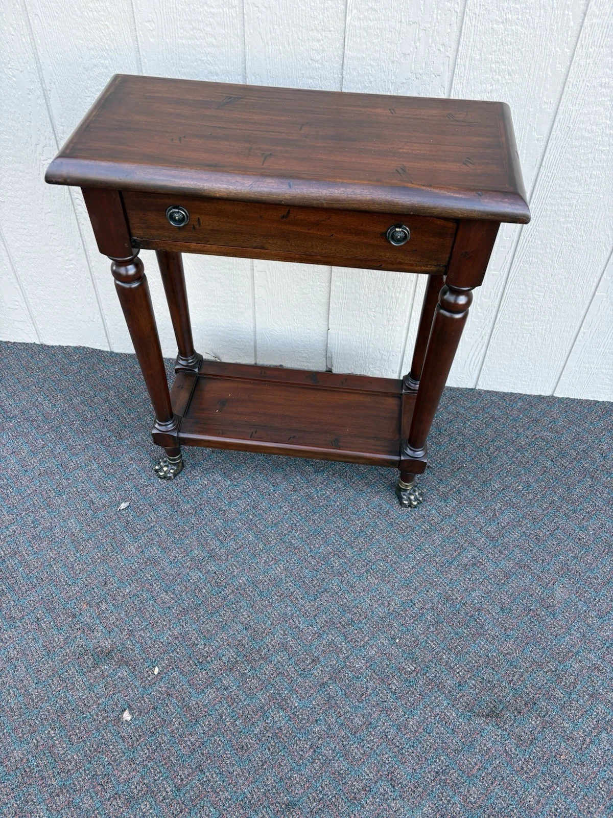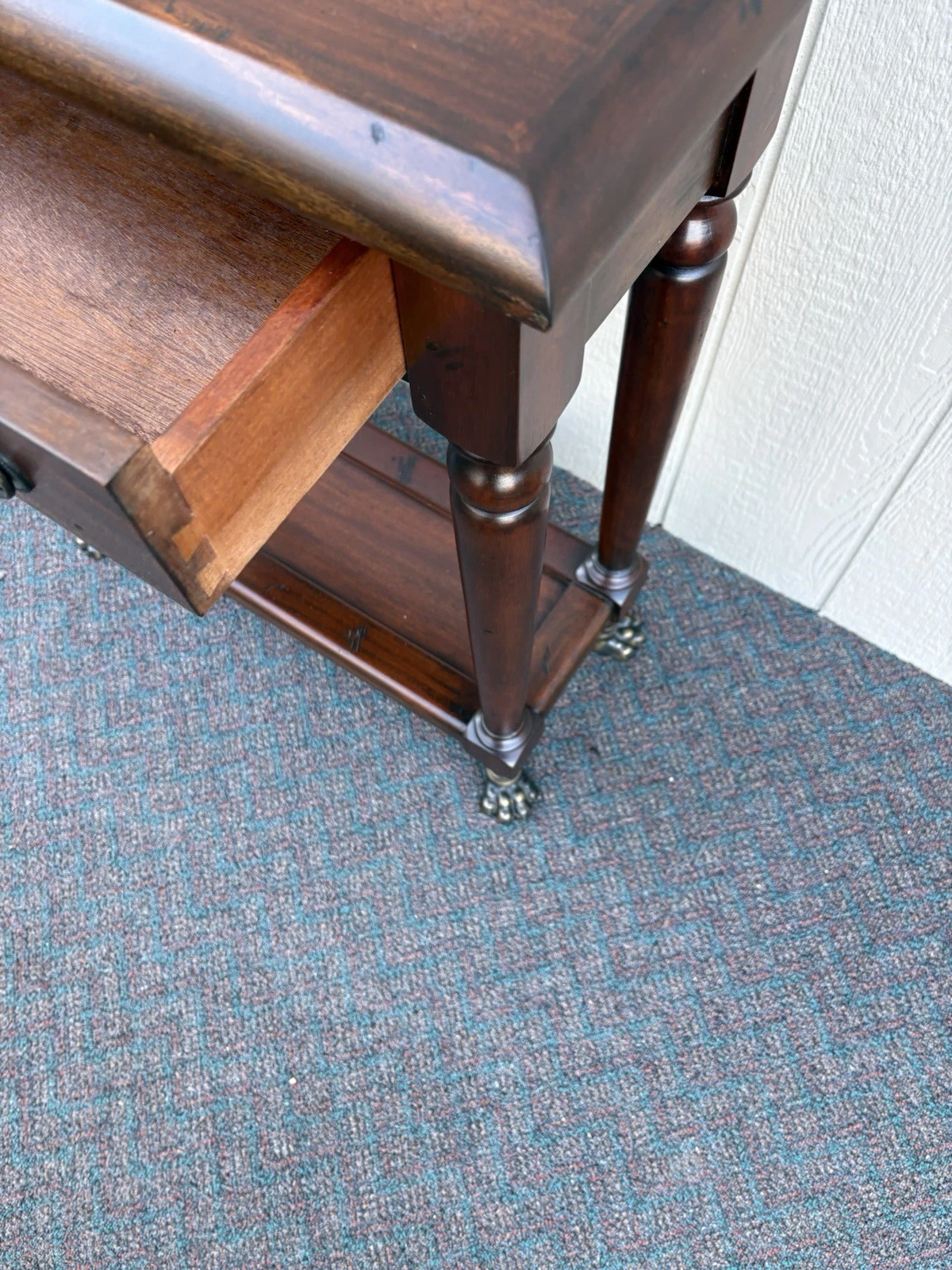 This charming claw foot mahogany console lamp table stand embodies the timeless elegance of mid-century design, featuring a beautifully grained mahogany tabletop that exudes warmth and sophistication. Its sturdy construction and well-preserved condition speak to the craftsmanship of a bygone era, while the intricate claw feet add a touch of character and artistry. Perfect for any room, this versatile piece offers both functionality and a glimpse into the rich history of furniture-making, making it a delightful addition to your home.