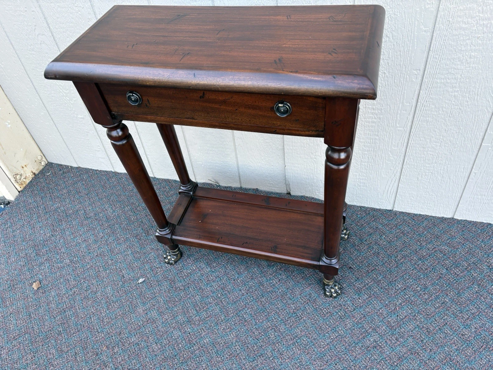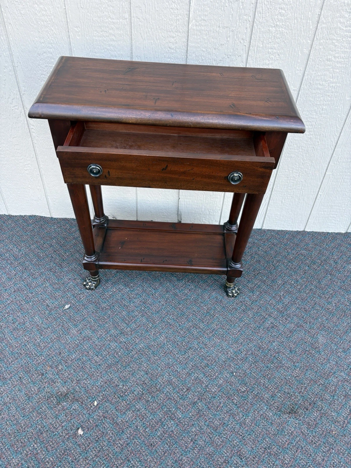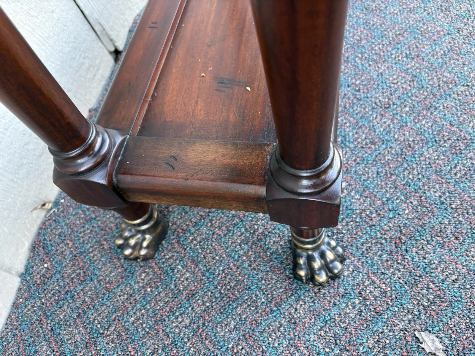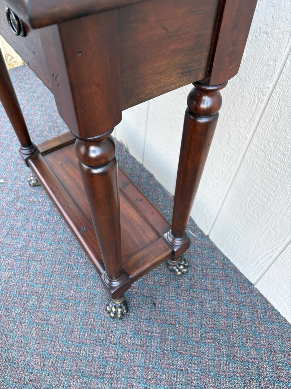 This charming claw foot mahogany console lamp table stand embodies the timeless elegance of mid-century design, featuring a beautifully grained mahogany tabletop that exudes warmth and sophistication. Its sturdy construction and well-preserved condition speak to the craftsmanship of a bygone era, while the intricate claw feet add a touch of character and artistry. Perfect for any room, this versatile piece offers both functionality and a glimpse into the rich history of furniture-making, making it a delightful addition to your home.