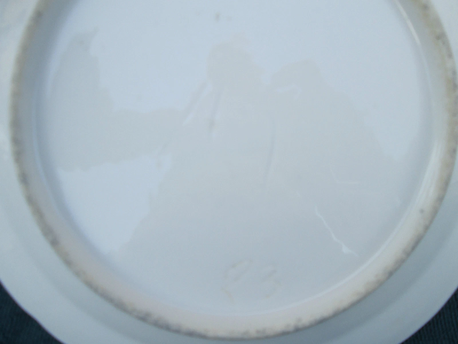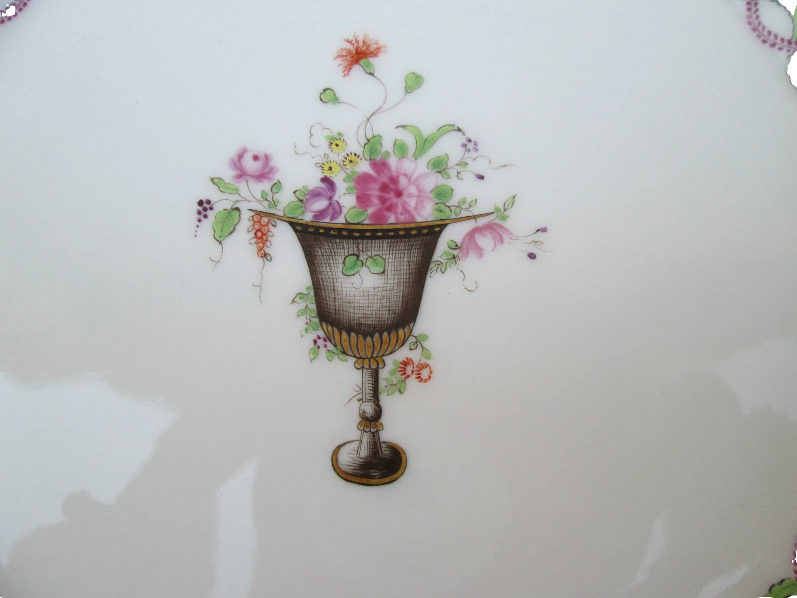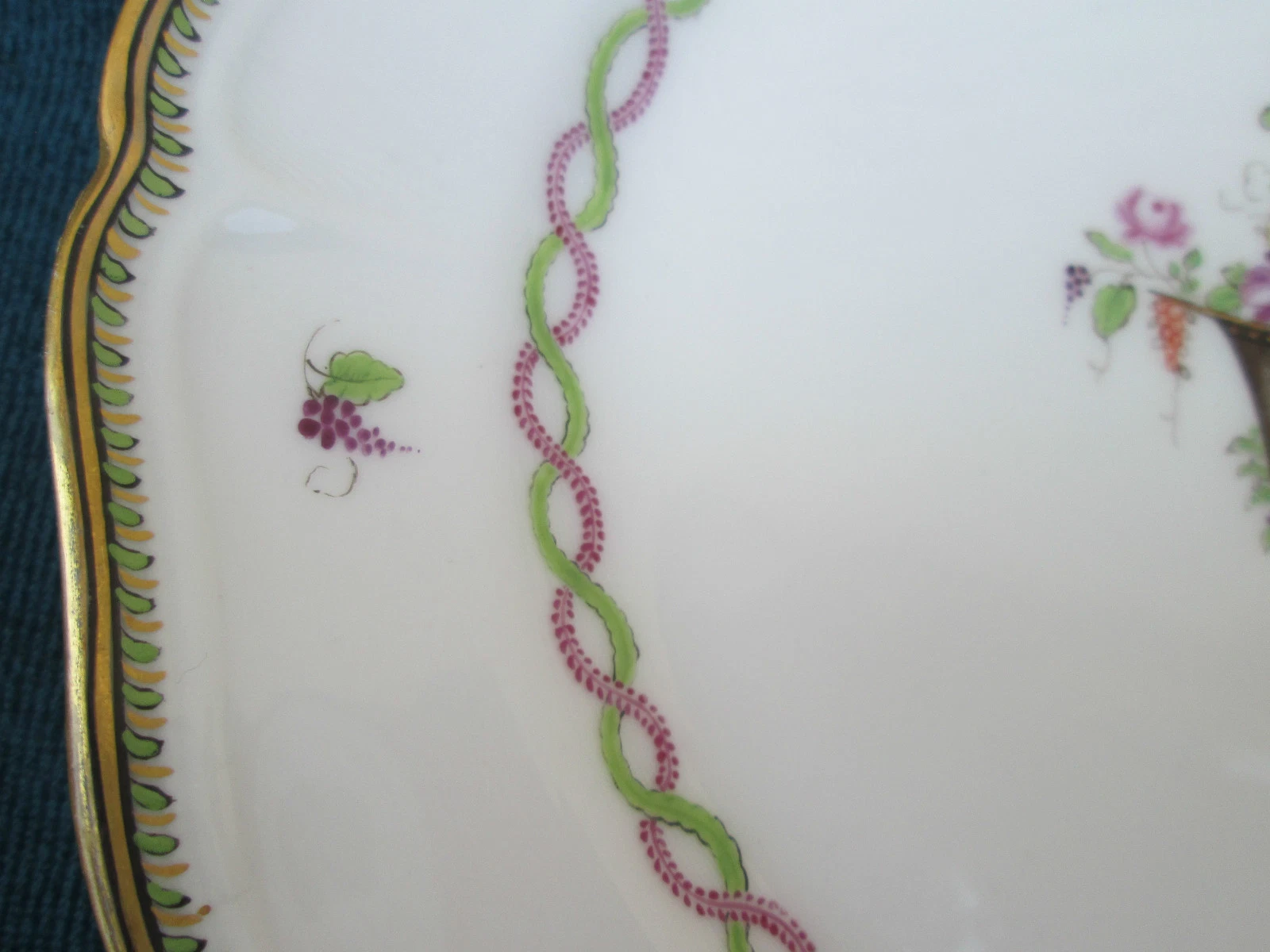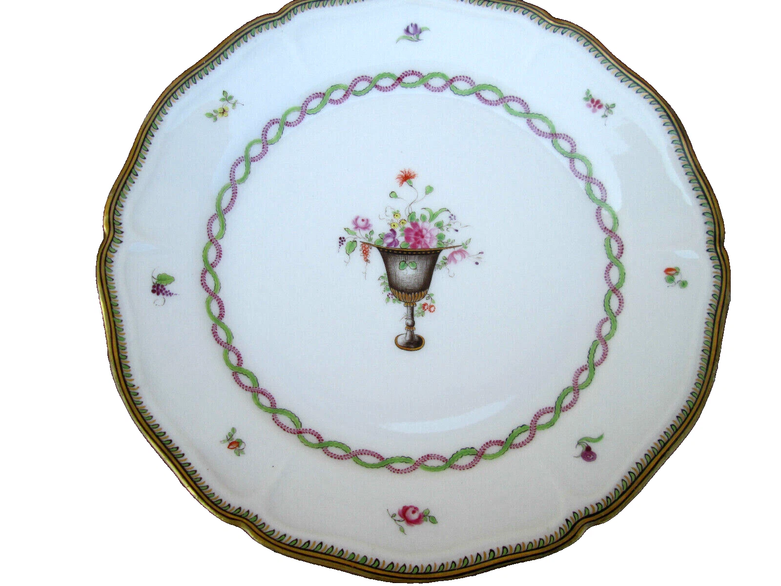 This enchanting set of 11 antique porcelain plates, hailing from a prominent Boston estate, captures the essence of Victorian elegance with their delicate craftsmanship. Each plate features a pristine white background adorned with a gold-trimmed scalloped edge and vibrant hand-painted floral designs surrounding a striking black urn at the center. The personal touch of the artist’s initials, found under the glaze, adds a unique charm, ensuring that each plate tells its own story. Perfect for collectors or as a stunning display, these plates are a testament to the artistry of the early 20th century.