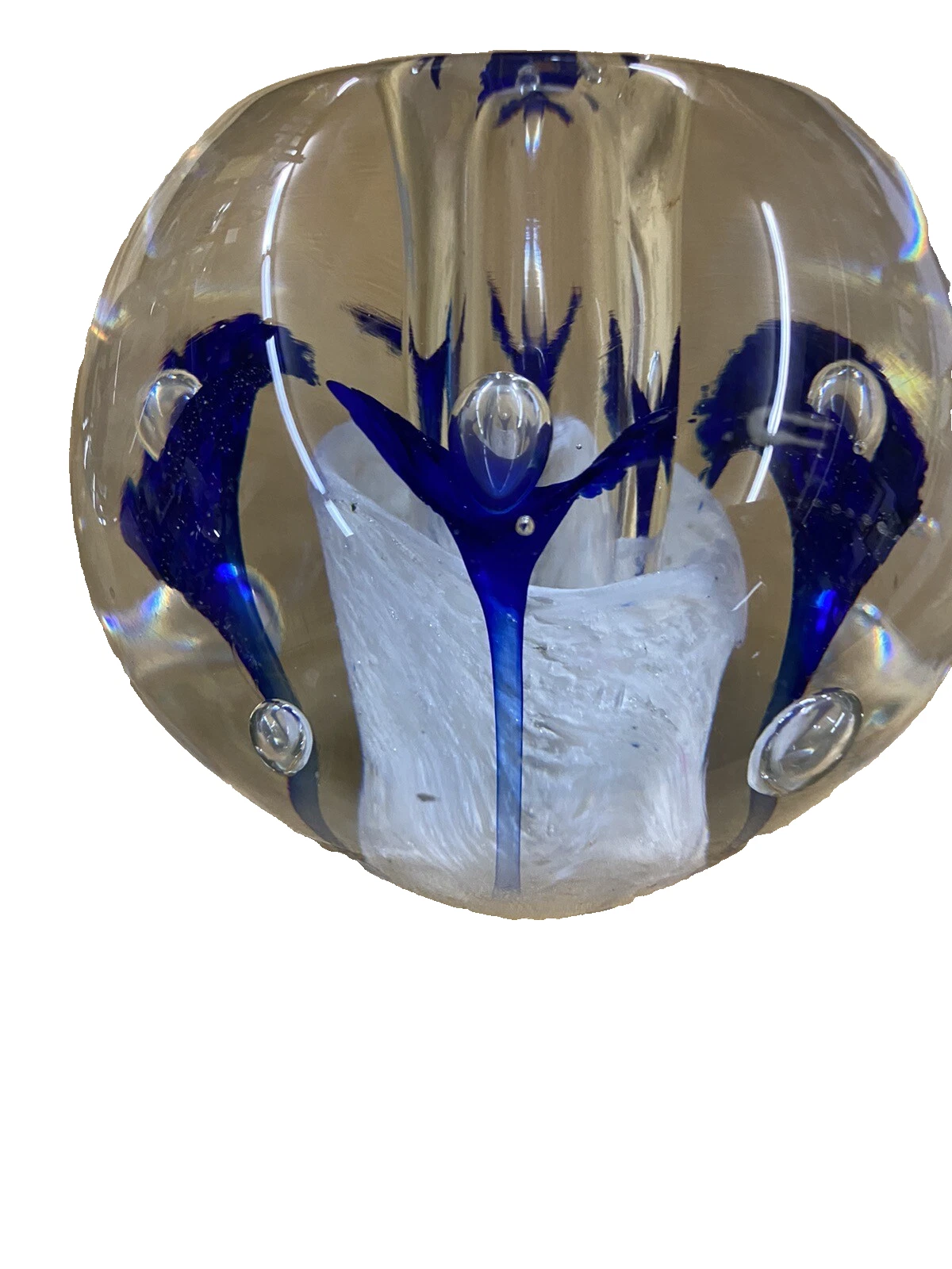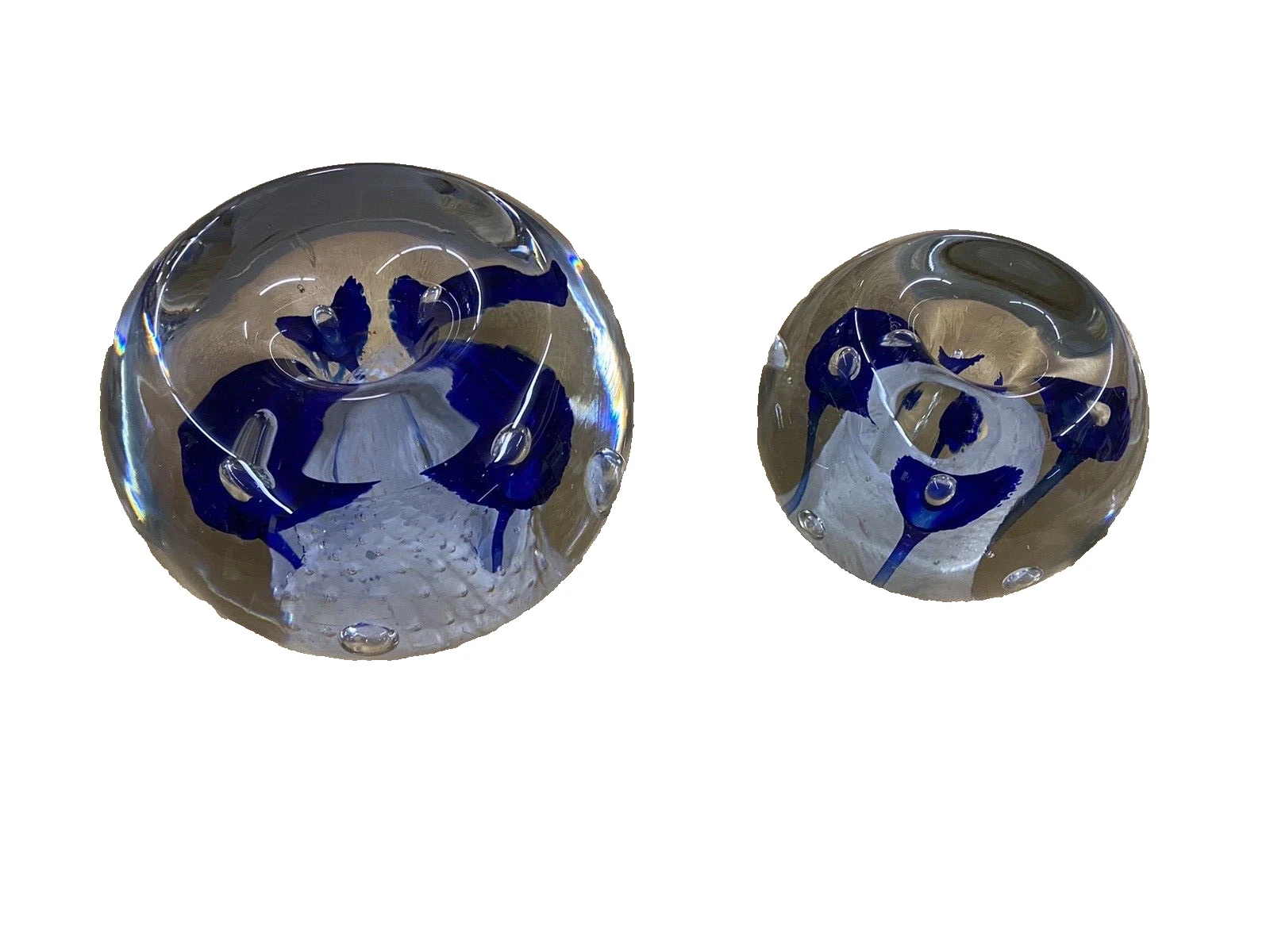 This charming pair of hand-blown glass paperweights doubles as elegant candle holders, showcasing the artistry of contemporary American craftsmanship. Each piece features a unique multicolored swirl, reflecting light in a way that adds warmth to any room. The thoughtful design includes a central hole for a candle, making them versatile for any occasion. With their distinctive character and handmade quality, these holders are sure to be cherished additions to your home decor.
