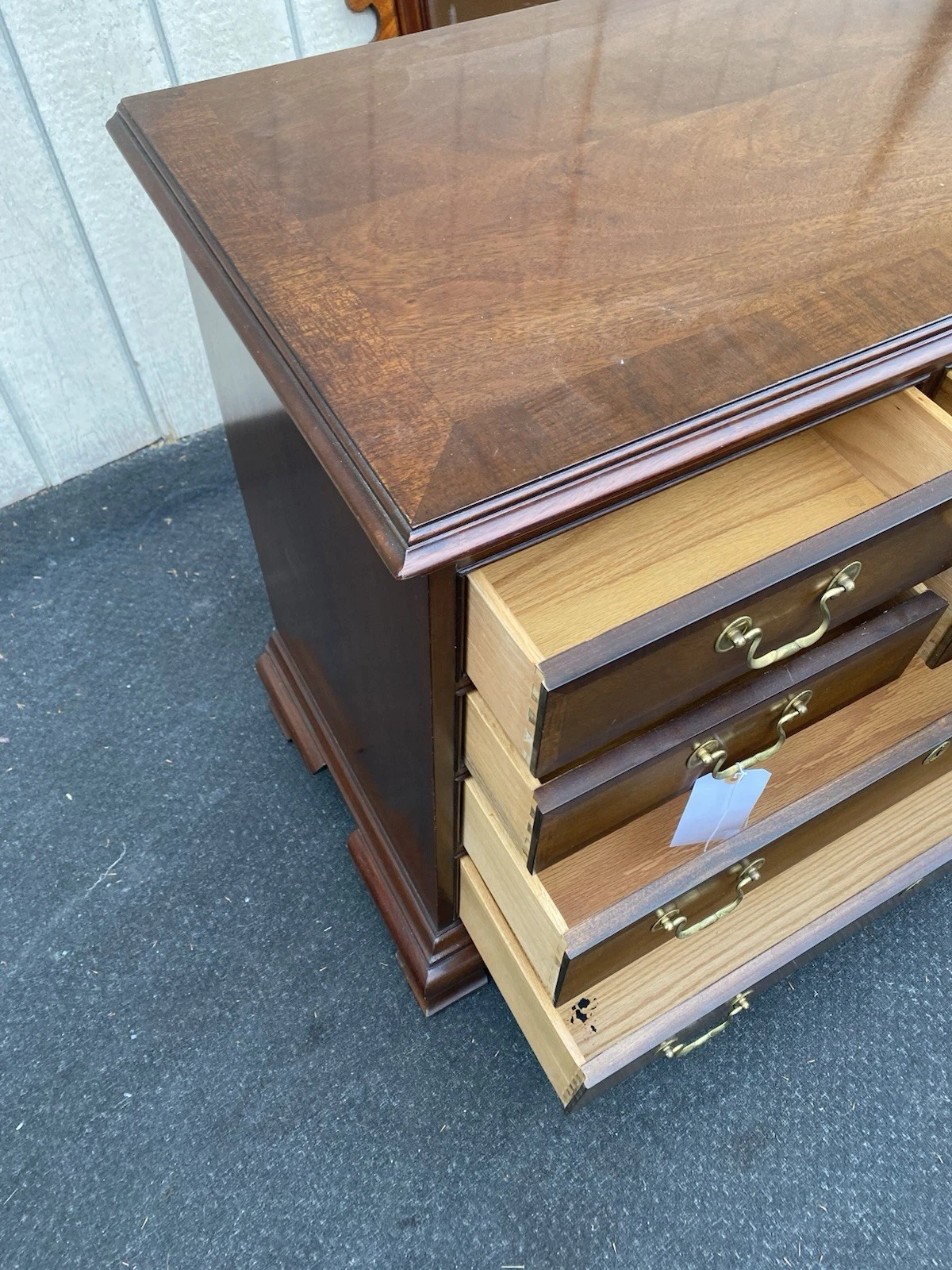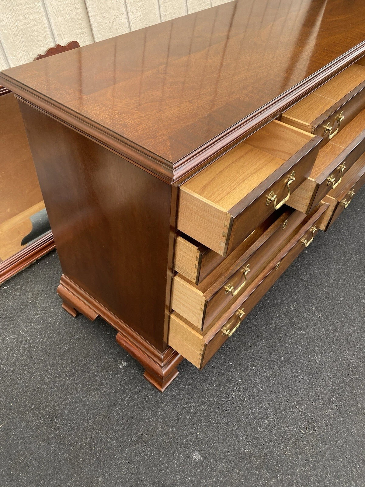 This exquisite Councill furniture dresser showcases the timeless elegance of Chippendale design, crafted from rich mahogany that radiates warmth and sophistication. With nine spacious drawers, it seamlessly blends functionality with artistry, featuring delicately carved details that reflect the skilled craftsmanship of a bygone era. The accompanying mirror enhances its charm, creating a stunning focal point for any bedroom. As a piece of American history, this dresser invites you to appreciate its beauty and functionality, making it a cherished addition to your home.