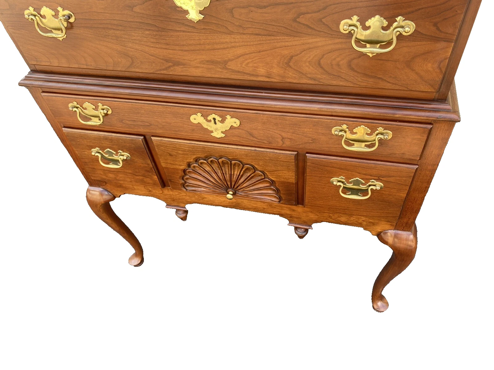 This exquisite high boy high chest by Councill Furniture showcases the timeless elegance of Queen Anne design, crafted from solid cherry wood that radiates warmth and character. With ten spacious drawers, each meticulously constructed, this piece combines functionality with craftsmanship, offering a perfect blend of form and utility. Its sturdy build and graceful lines make it a standout addition to any room, providing both storage and a touch of vintage charm that reflects the history of American woodworking. This high chest is not just furniture; it’s a testament to skilled artistry and a cherished legacy.