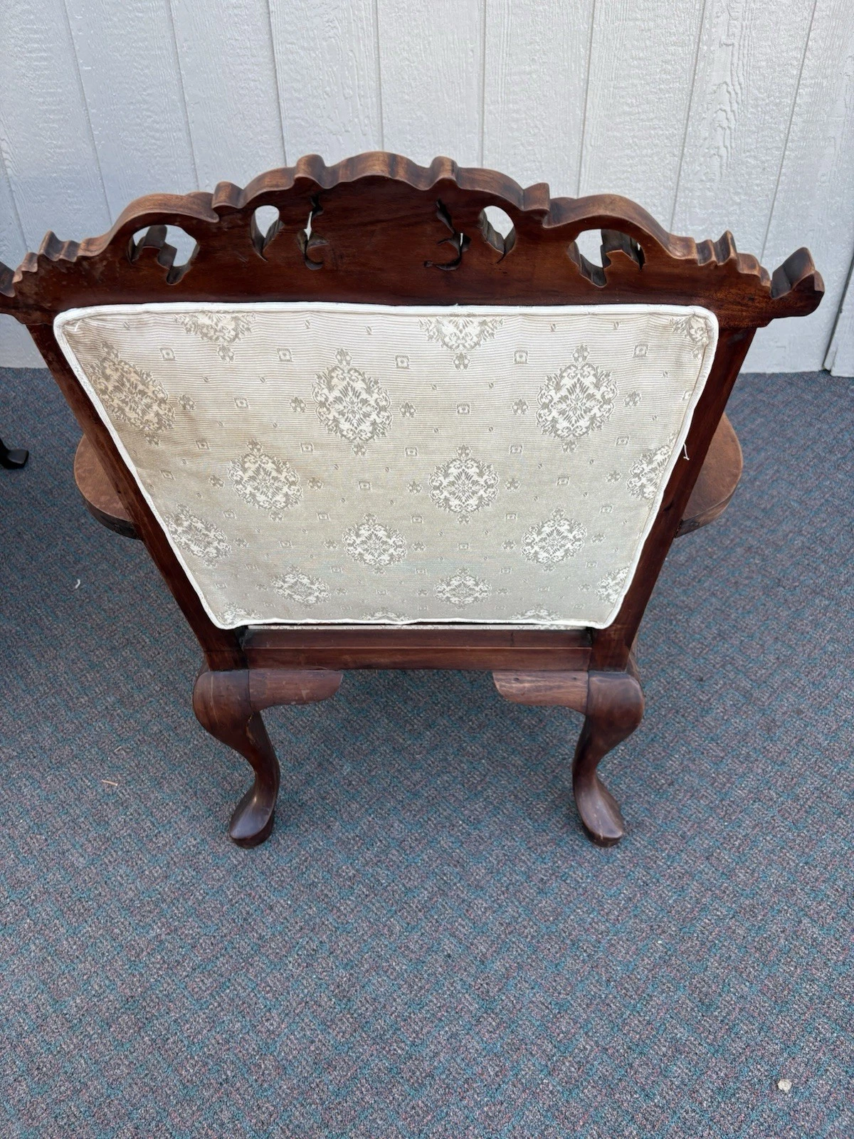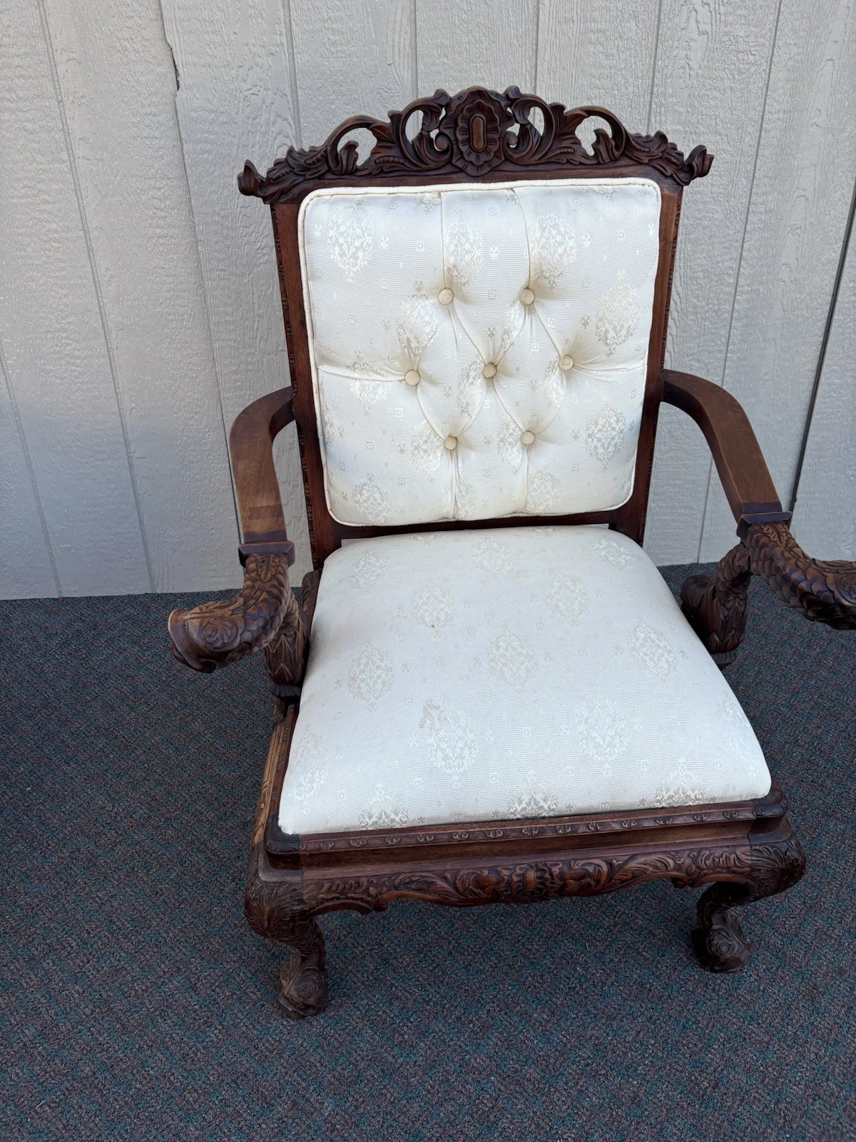 This exquisite hand-carved Chippendale armchair, crafted between 1920 and 1949, showcases the artistry of a bygone era with its intricate figural details and vibrant multicolor finish. Each curve and carving tells a story, reflecting the skill and dedication of its maker. Sturdy and in excellent condition, this unique piece not only provides a comfortable seating option but also serves as a captivating conversation starter in any room of your home, embodying the charm and character of antique craftsmanship.