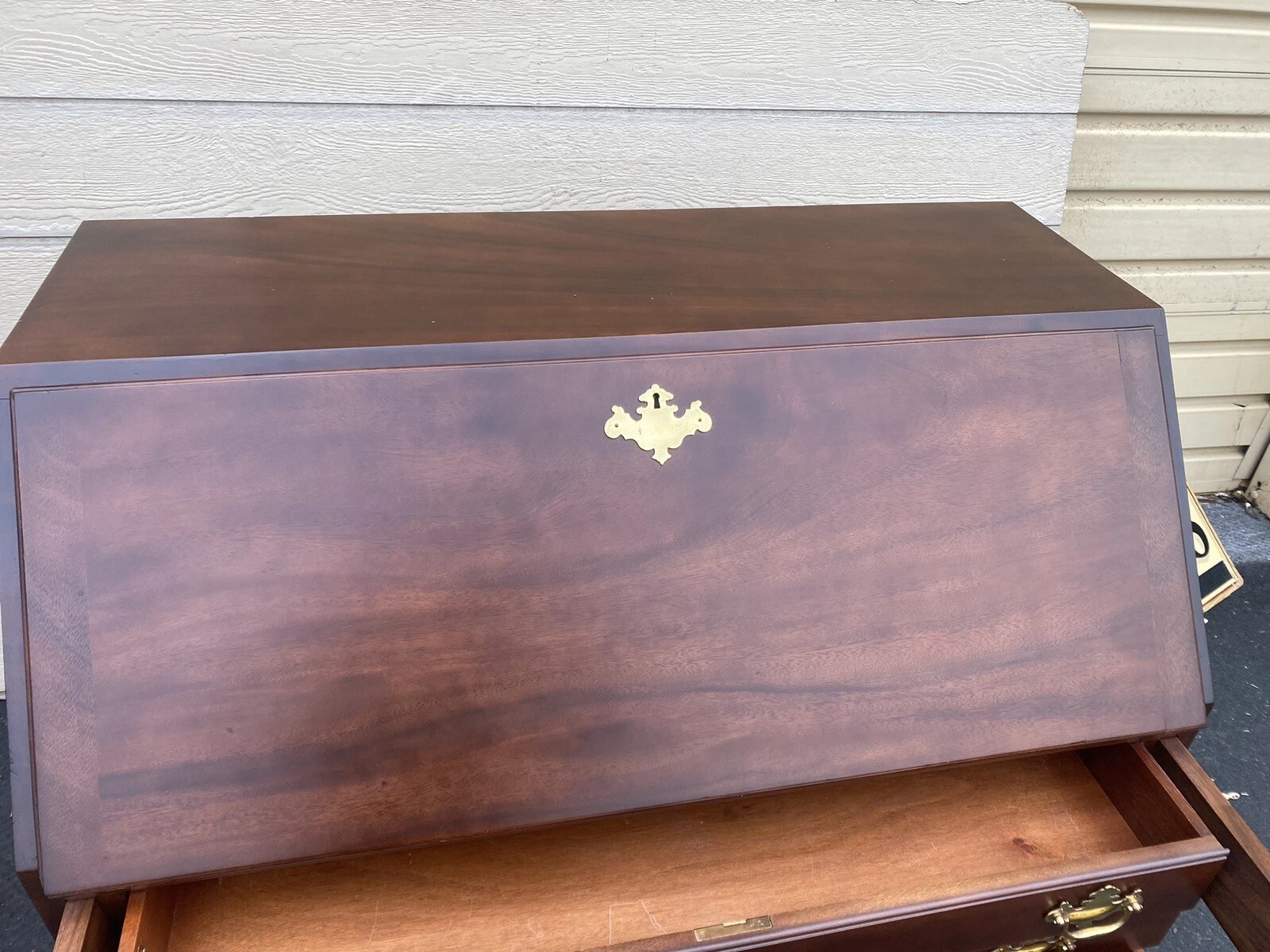 This exquisite custom hand-made slant front desk showcases the timeless elegance of Chippendale design, crafted from rich mahogany that has aged beautifully over the decades. With its graceful lines and four finely crafted drawers, it embodies both functionality and artistry, offering a delightful workspace that invites creativity. The unique character of this piece is evident in its meticulous craftsmanship, making it a wonderful addition to any home office or study that appreciates history and charm.