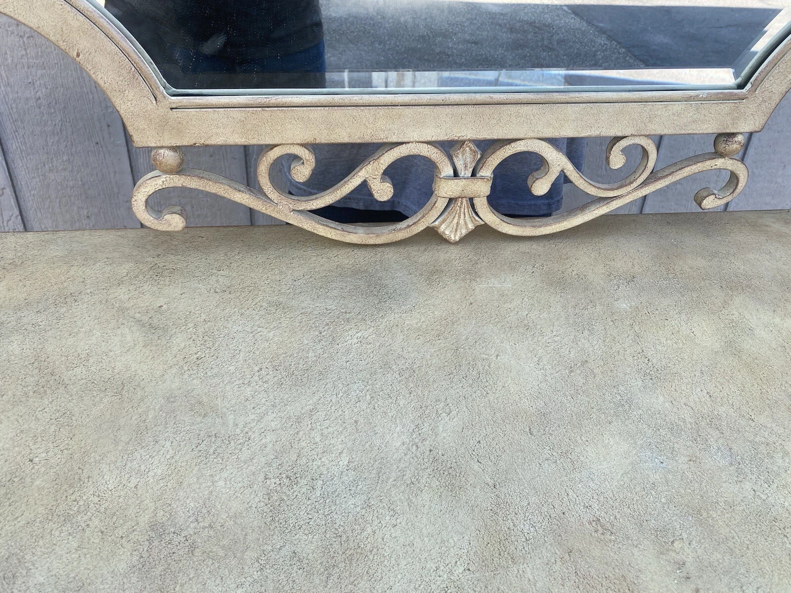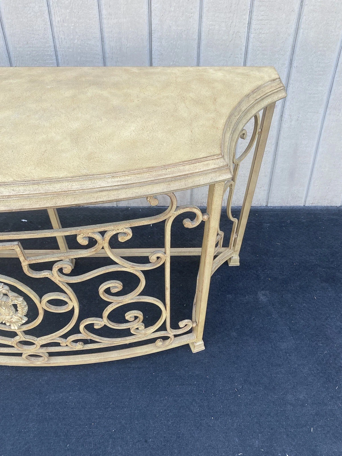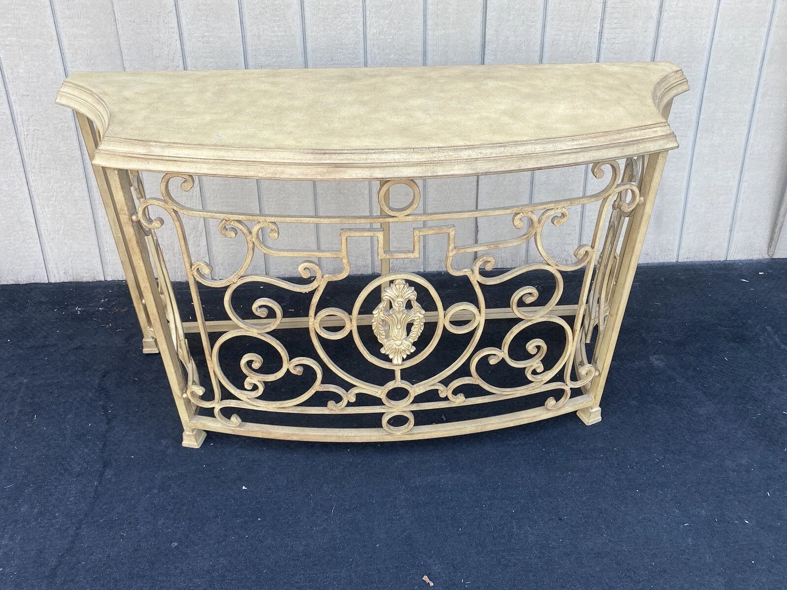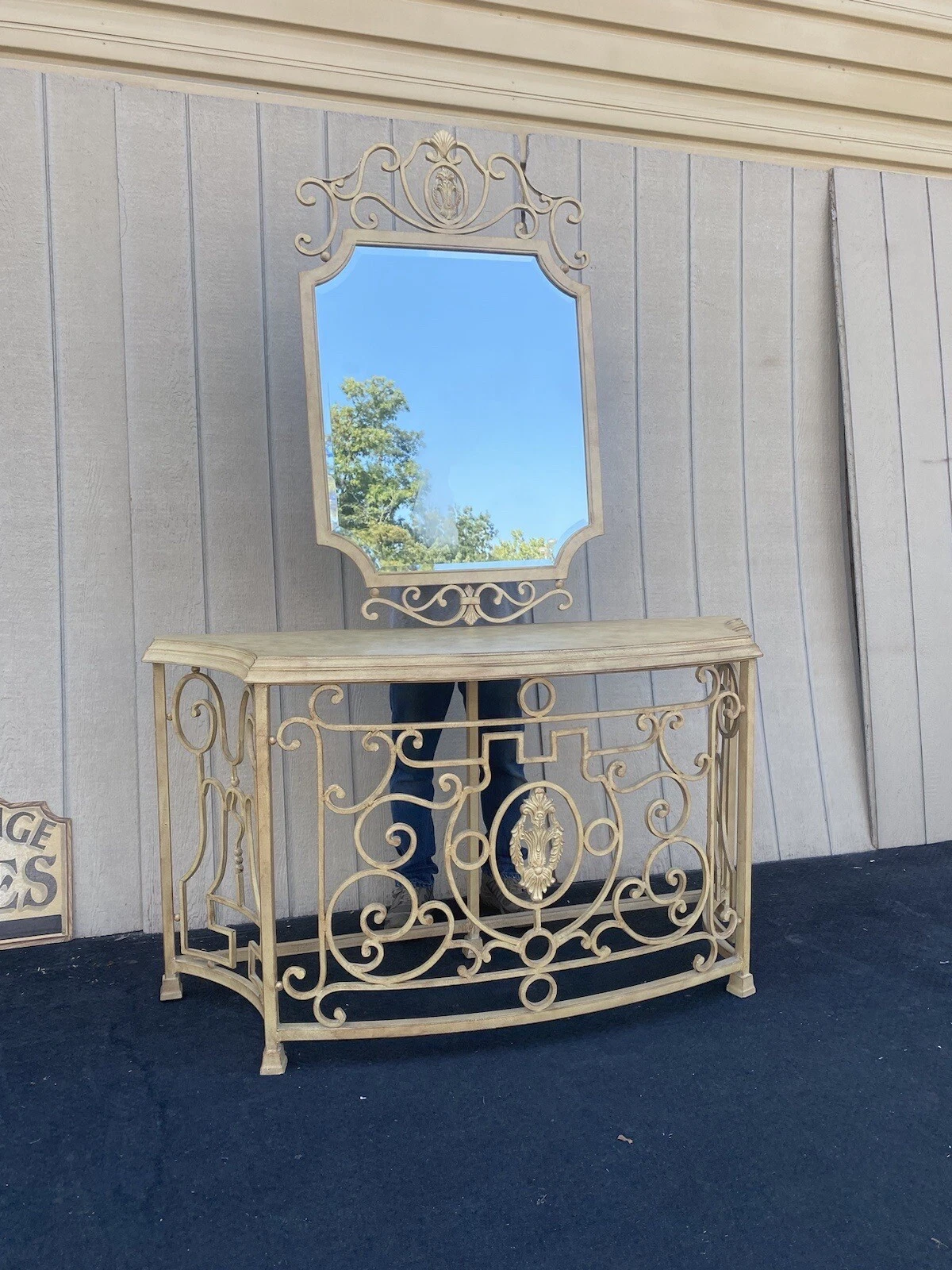 This striking decorator iron console table, complete with a matching mirror, embodies a blend of elegance and functionality that adds a unique touch to any space. Crafted with care in the United States, its sturdy iron construction showcases intricate detailing, while the multicolor finish brings a vibrant charm to your decor. Despite some gentle wear on the surface, this piece retains its character and story, making it a perfect focal point in your entryway or living room. With its timeless design, this console table invites warmth and personality into your home.