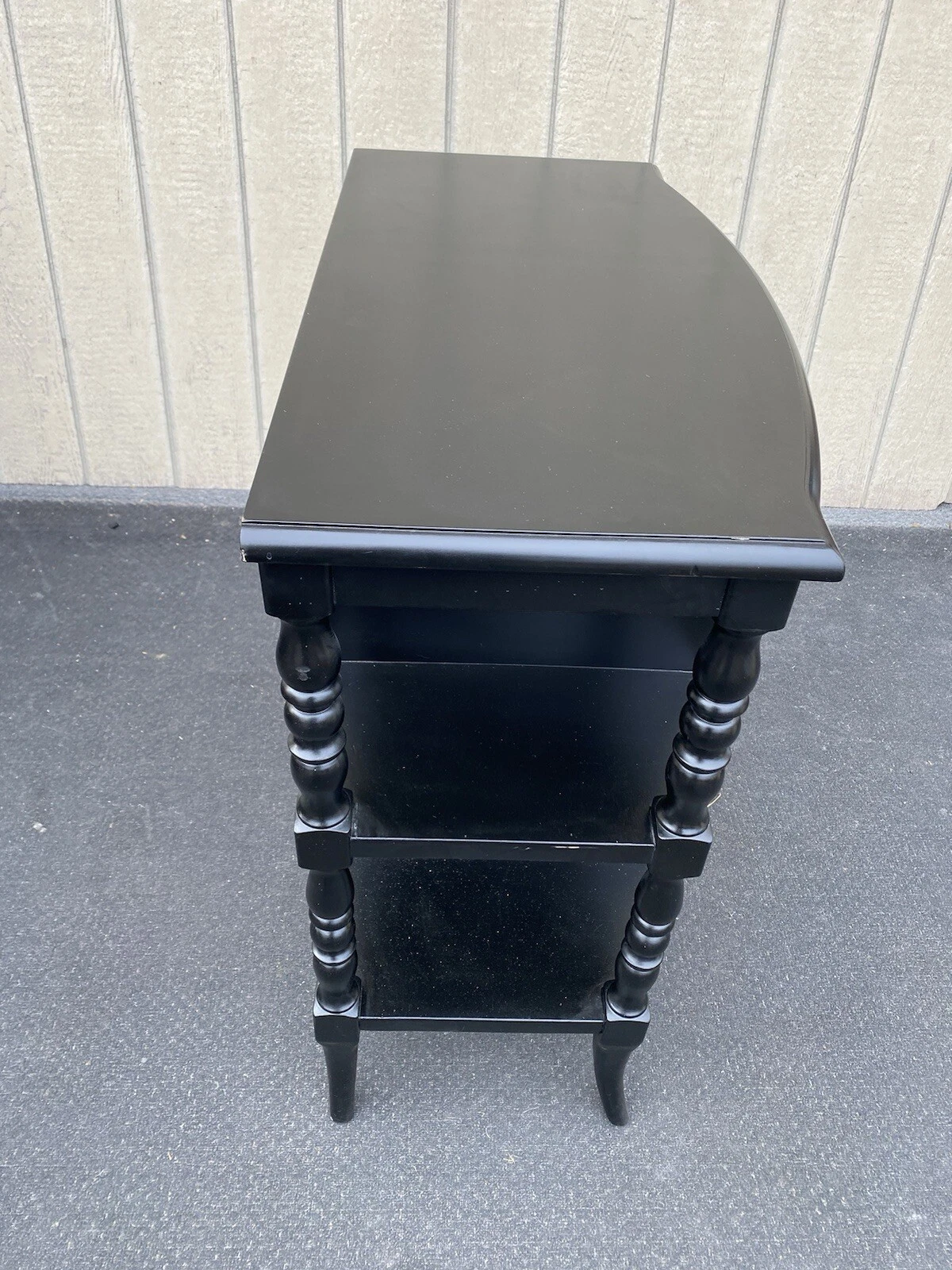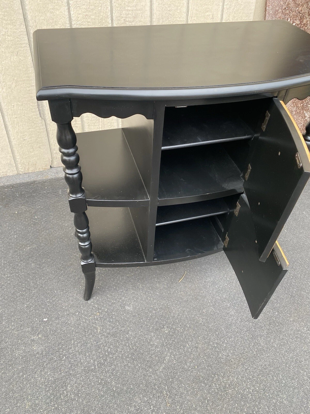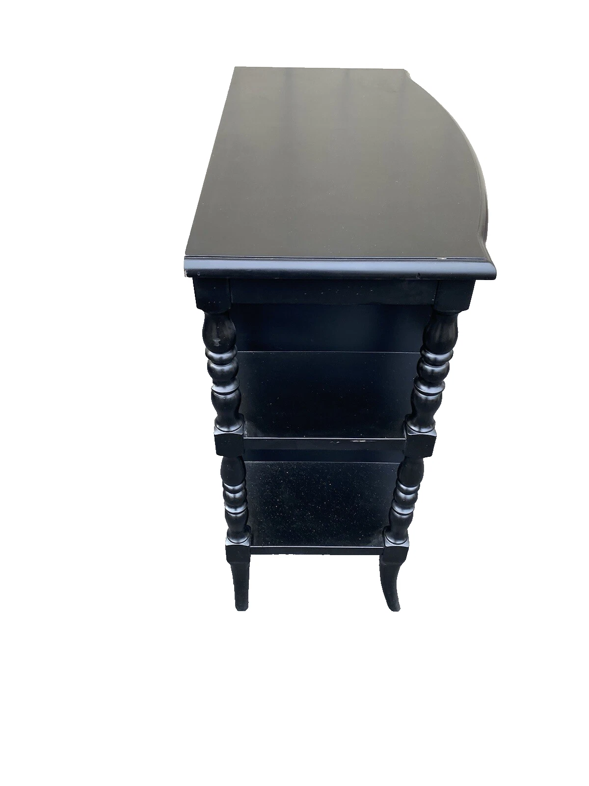 This charming ebony stenciled sideboard console table is a delightful blend of functionality and artistry, crafted with care to stand the test of time. Its three doors open to reveal ample storage, while the vibrant stenciled patterns add a unique touch that showcases the skillful craftsmanship of its era. Perfect for a decorator’s touch, this piece lends an inviting warmth to any room, reflecting the rich history of post-1950 design and the enduring quality of a family-run business like ours.