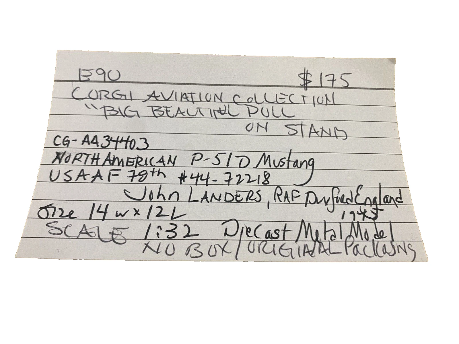 This vintage Corgi model of the North American P-51 Mustang, affectionately known as the “Big Beautiful Doll,” captures the essence of aviation history with its vibrant multi-color design and intricate craftsmanship. A stunning tribute to the iconic military aircraft, this 1:32 scale model showcases meticulous attention to detail, from its streamlined fuselage to the distinctive markings of a WWII fighter. Although one propeller is missing, this piece retains its charm and serves as a delightful conversation starter for collectors and aviation enthusiasts alike. Bring a piece of history into your home with this remarkable model that reflects a proud legacy.