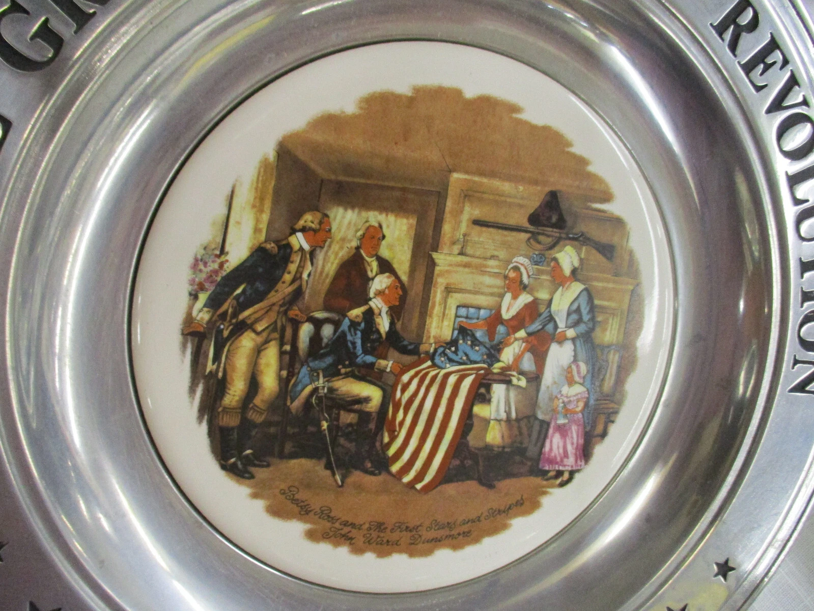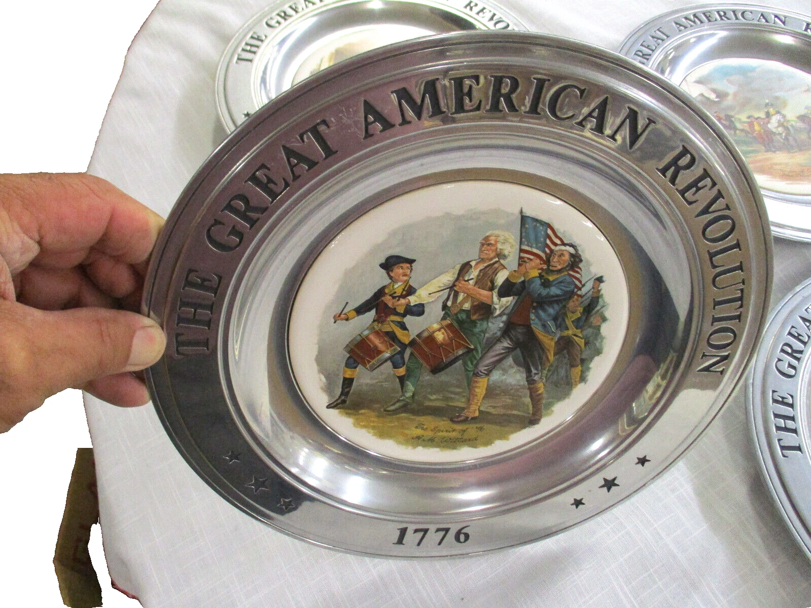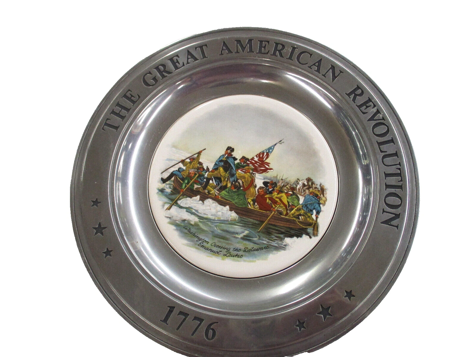 This charming collection of six porcelain plates, each beautifully framed in pewter, captures the spirit of the Great American Revolution with exquisite detail and craftsmanship. Each plate tells a story, showcasing iconic imagery that pays homage to the valor and determination of our nation’s founding. The warm, rustic pewter frames provide a lovely contrast to the delicate porcelain, making this set not just a decorative piece but also a conversation starter that bridges history and artistry. Perfect for any collector or history enthusiast, these plates embody the pride of American heritage in a truly unique way.
