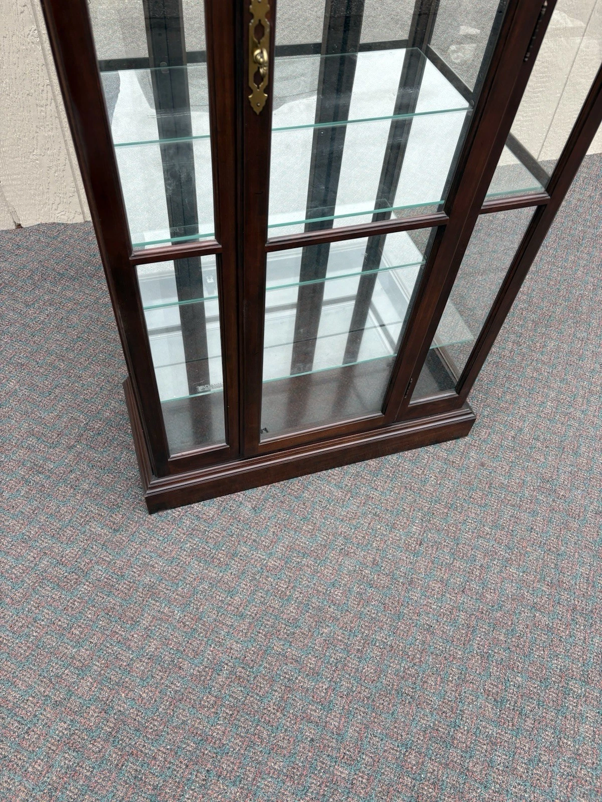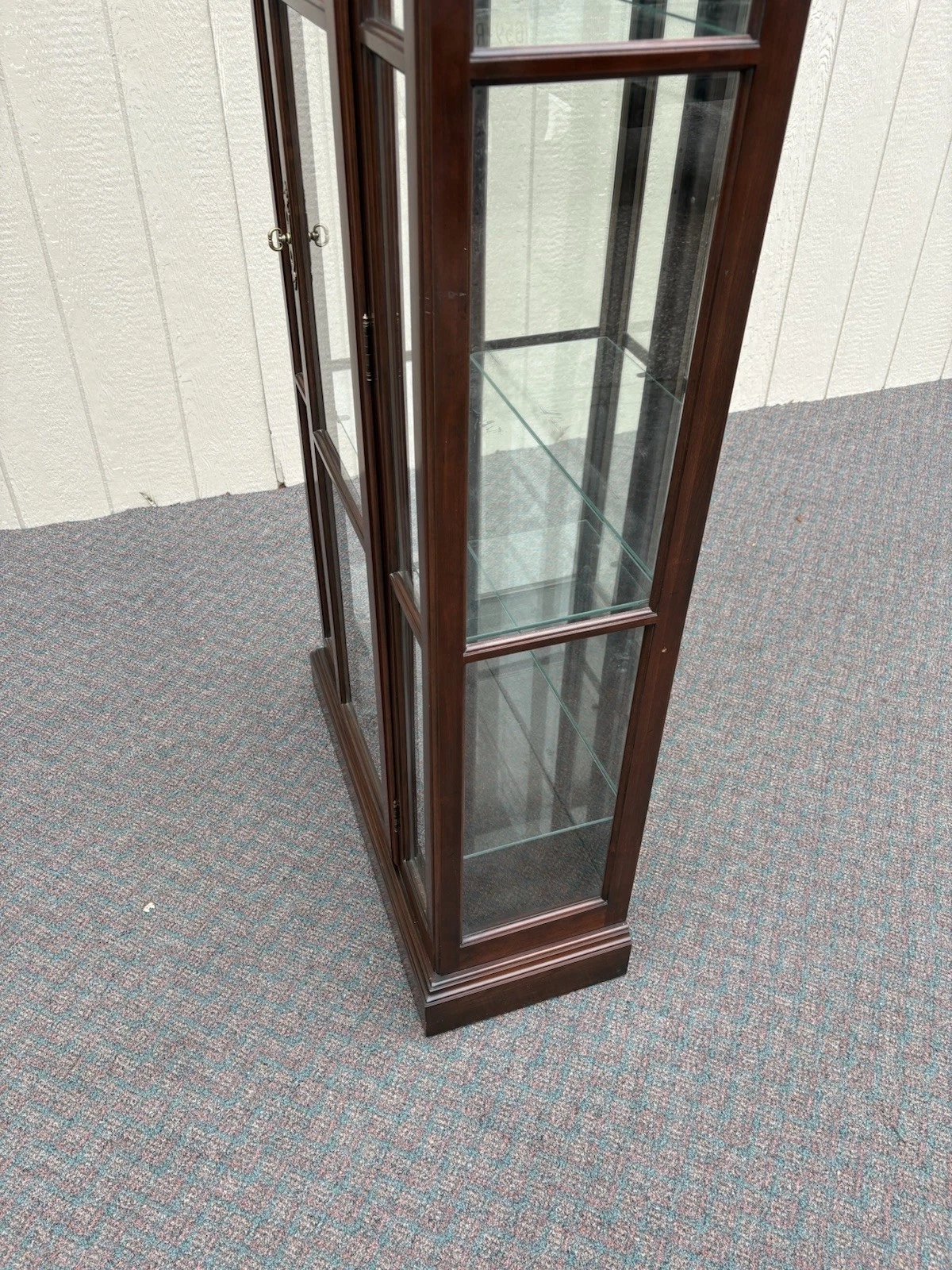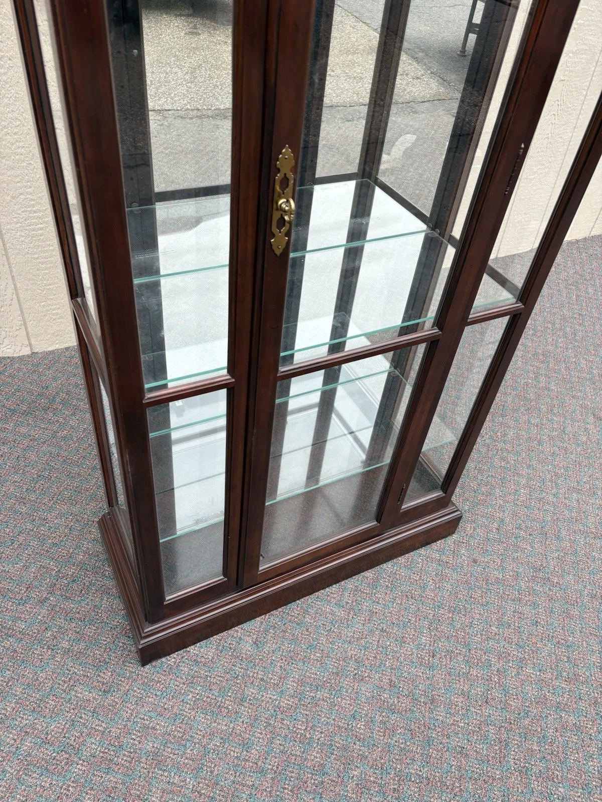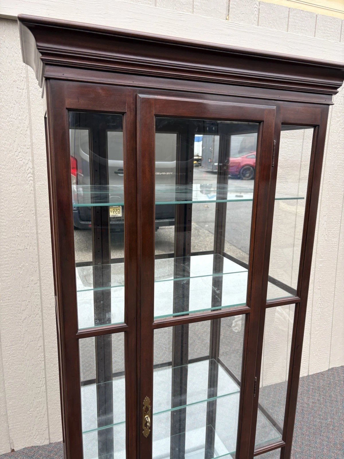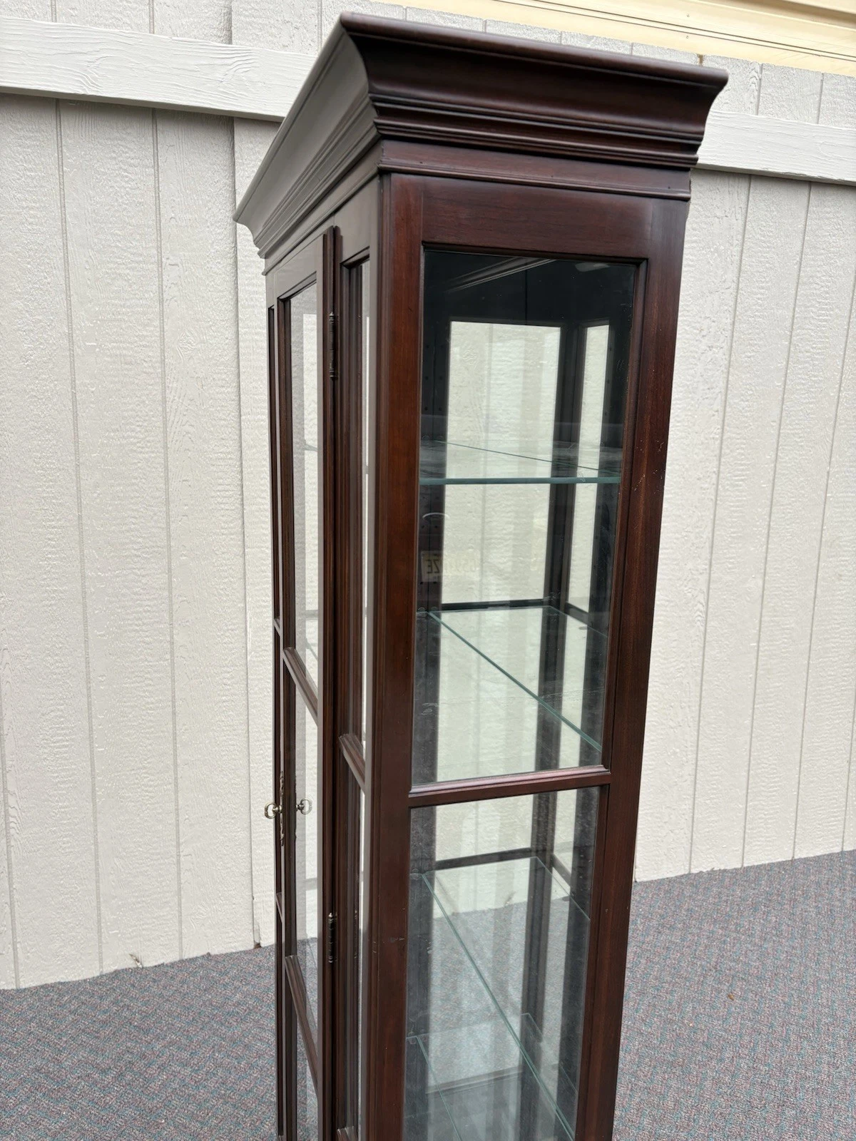 This exquisite Ethan Allen curio cabinet, crafted from rich mahogany, embodies the timeless elegance of traditional design. Featuring four beautiful glass shelves illuminated by a discreet light, it offers a perfect stage for displaying your cherished collectibles or fine china. Its single door showcases meticulous craftsmanship, making it not just a functional piece, but a conversation starter that adds character to any room. With its classic silhouette and quality materials, this cabinet is a testament to the enduring artistry of American furniture-making.