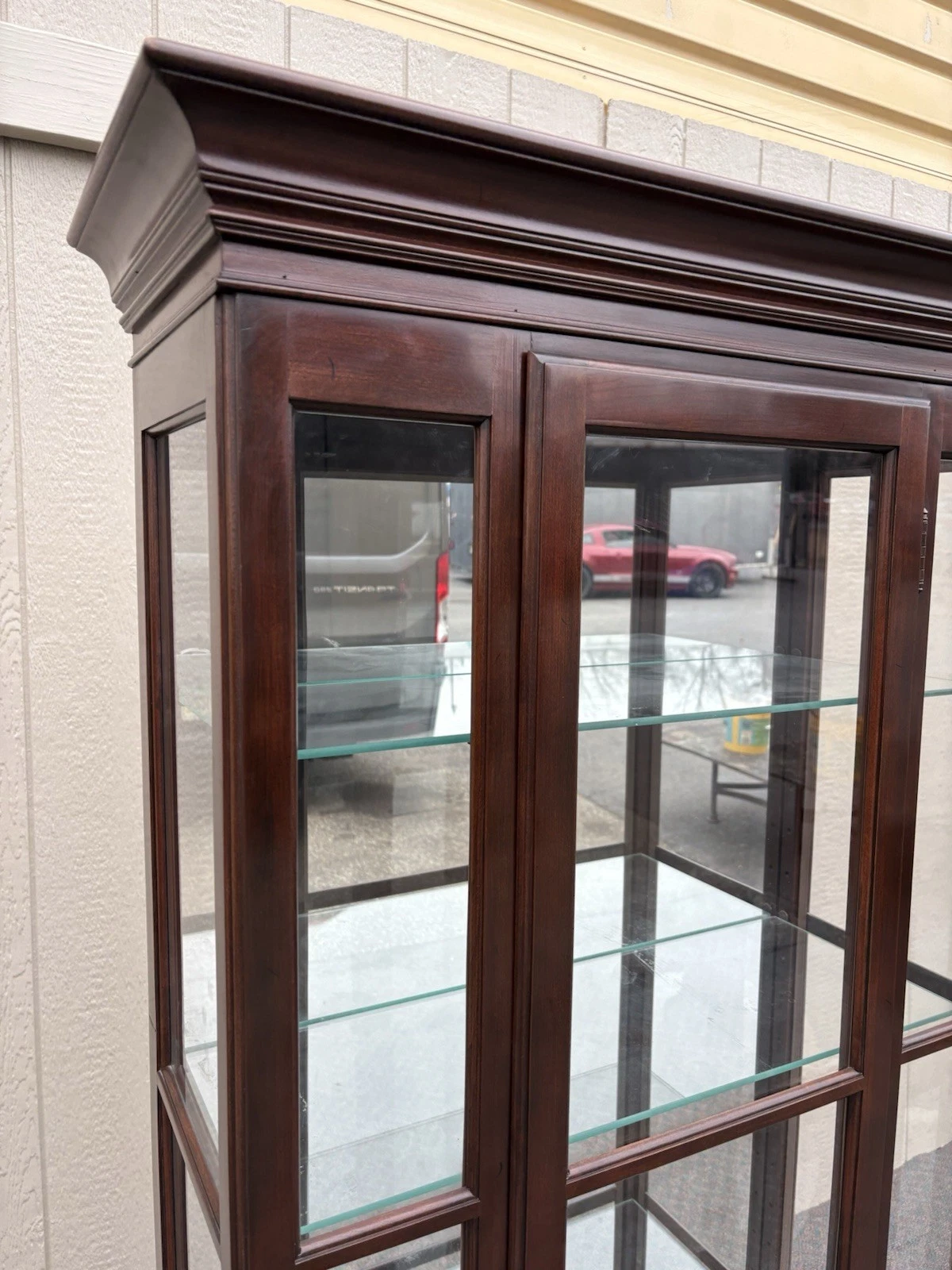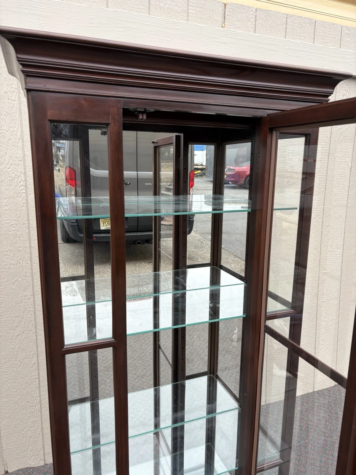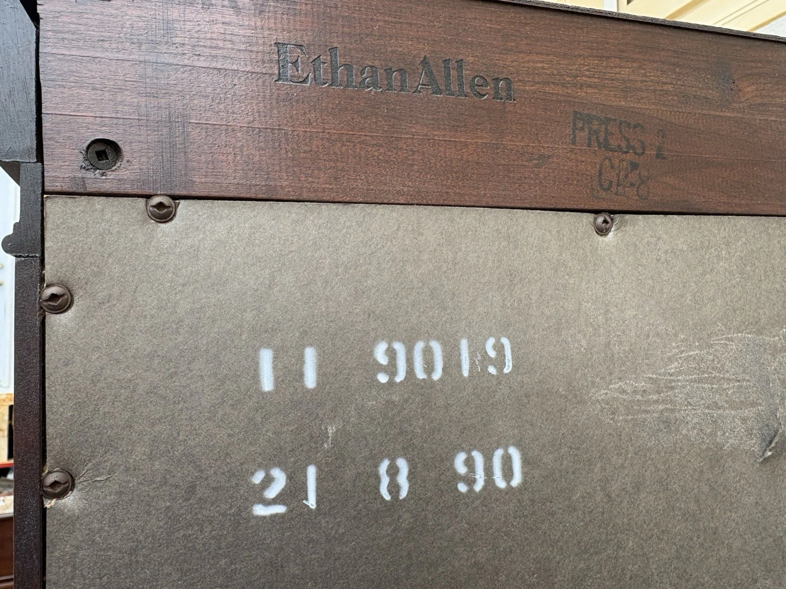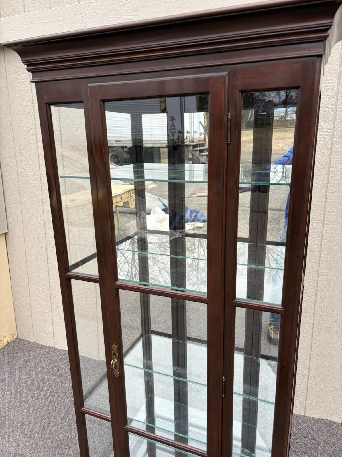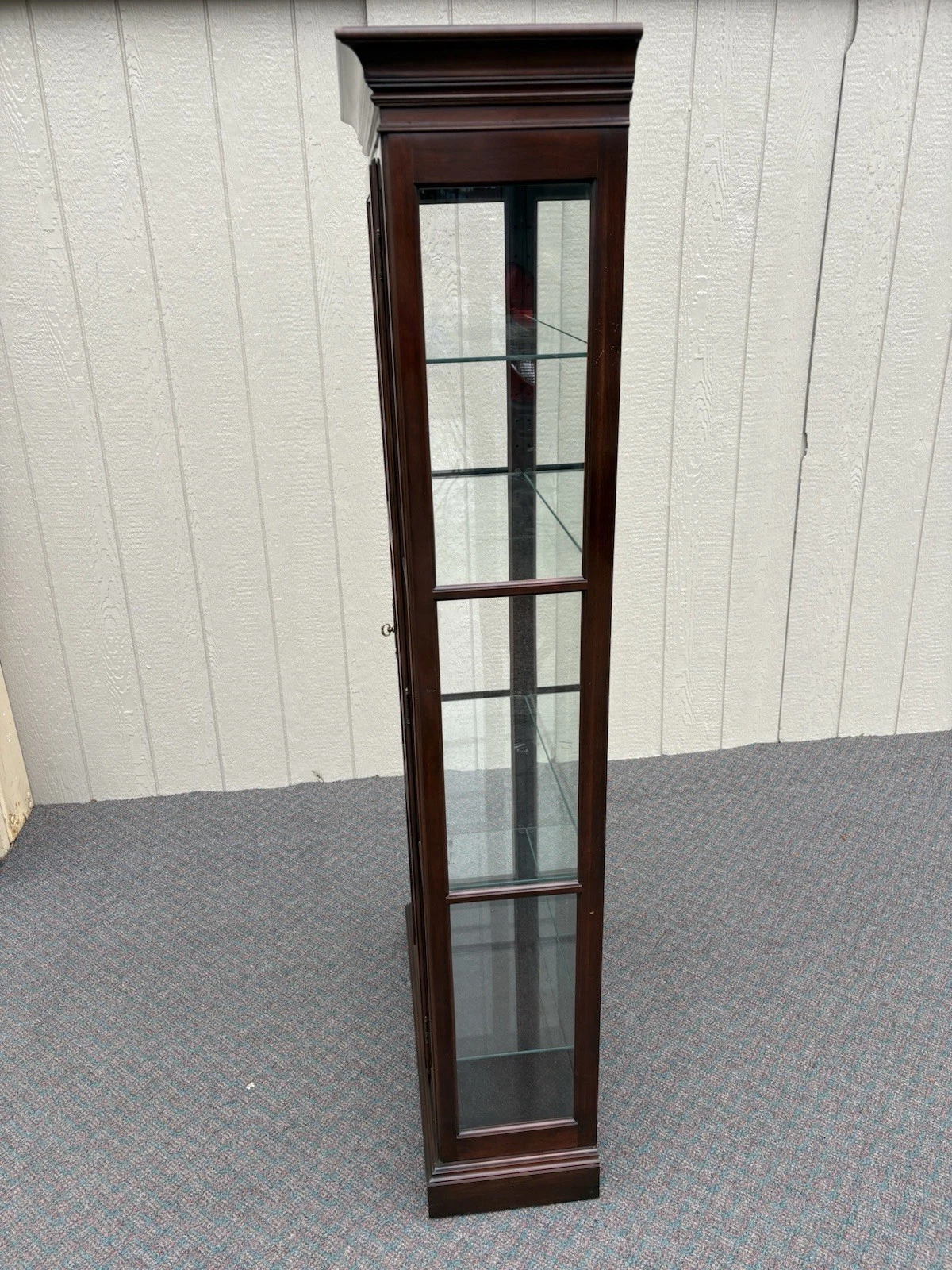This exquisite Ethan Allen curio cabinet, crafted from rich mahogany, embodies the timeless elegance of traditional design. Featuring four beautiful glass shelves illuminated by a discreet light, it offers a perfect stage for displaying your cherished collectibles or fine china. Its single door showcases meticulous craftsmanship, making it not just a functional piece, but a conversation starter that adds character to any room. With its classic silhouette and quality materials, this cabinet is a testament to the enduring artistry of American furniture-making.